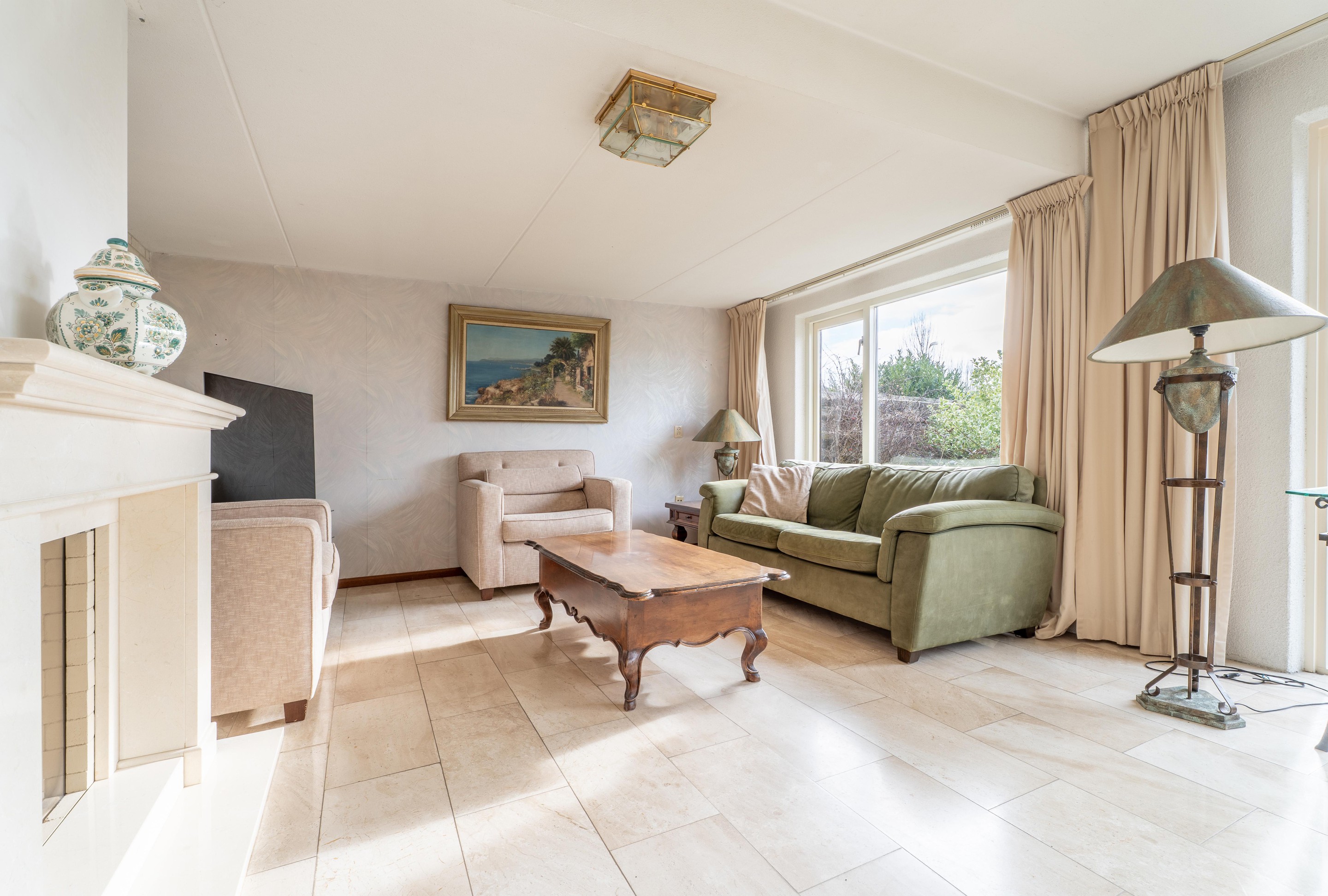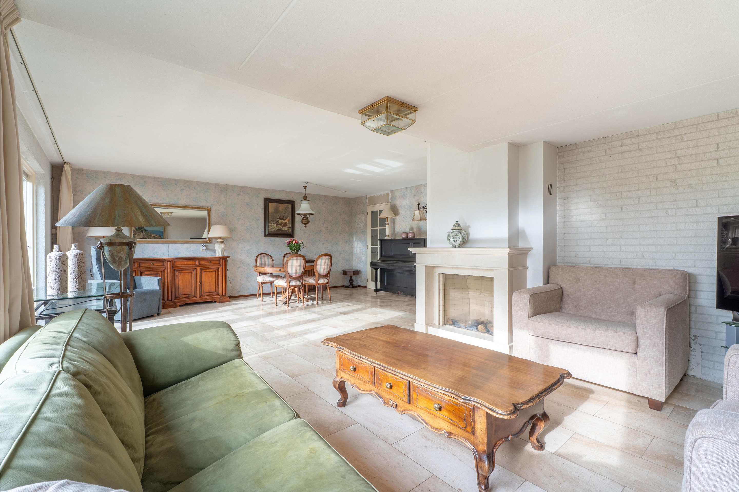 Eenmaal in de woonkamer word je direct verrast door de royale ruimte en de prettige lichtinval. De aanwezigheid van een sfeervolle gashaard zorgt voor extra warmte en gezelligheid.