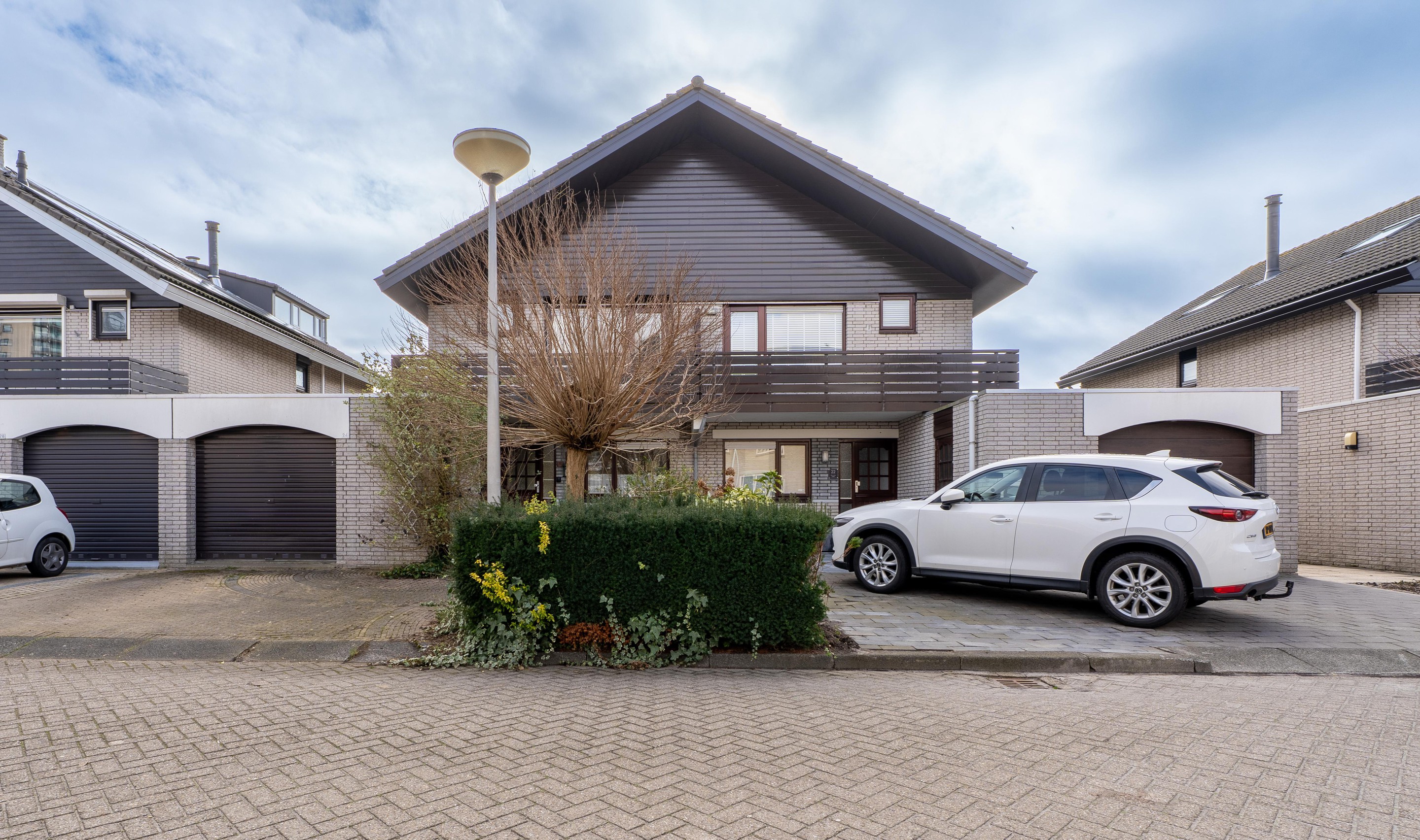 Via de oprit en de verzorgde voortuin bereik je de entree van de woning, wat zorgt voor een prettige en praktische binnenkomst.