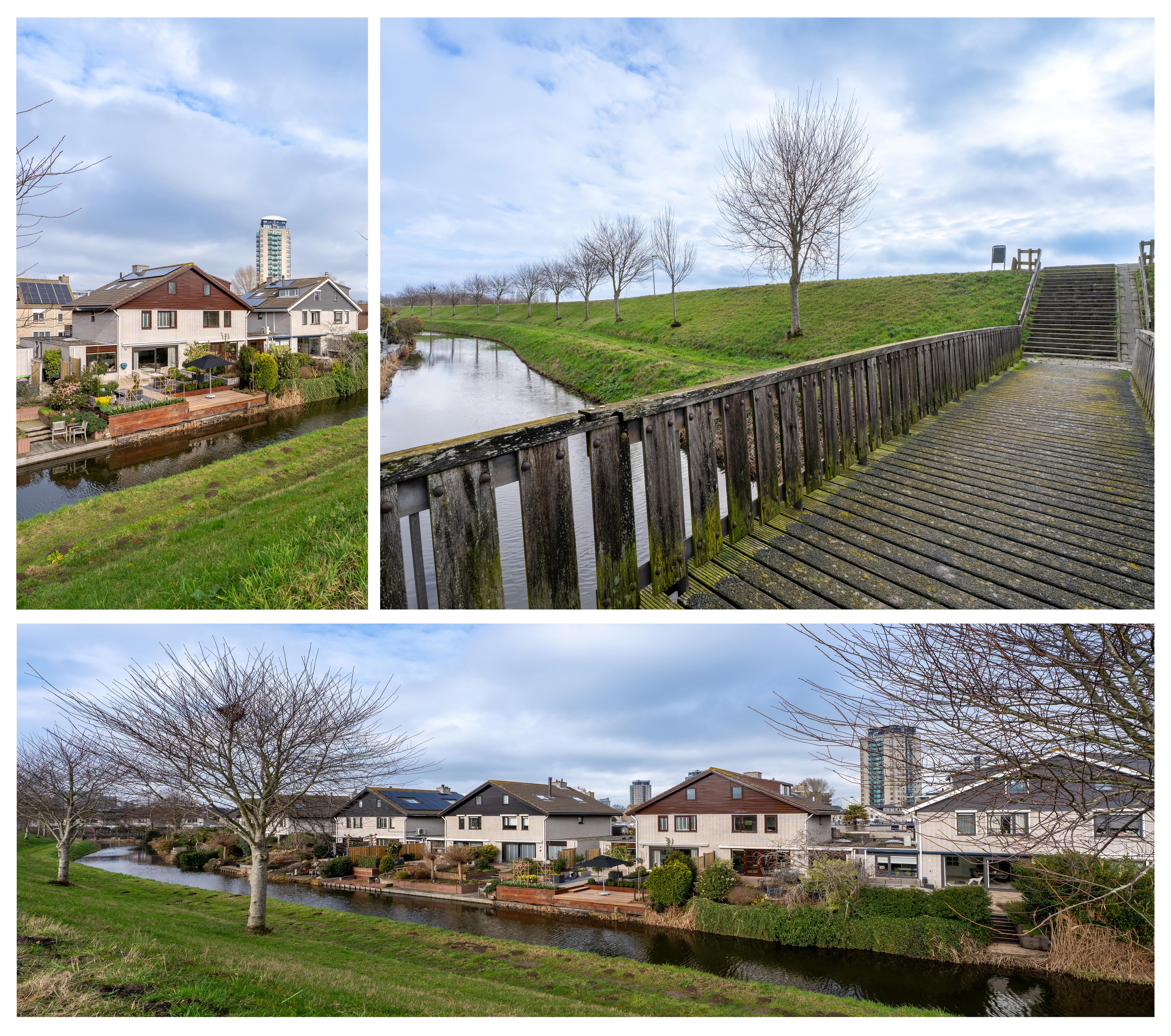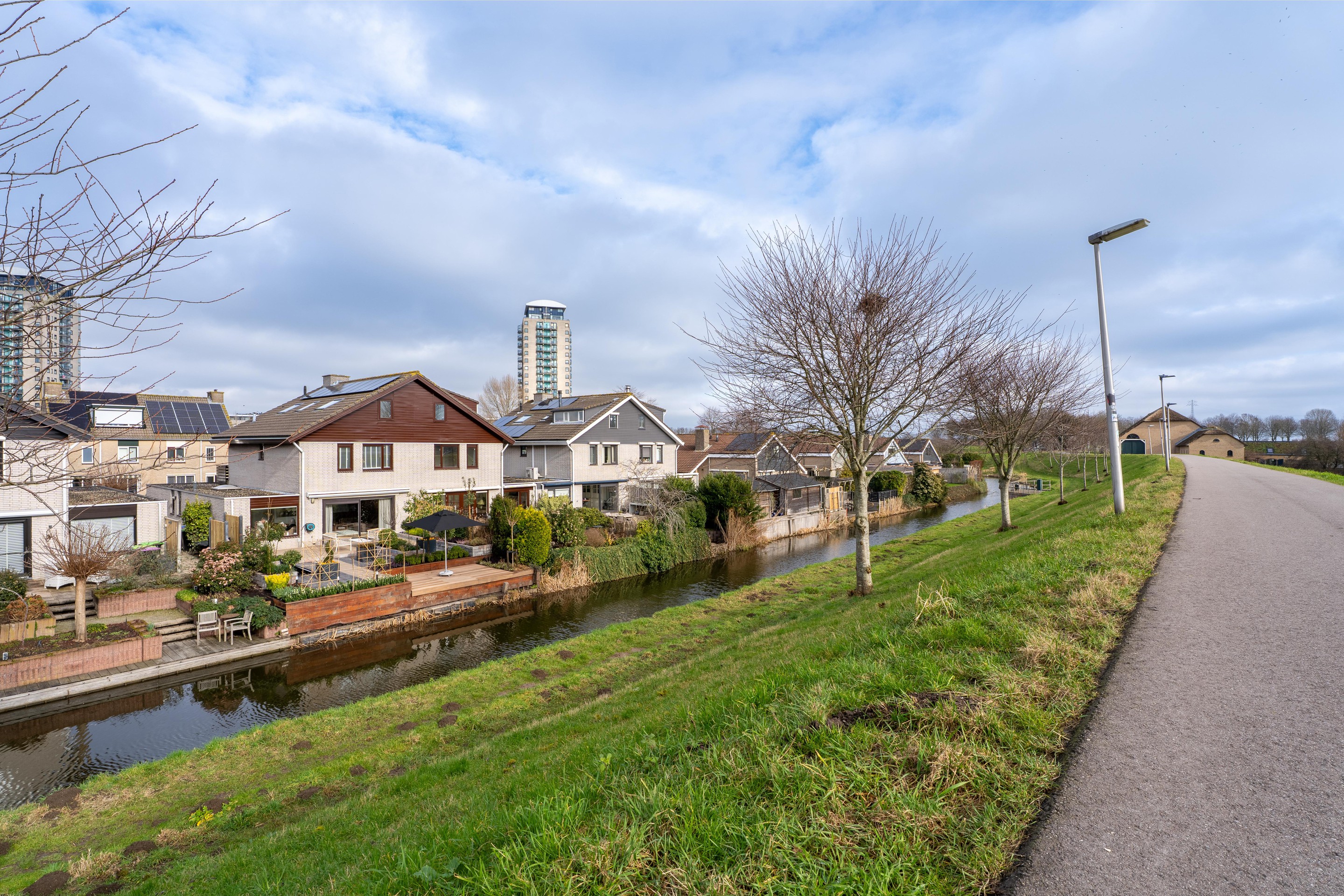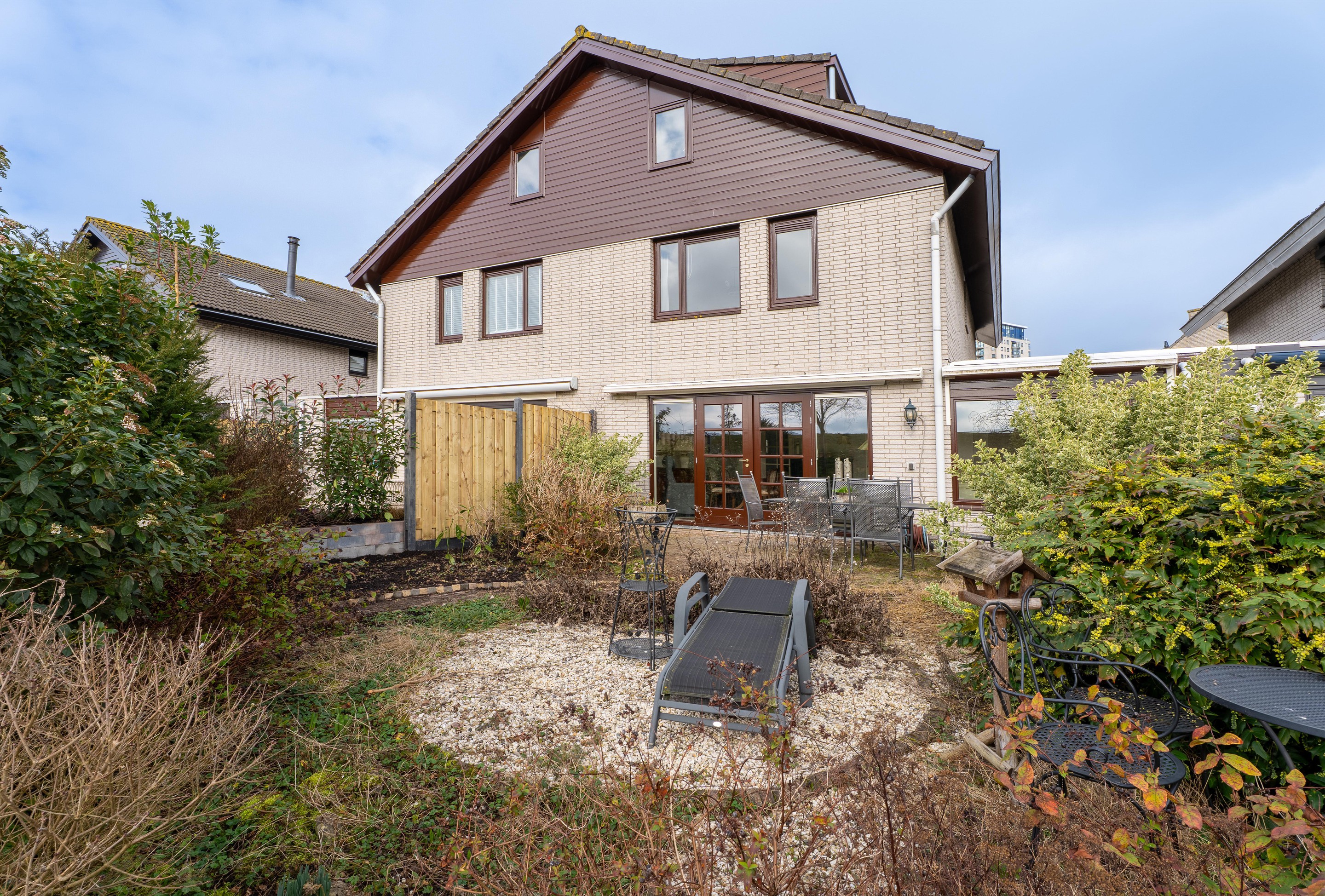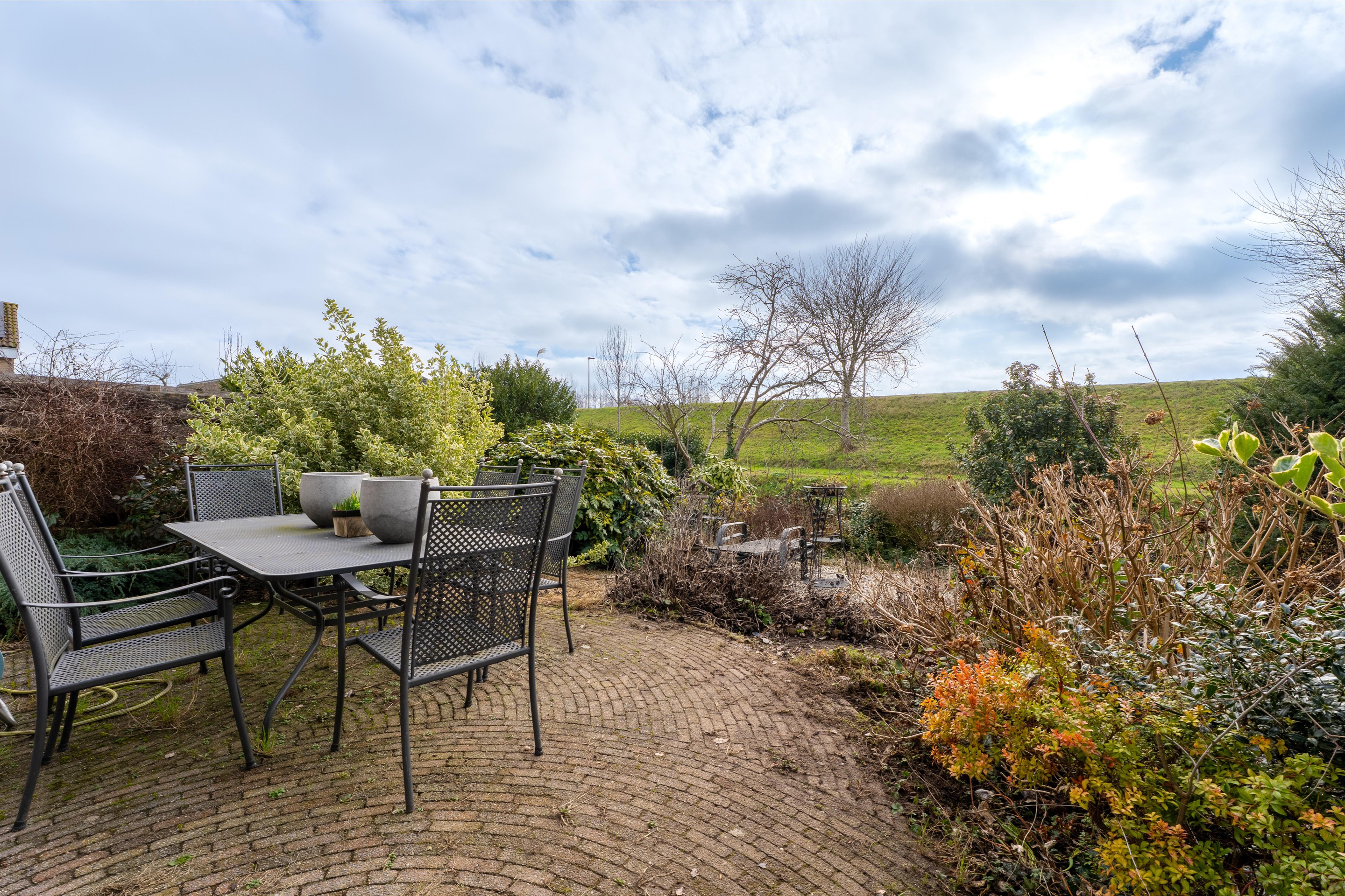 De openslaande pui in de woonkamer biedt directe toegang tot de zonnige achtertuin op het zuiden. Dankzij de vrije ligging aan de dijk geniet je hier van volop rust en privacy, een heerlijke plek om ongestoord buiten te zijn.