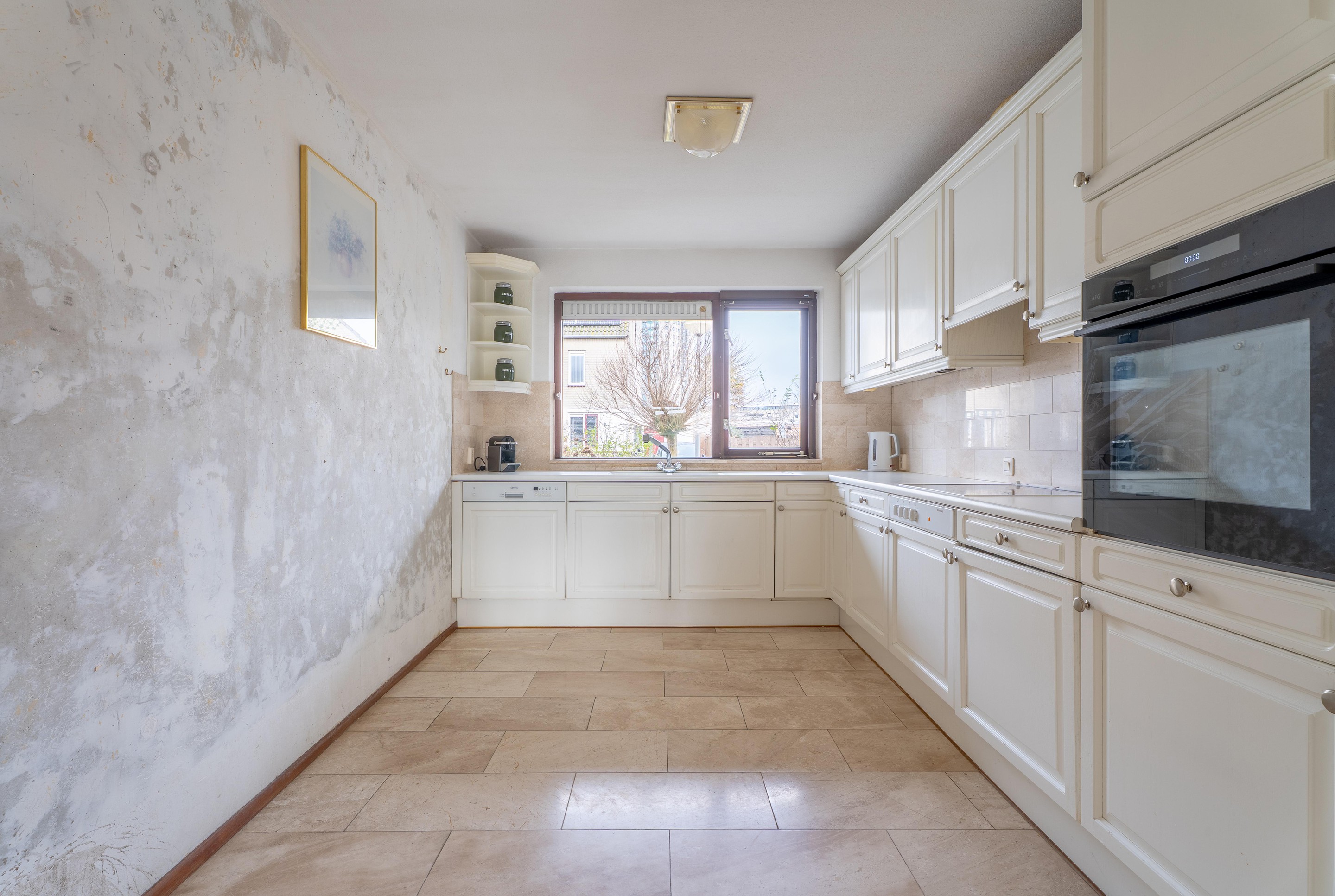 Terug in de woning bevindt zich aan de voorzijde de gesloten keuken. Deze is praktisch ingericht en voorzien van diverse inbouwapparatuur, waaronder een koelkast, combi-oven, 4-pits keramische kookplaat en een vaatwasser.
