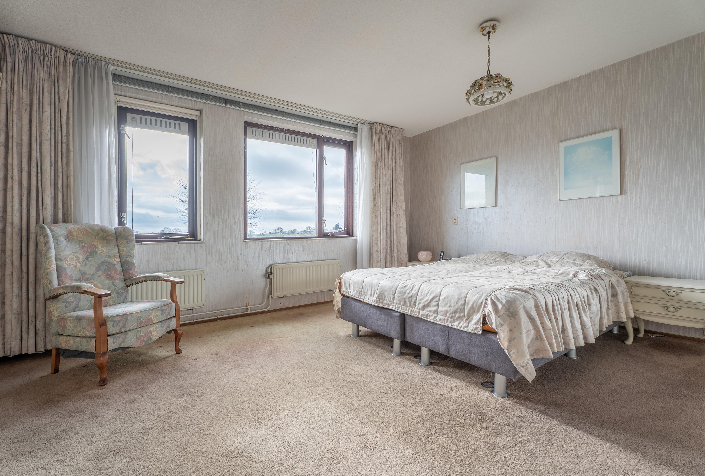 De master bedroom (voorheen twee slaapkamers) is gelegen aan de achterzijde van de woning en biedt een fraai uitzicht over de dijk.