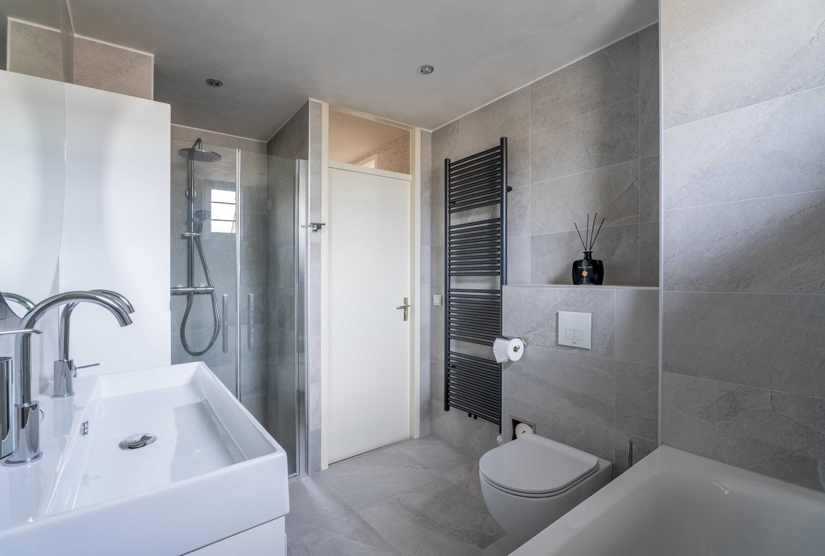 De moderne badkamer is in 2022 volledig gemoderniseerd, is volledig betegeld en van alle gemakken voorzien. Je beschikt hier over een ruime inloopdouche, een ligbad, een hangend toilet en een wastafel met meubel, wat zorgt voor comfort en een luxe uitstraling.