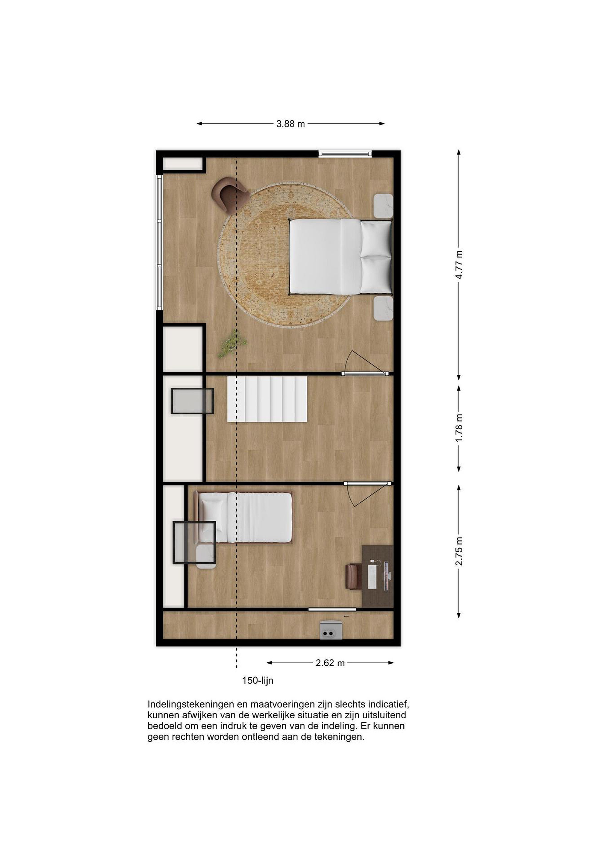 - Slaapkamer 3 is circa 275 cm x 262 cm (tot 150-lijn)