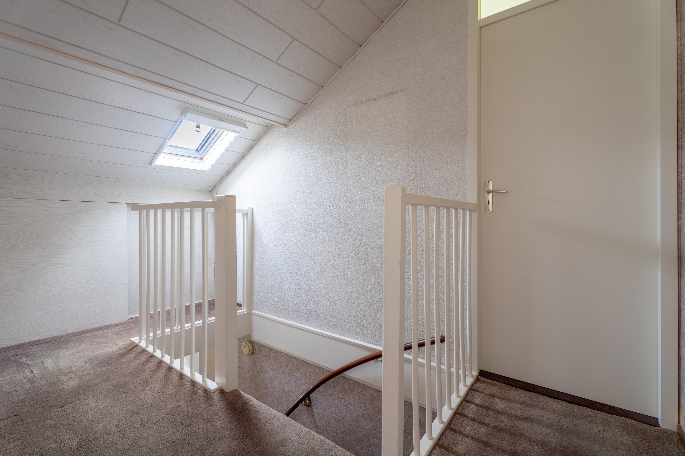 Via de trapopgang bereik je de tweede verdieping welke is verdeeld in twee ruime zolderkamers en de overloop.