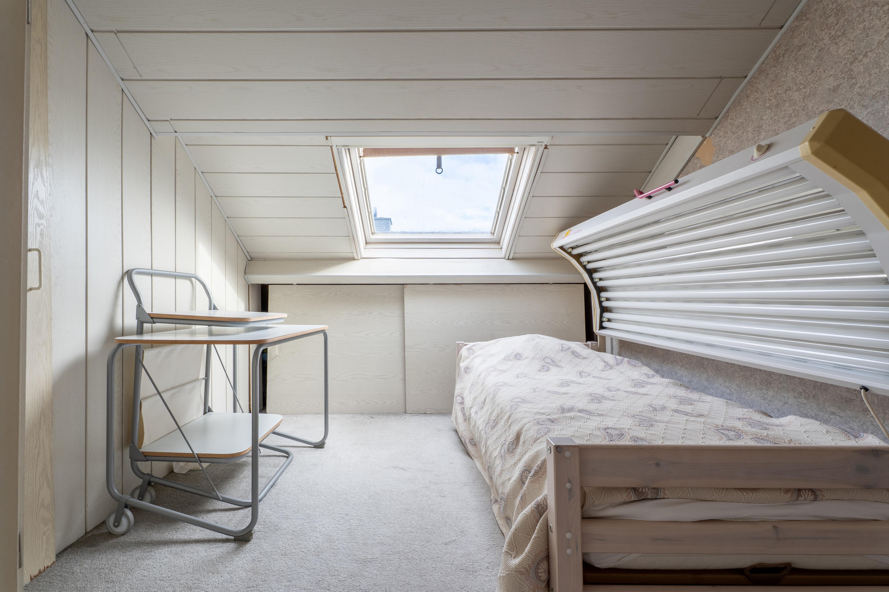 De slaapkamer aan de achterzijde is voorzien van een dakkapel, wat zorgt voor extra ruimte en licht. Daarnaast zijn hier bergschotten aanwezig, ideaal voor het creëren van extra opbergruimte.