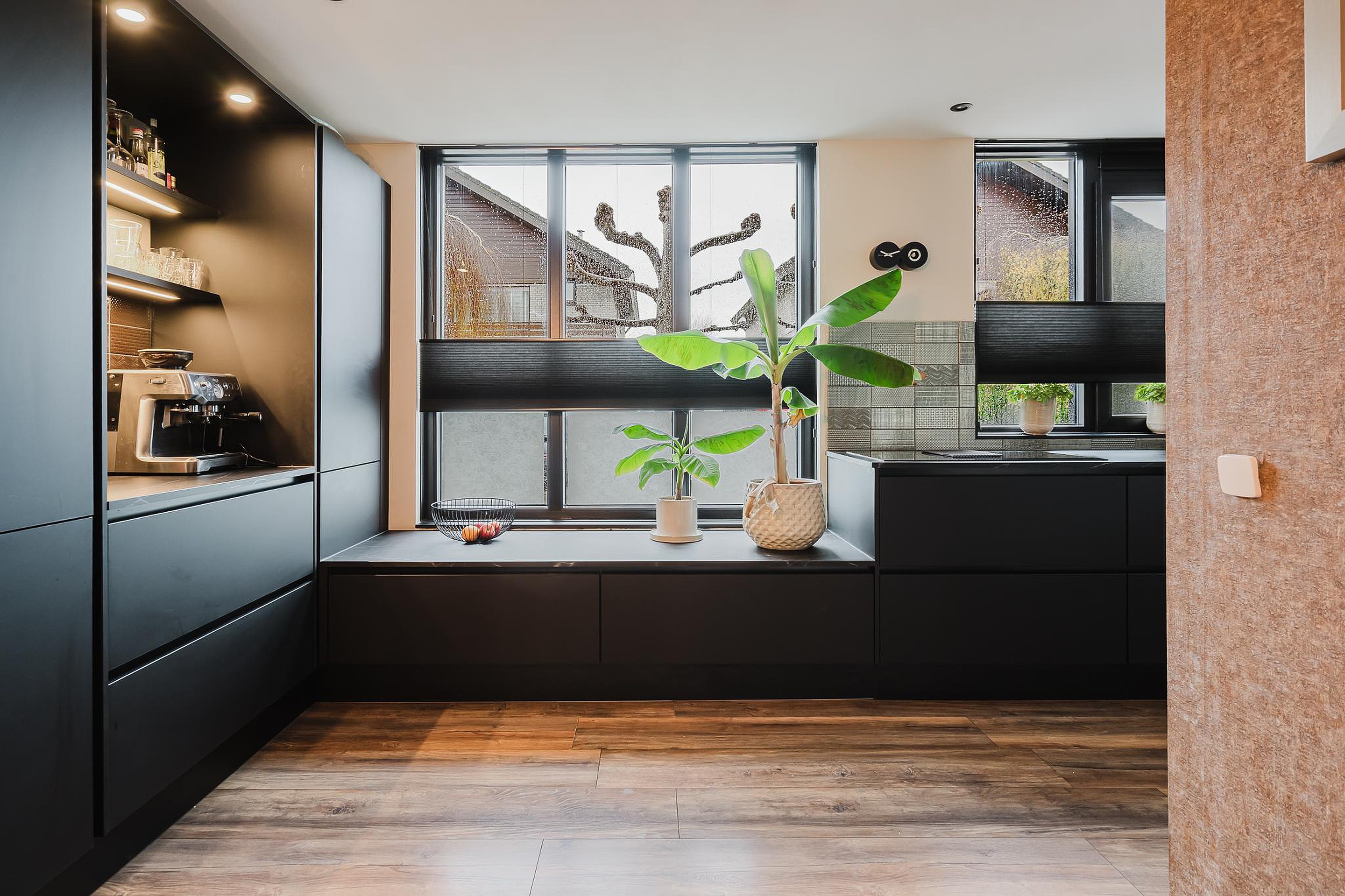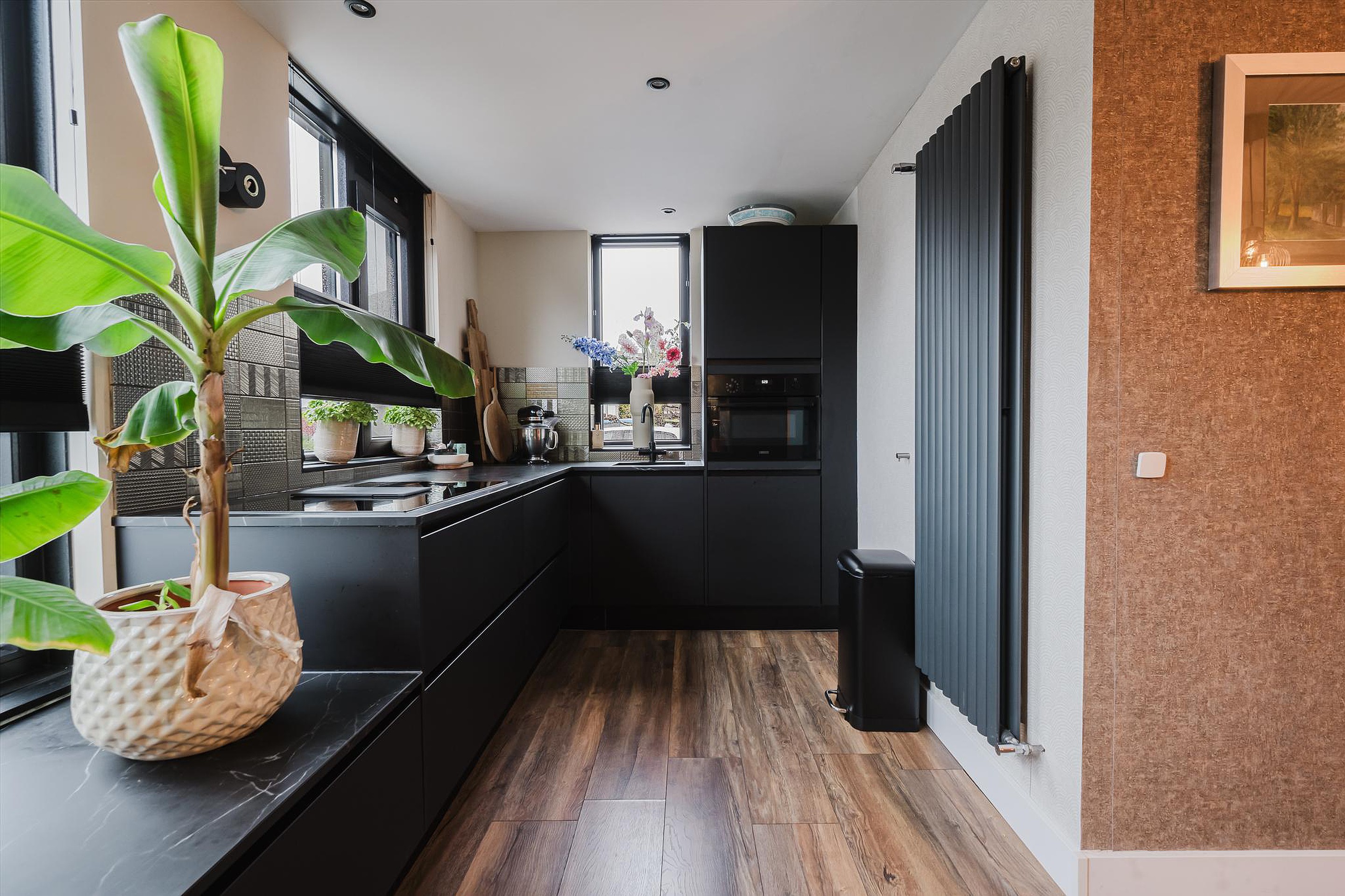 Aan de voorzijde bevindt zich de moderne open keuken (2021), volledig uitgerust met inbouwapparatuur en grote raampartijen.