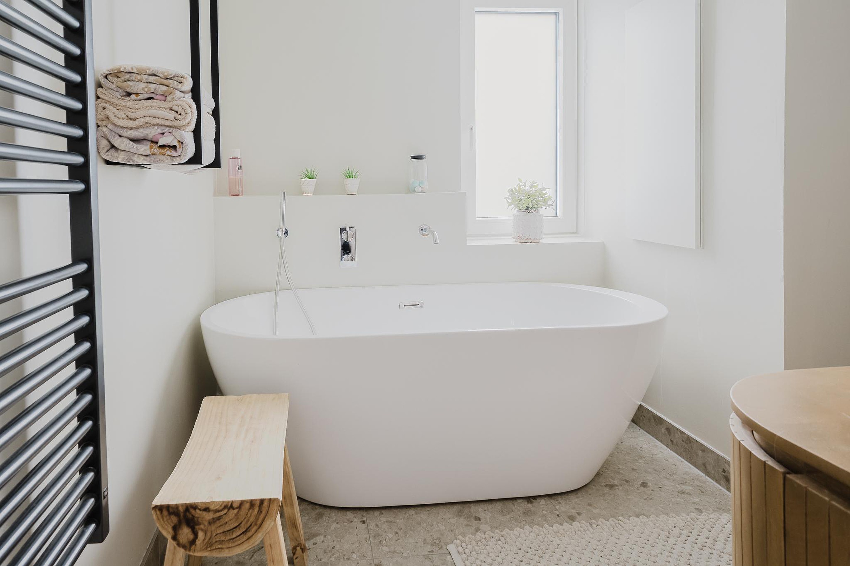 De badkamer (2024) is modern uitgevoerd en voorzien van een ligbad, inloopdouche, toilet en wastafelmeubel.