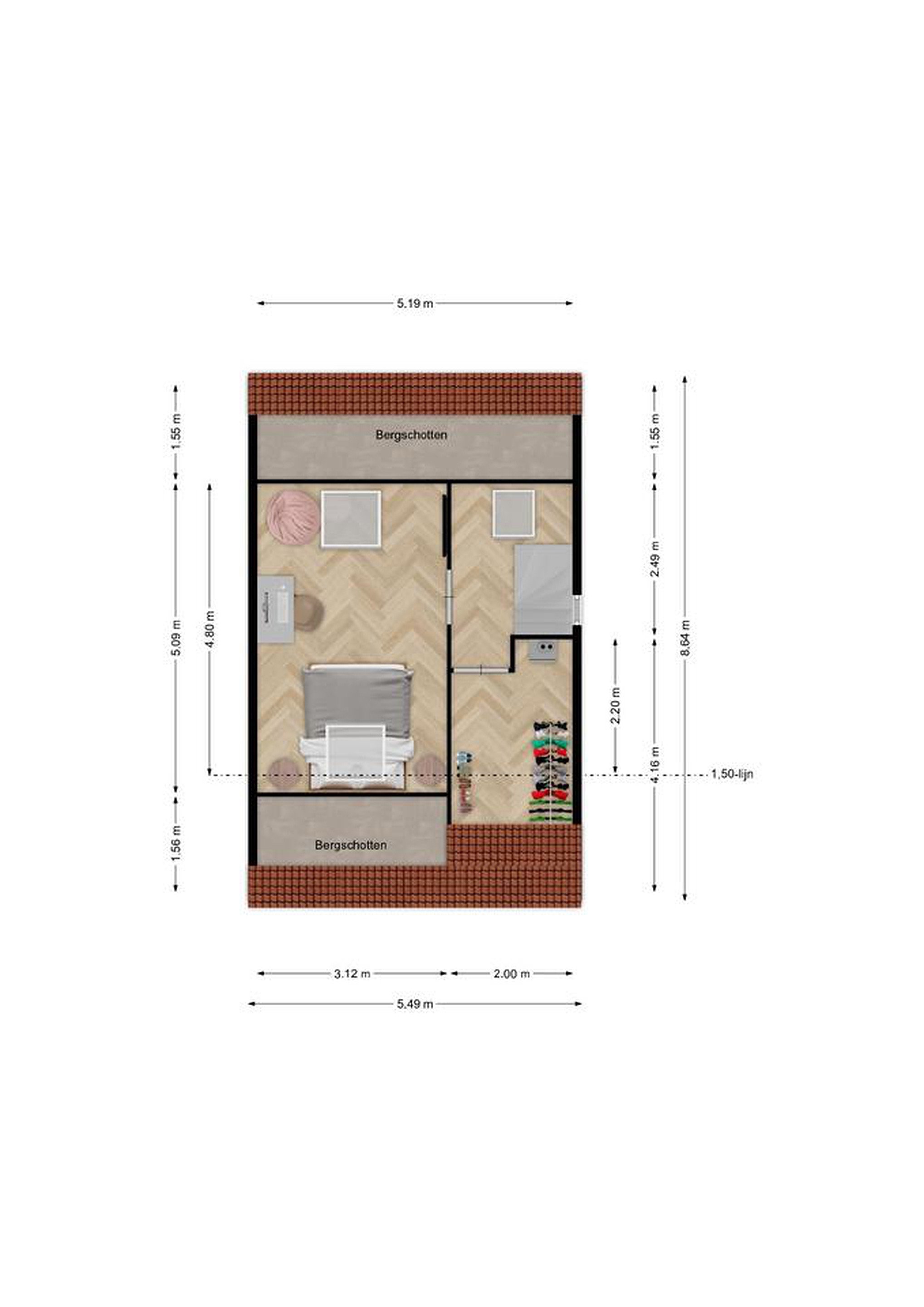 Op de tweede verdieping vind je een ruime vierde slaapkamer, voorzien van dakramen en handige bergschotten.