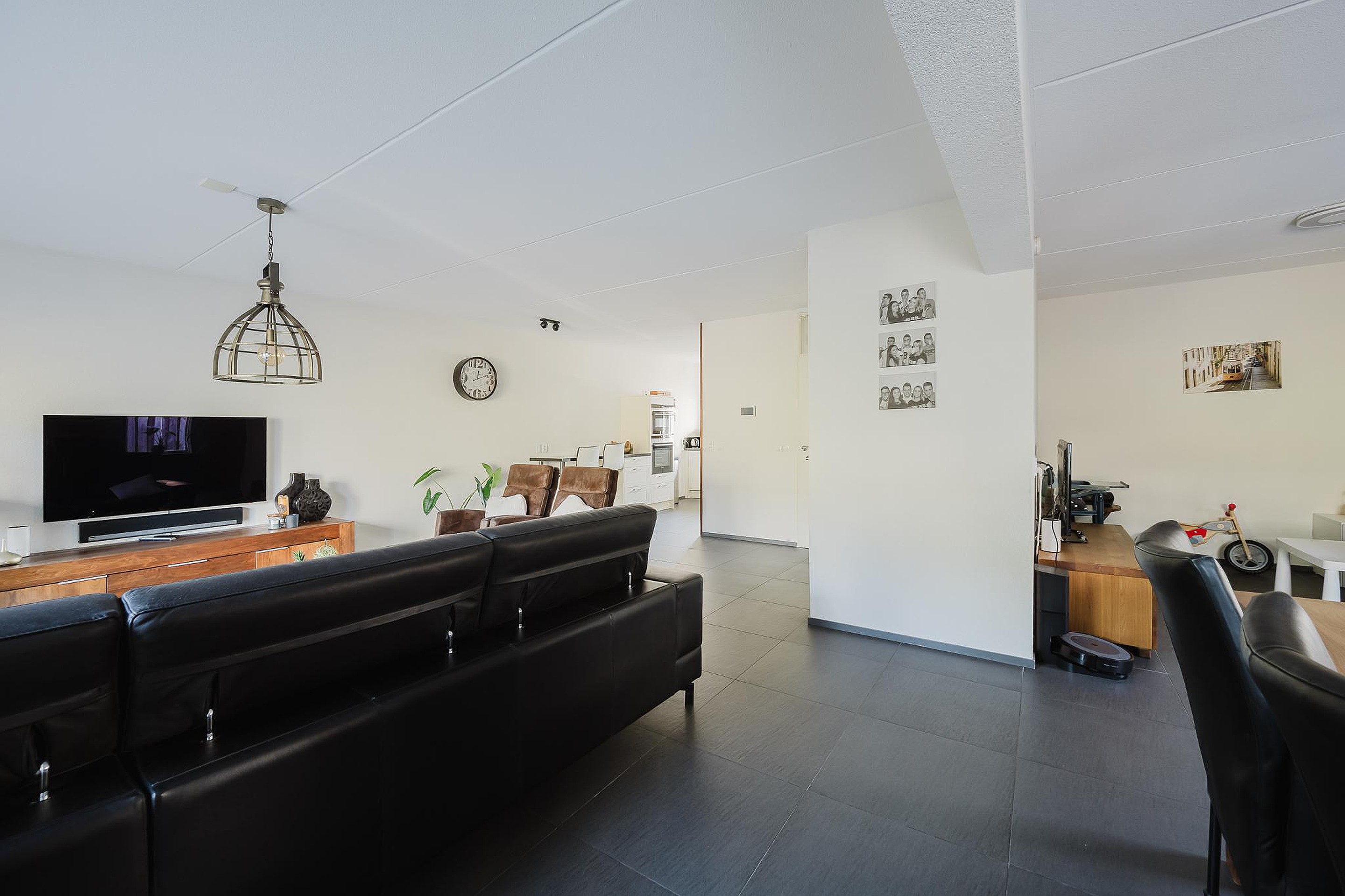 Eenmaal terug in de hal betreed je de royale woonkamer, die is afgewerkt met een plavuizen vloer voorzien van vloerverwarming, strak afgewerkte spachtelputz wanden en grote raampartijen die zorgen voor een aangename hoeveelheid natuurlijk licht.
