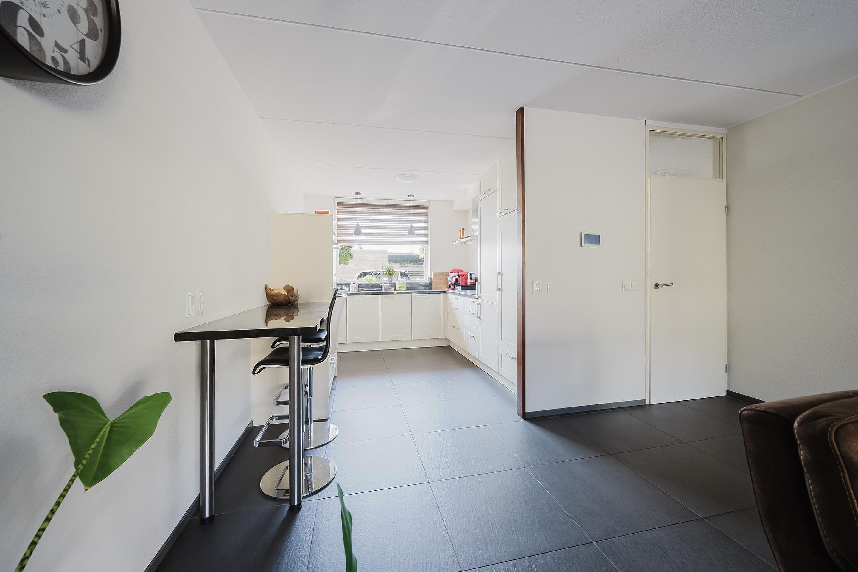 De voormalige garage is volledig omgetoverd tot een ruime bijkeuken en een extra slaapkamer op de begane grond.