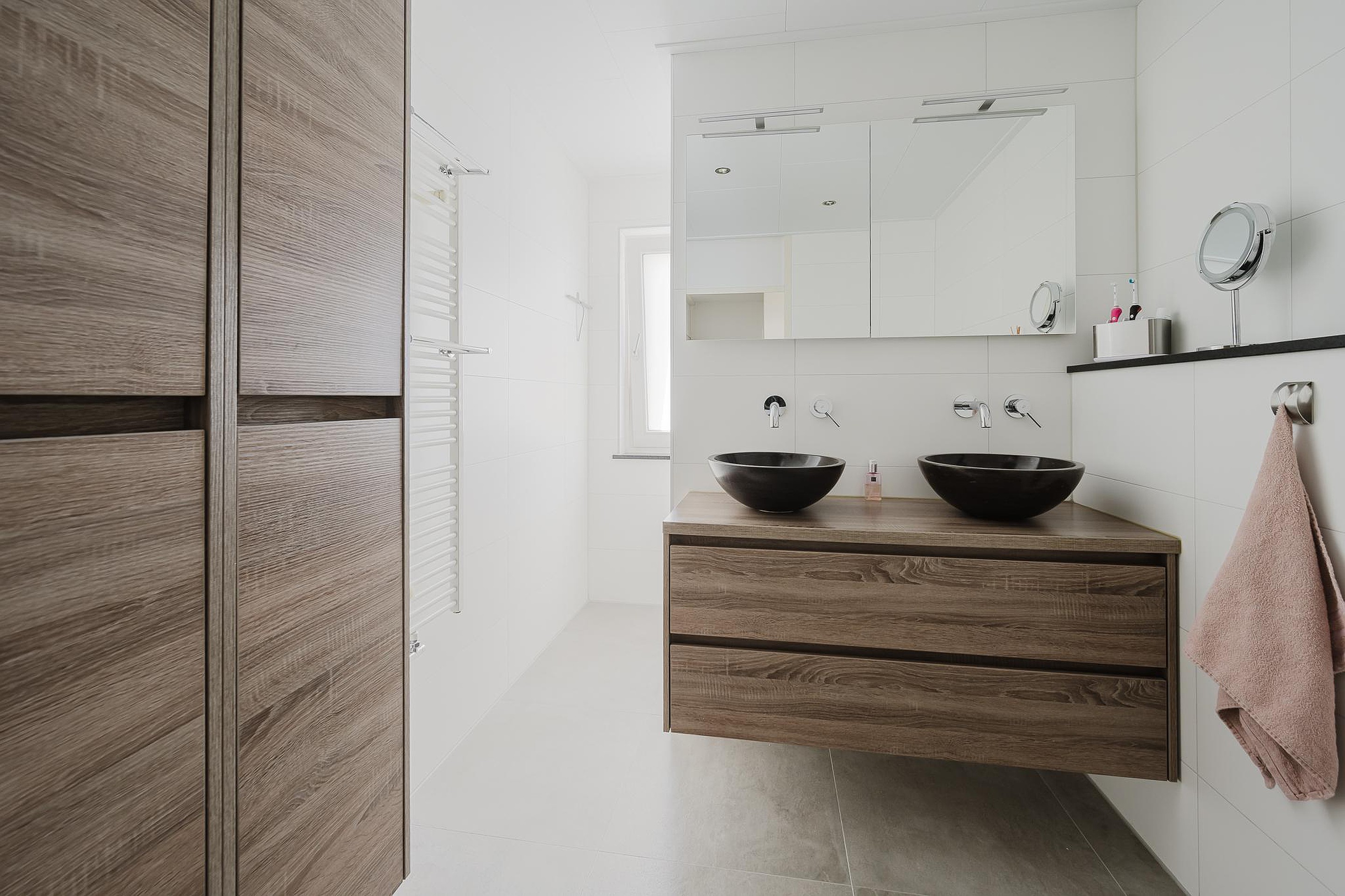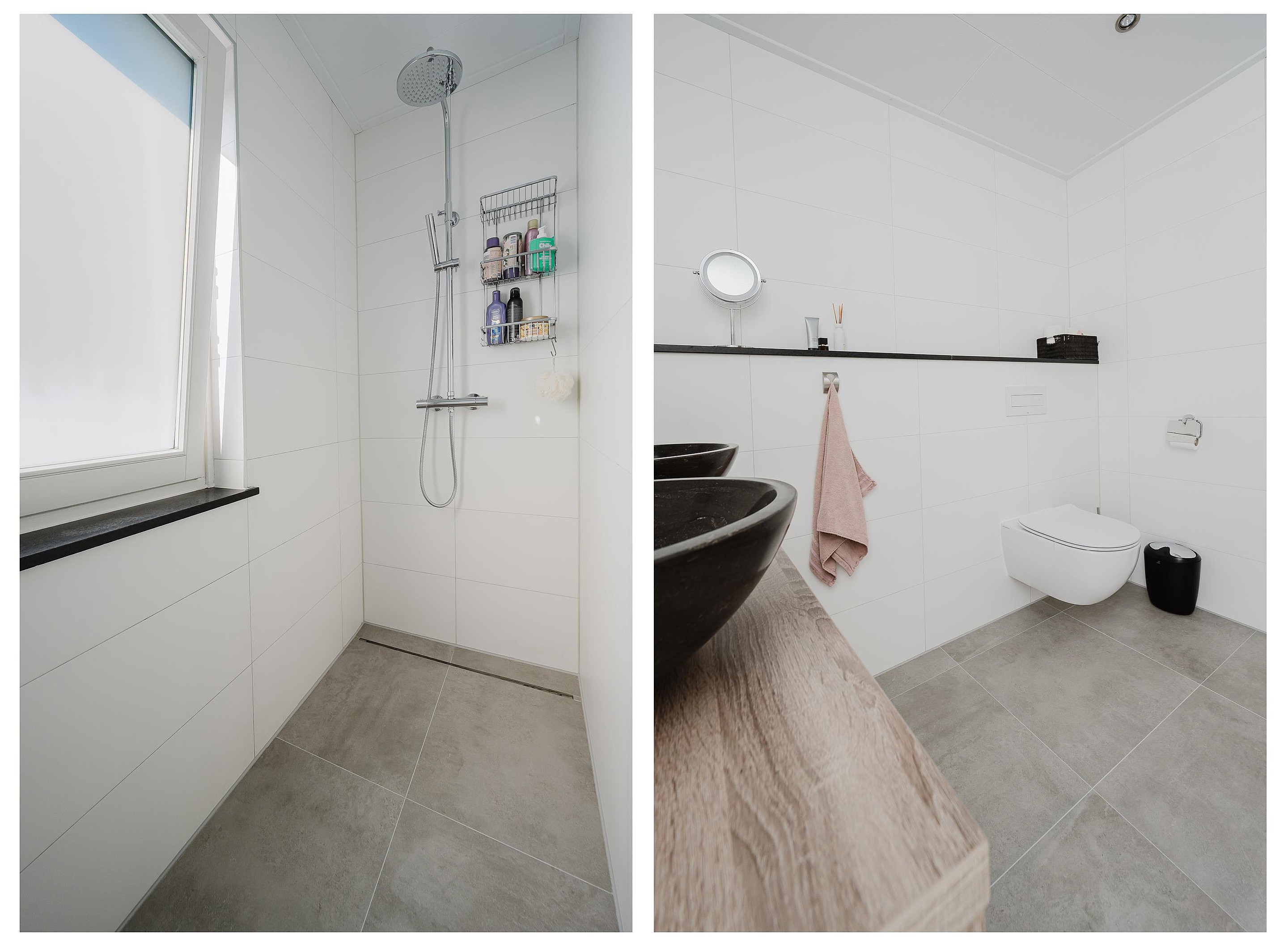 De royale badkamer is afgewerkt in een moderne sfeer en is volledig betegeld. Verder is de badkamer voorzien van een ruime inloopdouche, heeft een hangend toilet en een wastafelmeubel met dubbele waskom.