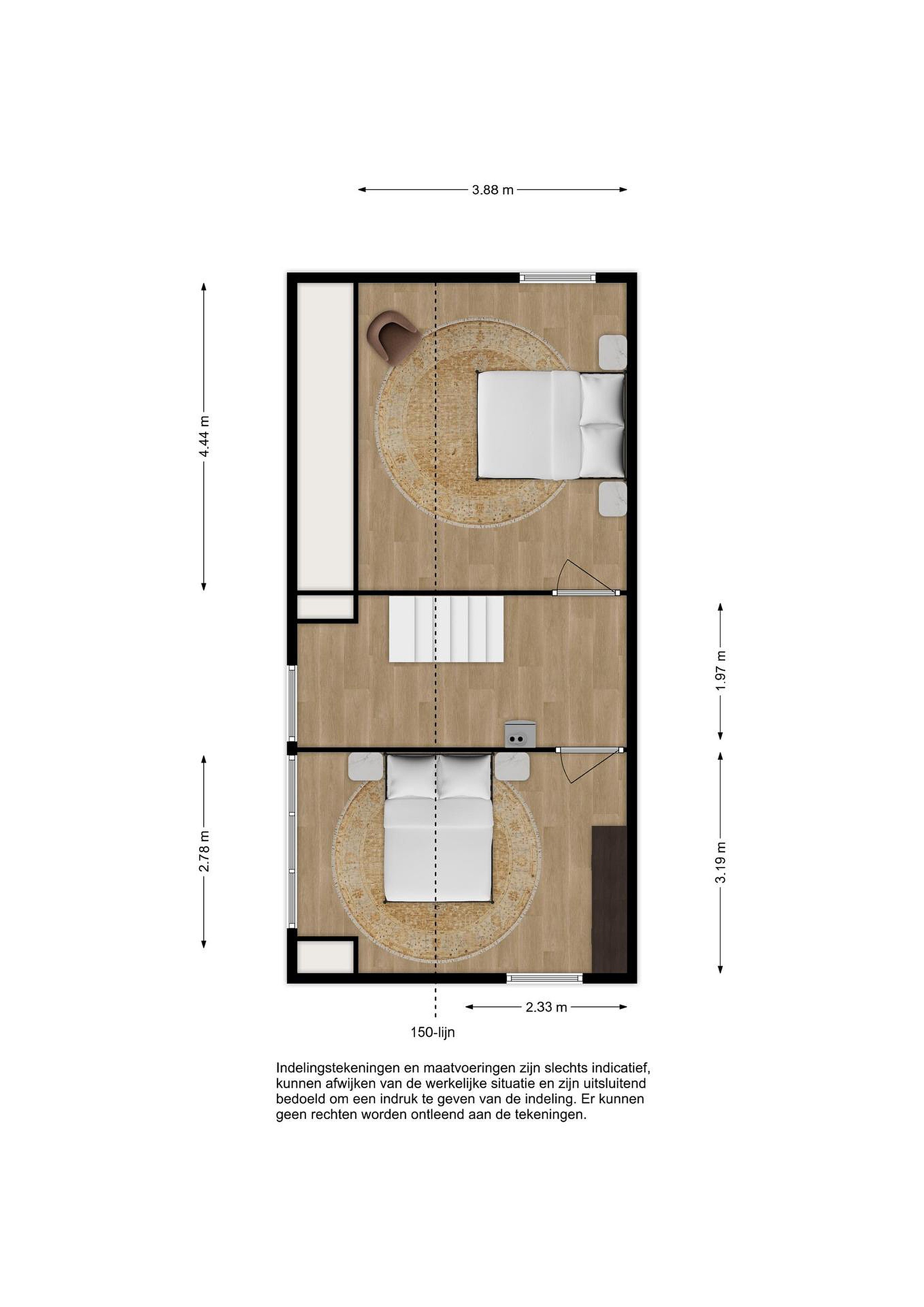 - Slaapkamer 5 is circa 233 (tot 150 cm lijn) cm x 444 cm