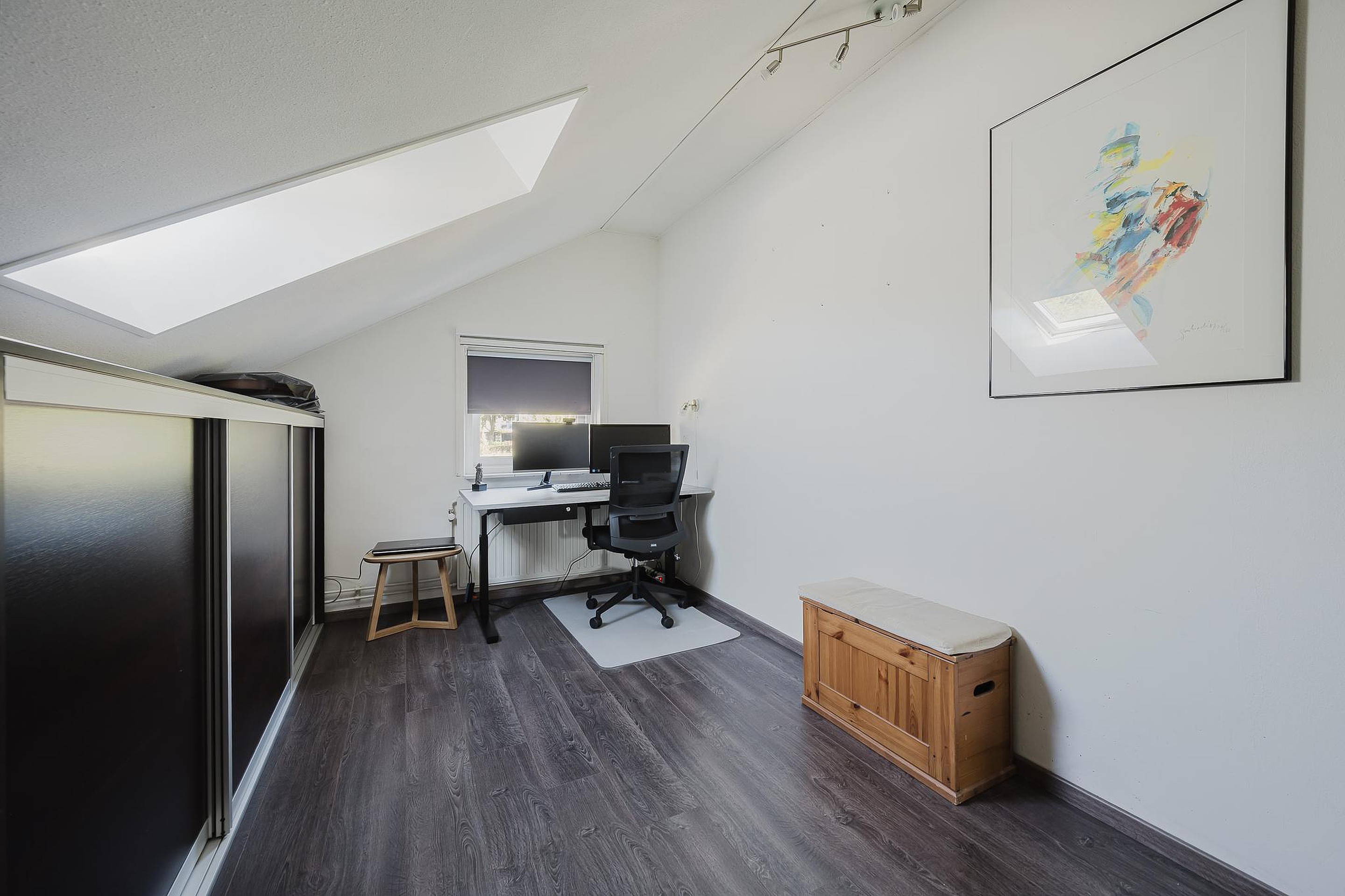 De ruimte aan de achterzijde van de woning is voorzien van een kunststof Velux dakraam en de bergschotten zorgen hier voor voldoende opbergruimte.