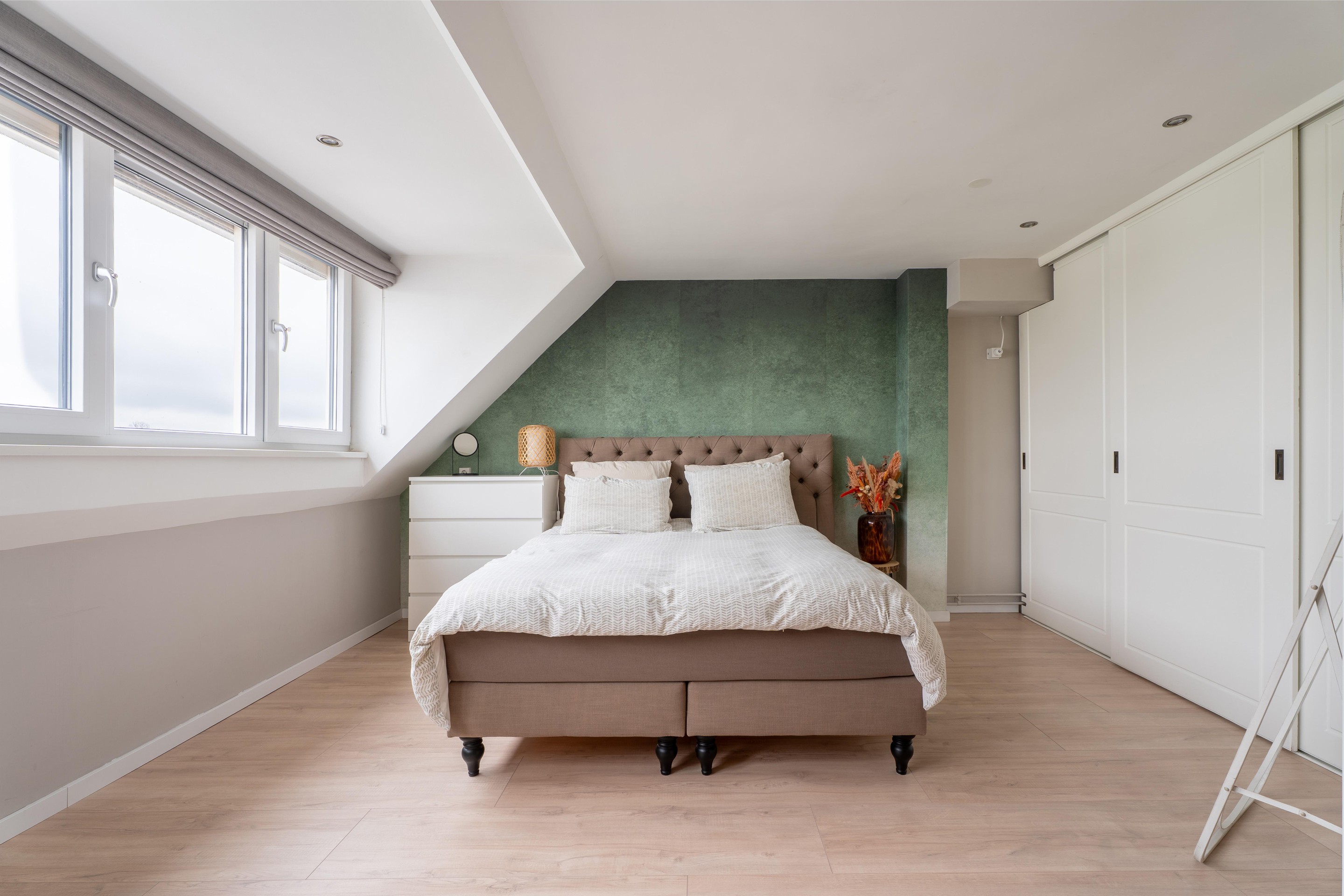 De tweede verdieping beschikt over een ruime vierde slaapkamer met een dakkapel over de volledige breedte, airco (2025) die kan koelen en verwarmen, een nieuwe laminaatvloer (2025) en een grote inbouwkast met extra bergruimte.