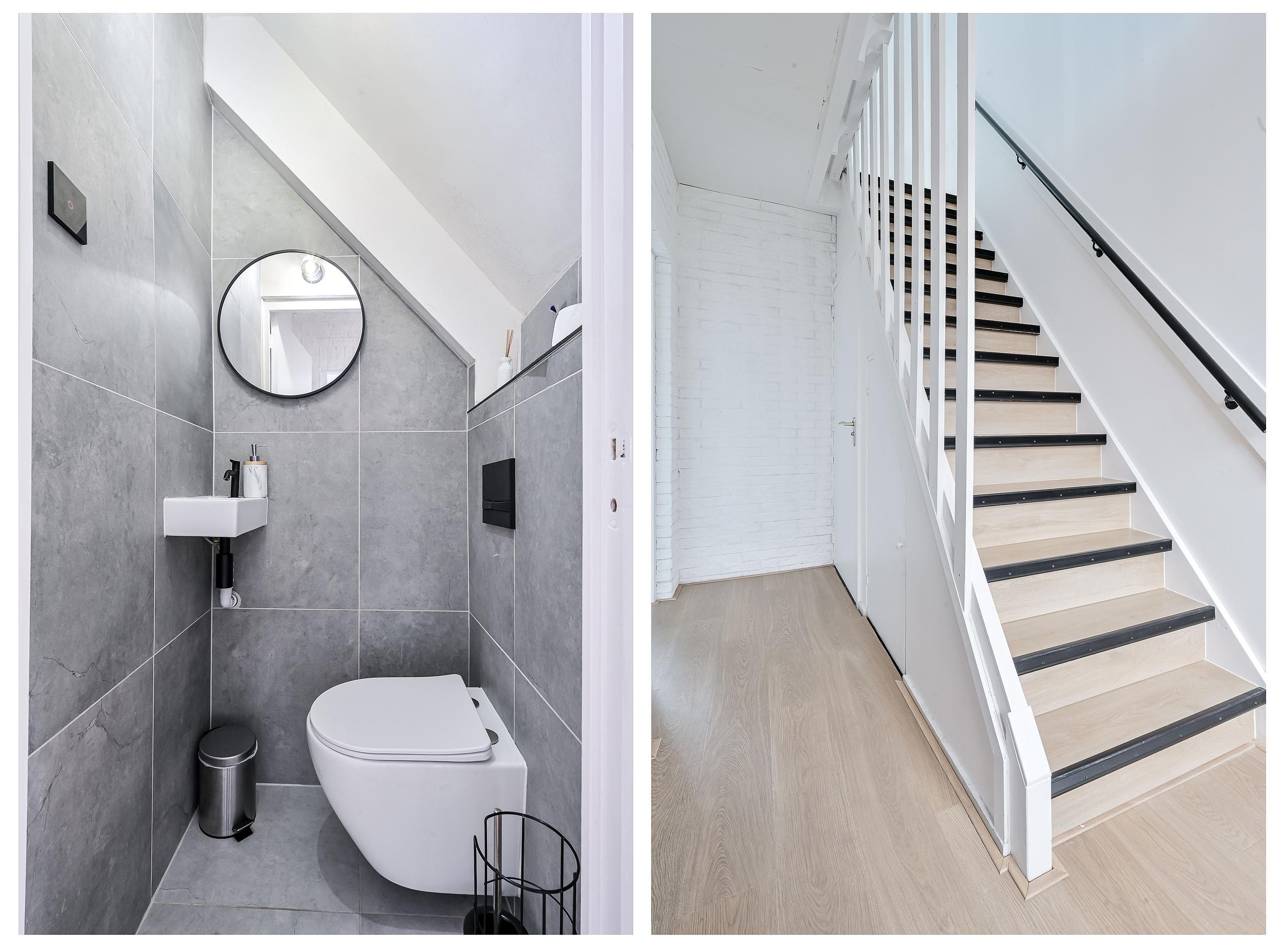 De badkamer is in 2024 volledig vernieuwd en uitgevoerd in een moderne stijl. De ruimte is volledig betegeld en voorzien van een royale inloopdouche en een hangend wastafelmeubel.