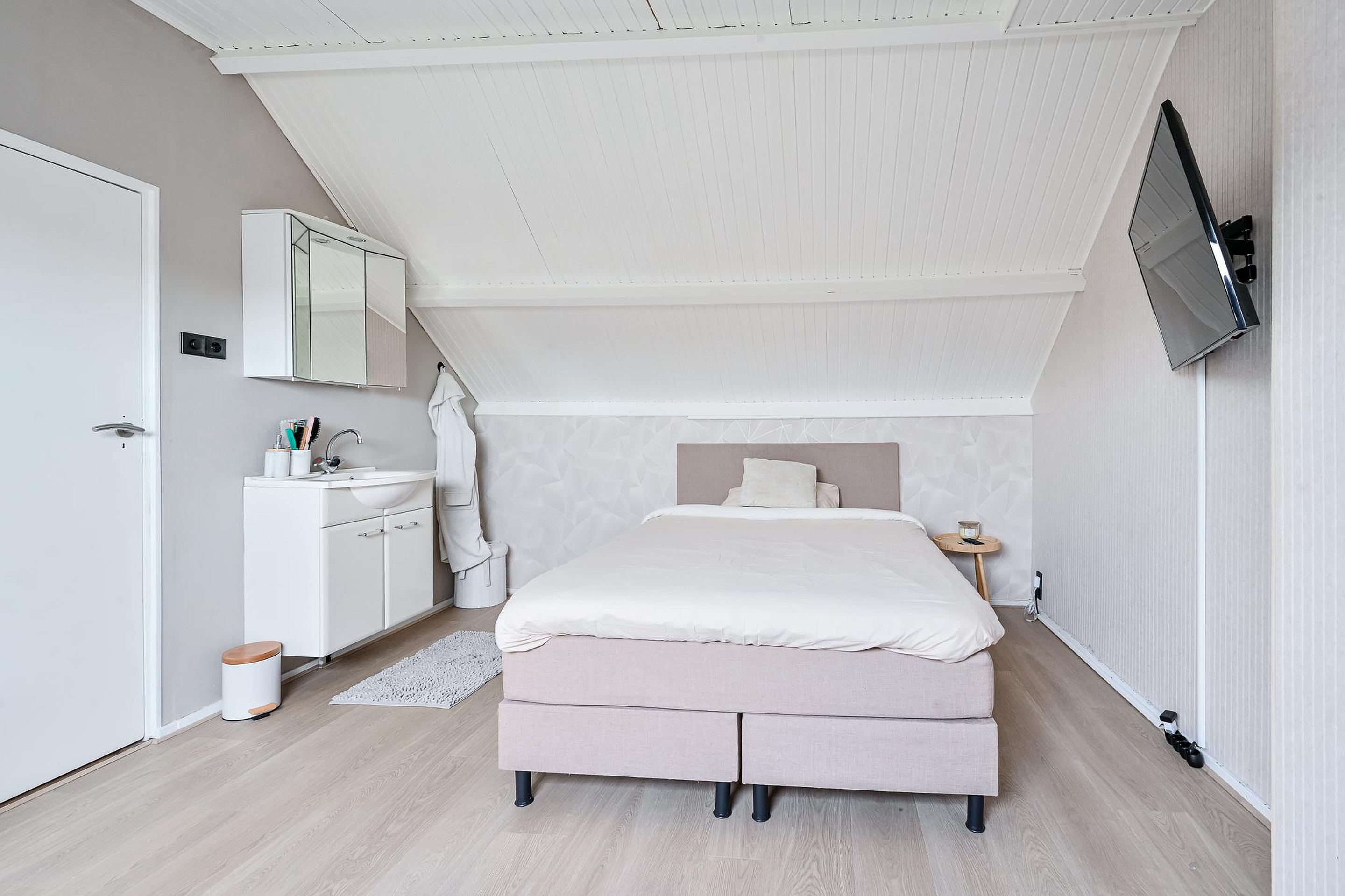 De zolderkamer beschikt eveneens over bergschotten en is daarnaast voorzien van een wastafel, wat deze ruimte multifunctioneel inzetbaar maakt.