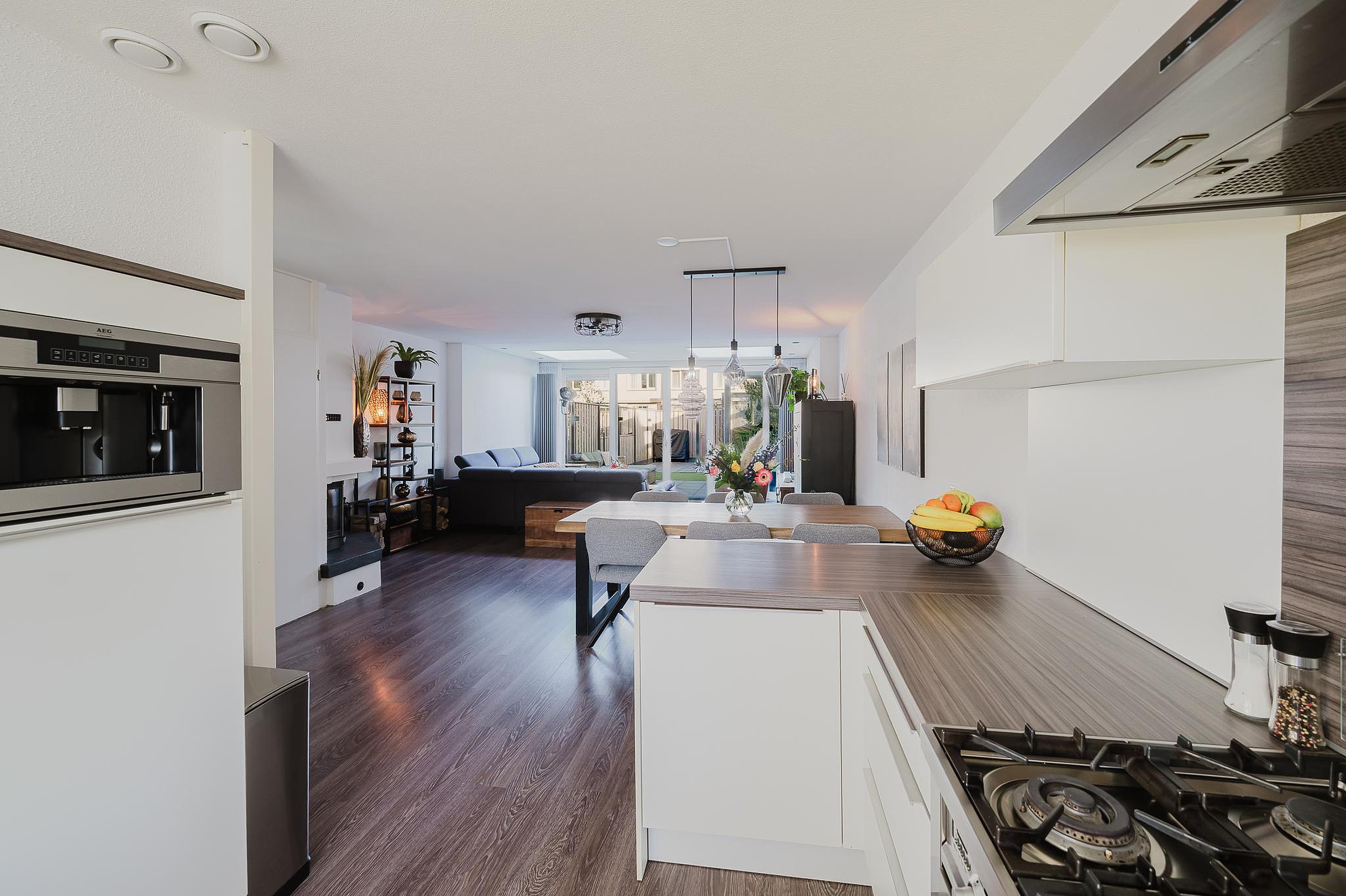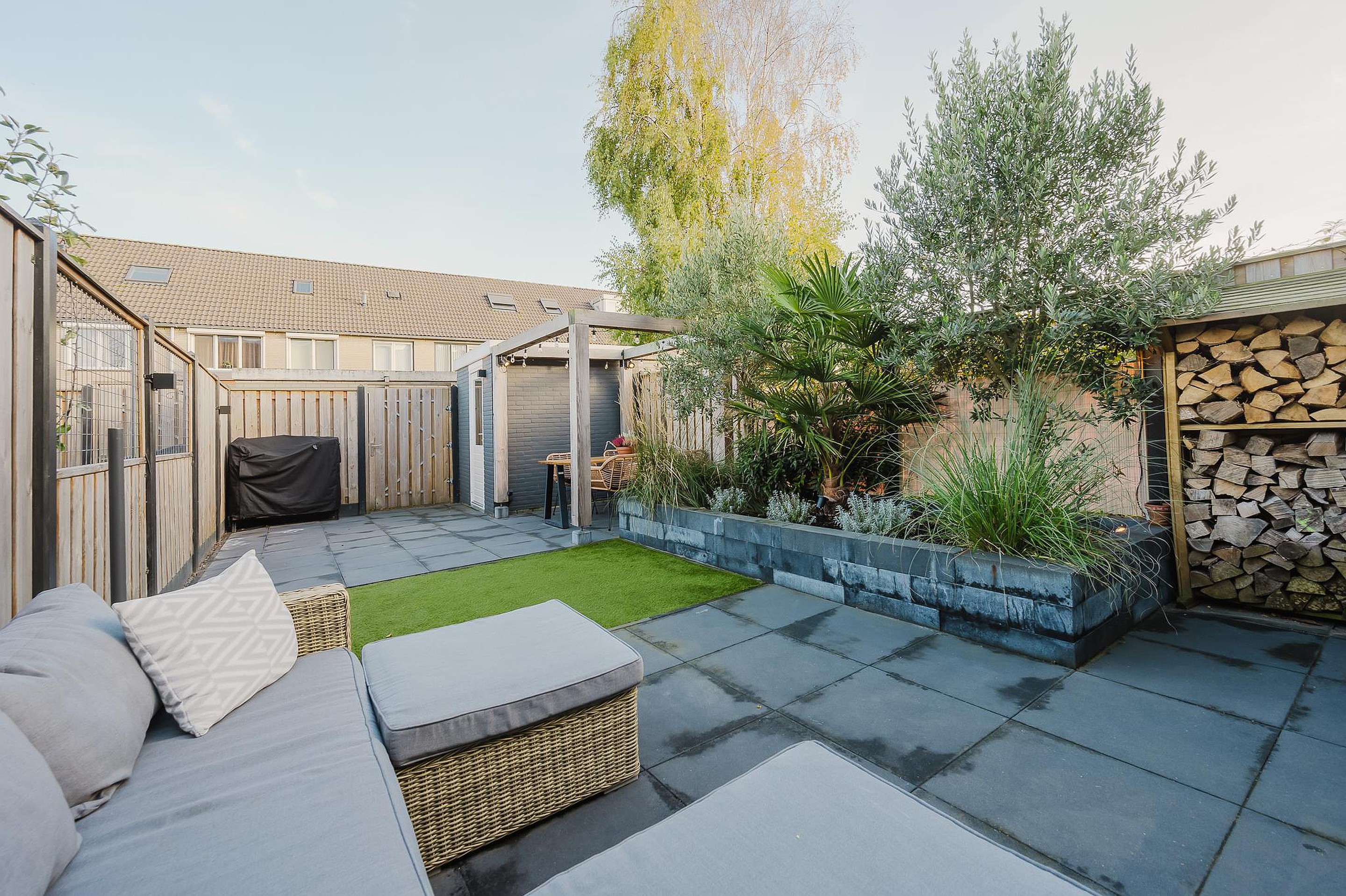 Vanuit de woonkamer bereik je via de schuifpui de fraai aangelegde achtertuin. De achtertuin is twee jaar geleden volledig nieuw aangelegd, is voorzien van een achterom en een elektrisch zonnescherm.