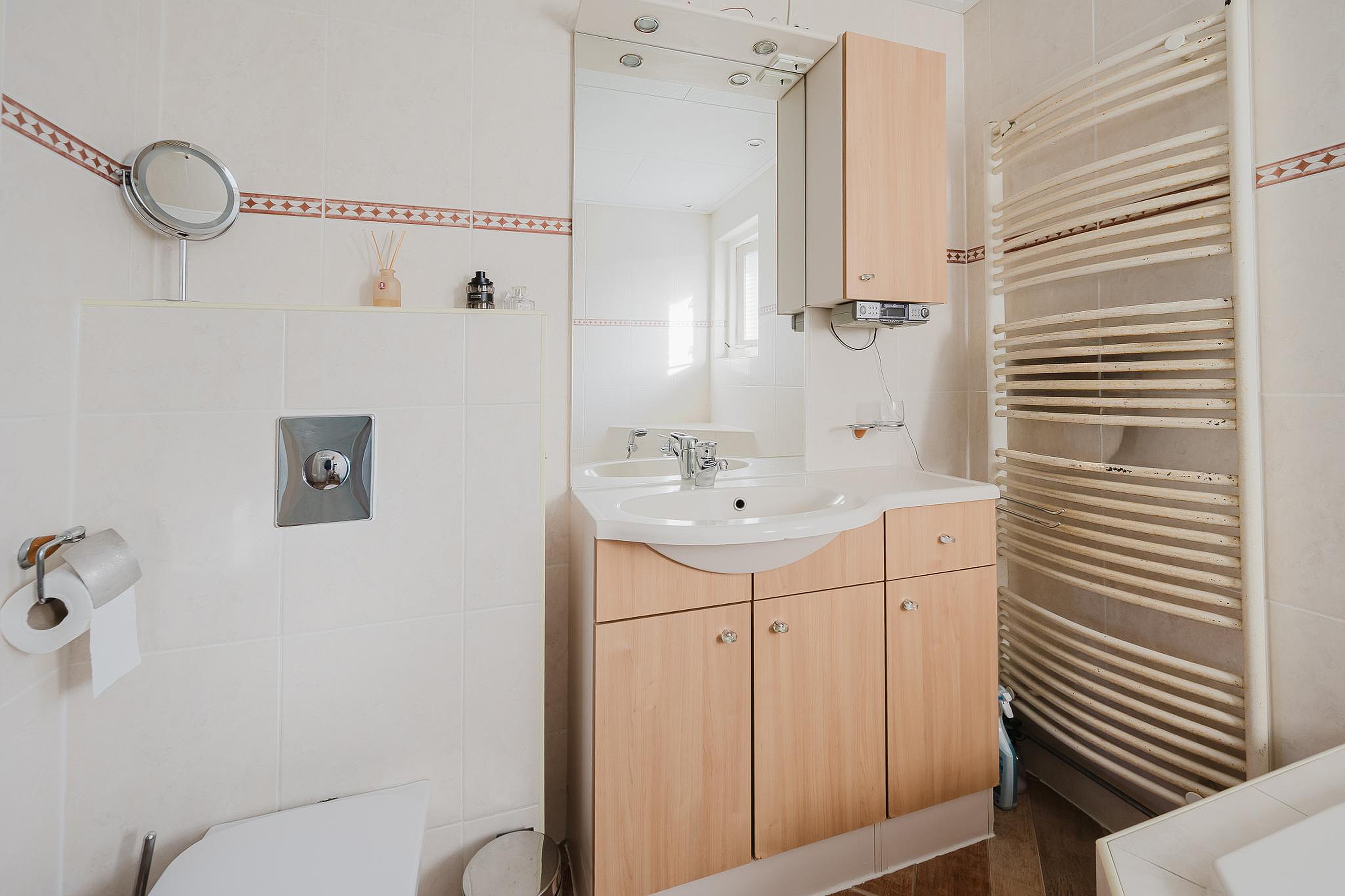 De ruime badkamer is volledig betegeld en is voorzien van een royaal hoekbad, een douche, heeft een hangend toilet en een wastafel met wastafelmeubel.