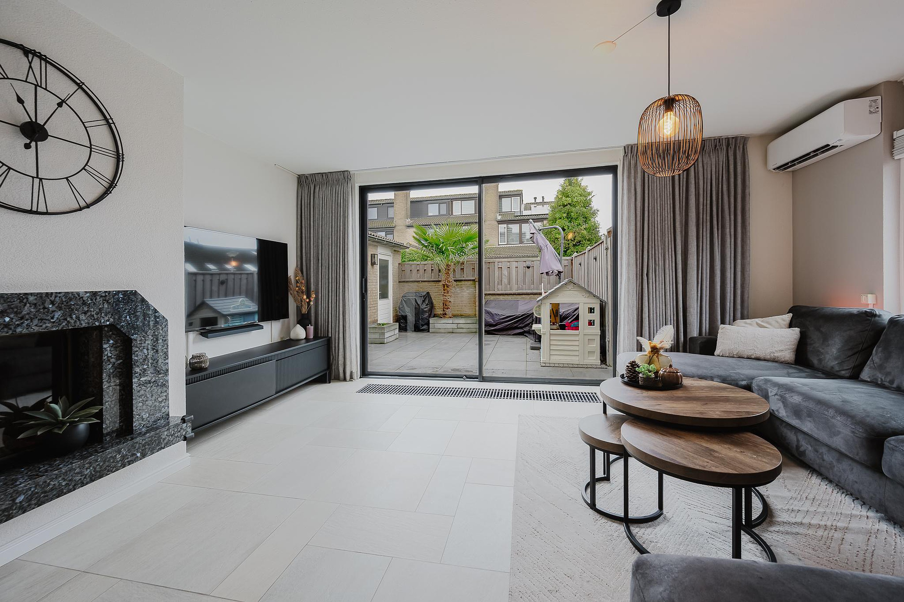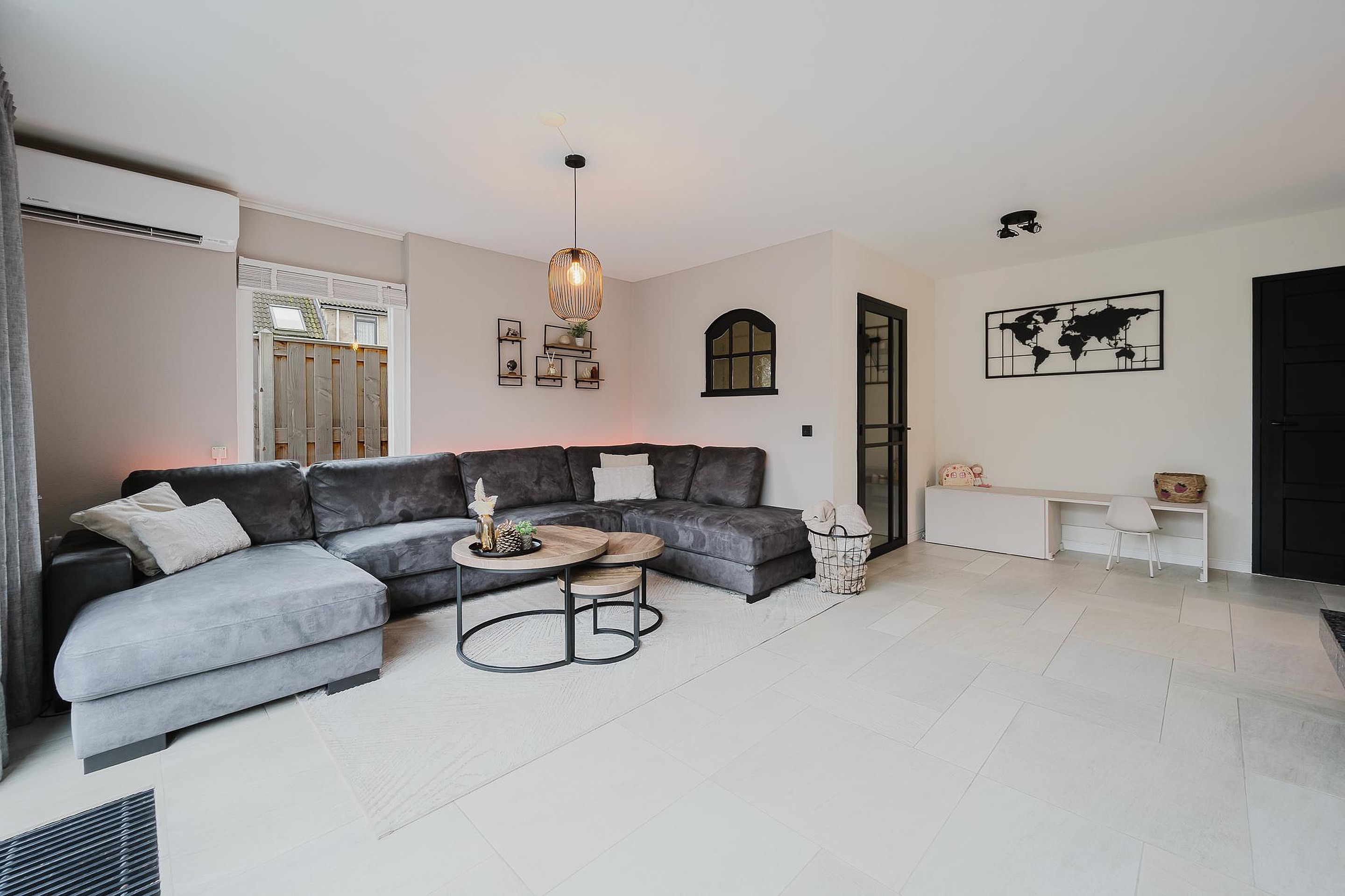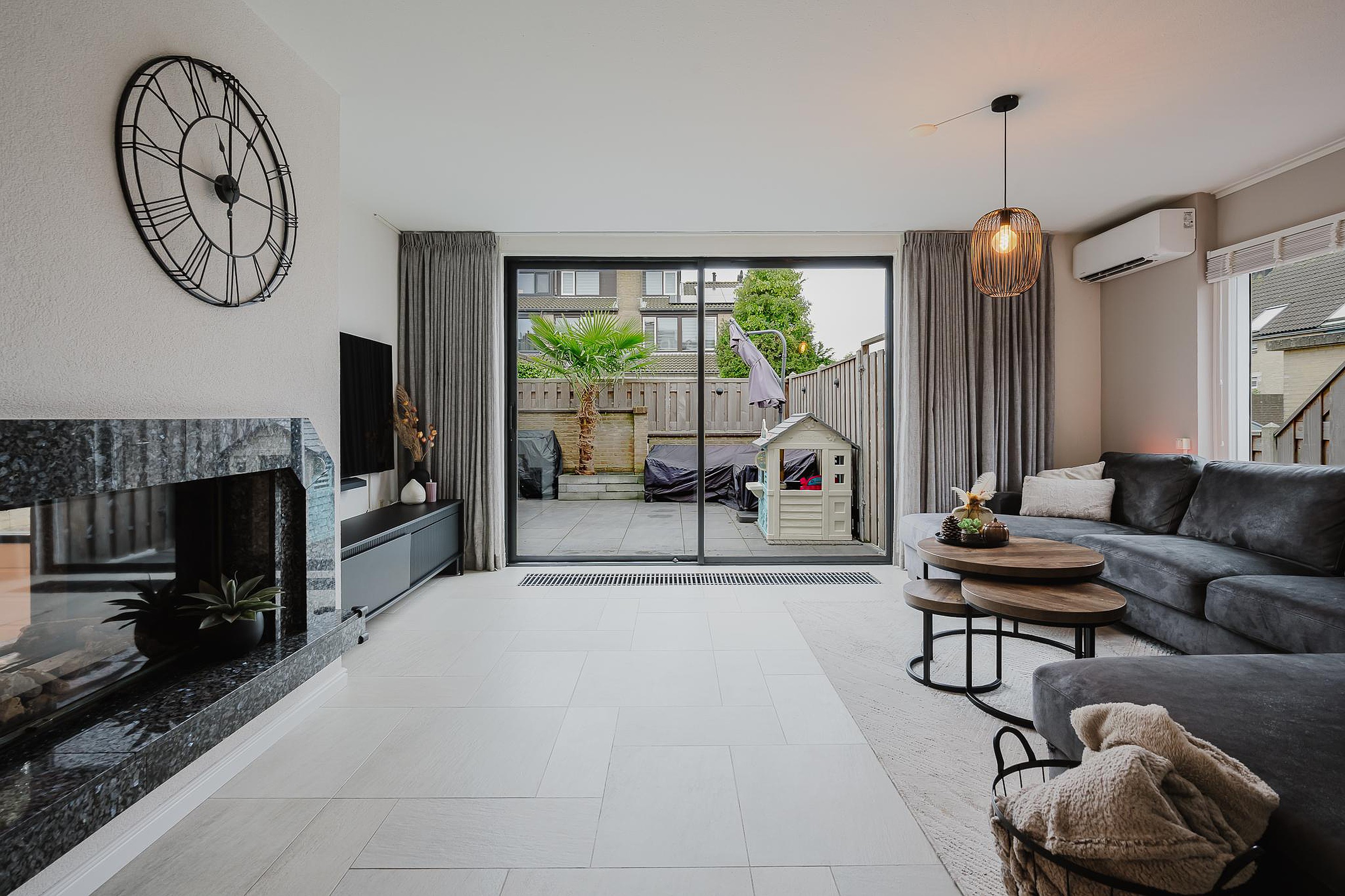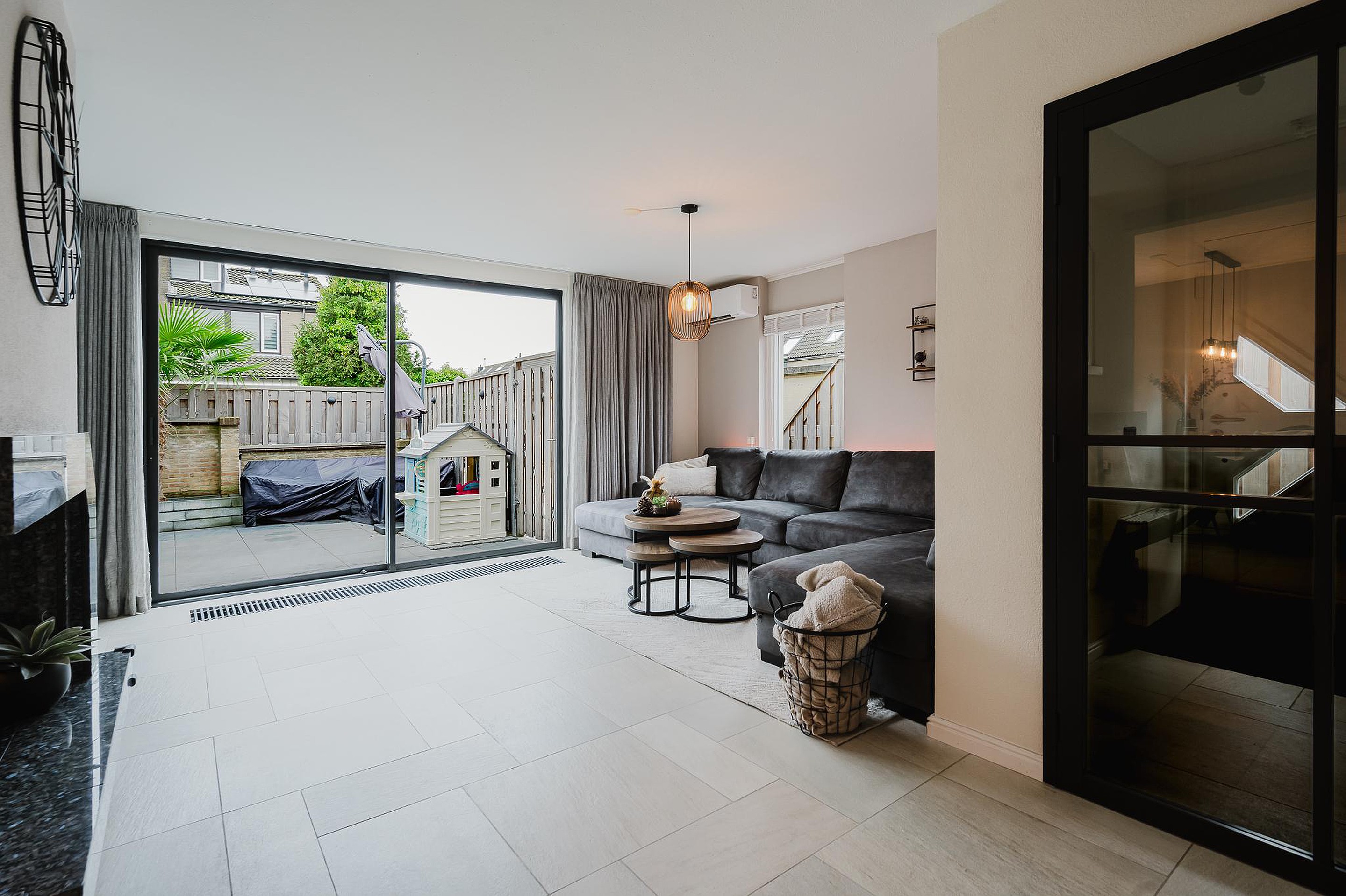 In de woonkamer zorgen zowel de vloerverwarming, de convectorputten en de sfeervolle open haard voor verwarming. Ook is de woonkamer voorzien van een airco (juni 2023) welke zorgt voor zowel koelen als verwarmen. De elektrische rolluik in de woonkamer zorgt voor extra privacy en de schuifpui zorgt voor een prettige lichtinval.