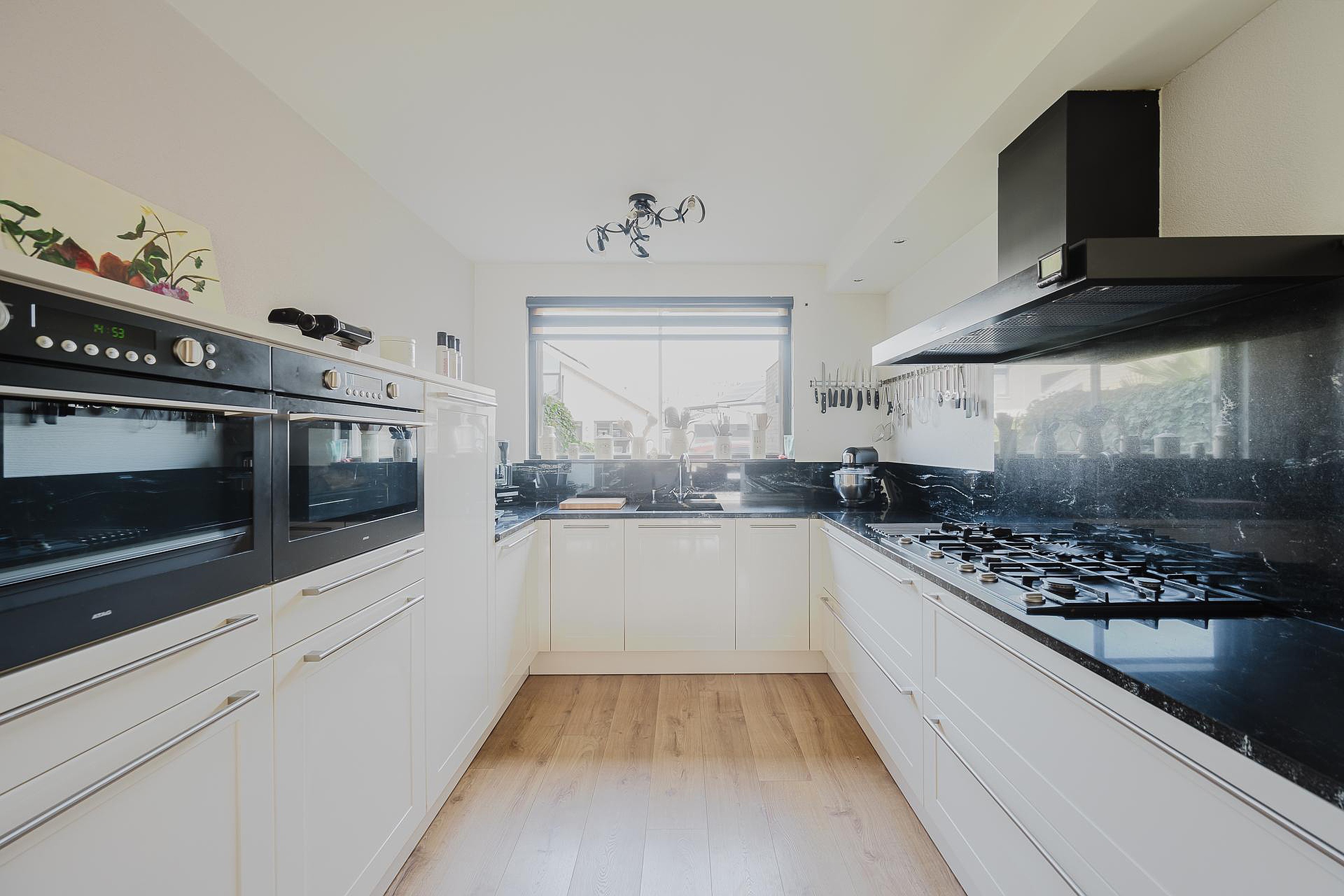 De royale keuken in landelijke stijl is voorzien van veel opbergruimte, heeft een vaatwasser, een ruime koelkast, een 5-pits gaskookplaat, een oven, een magnetron en een zwart granieten keukenblad.
