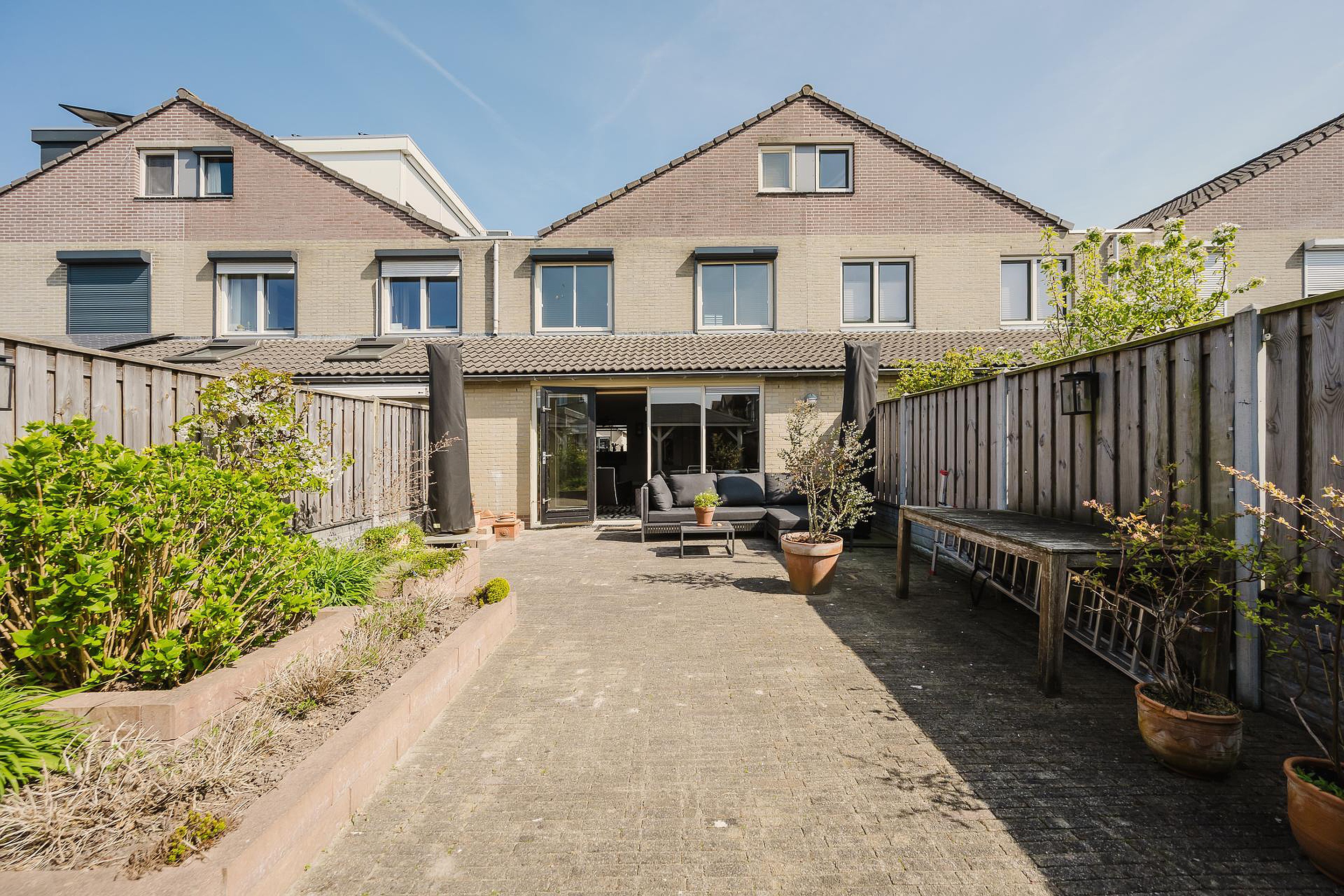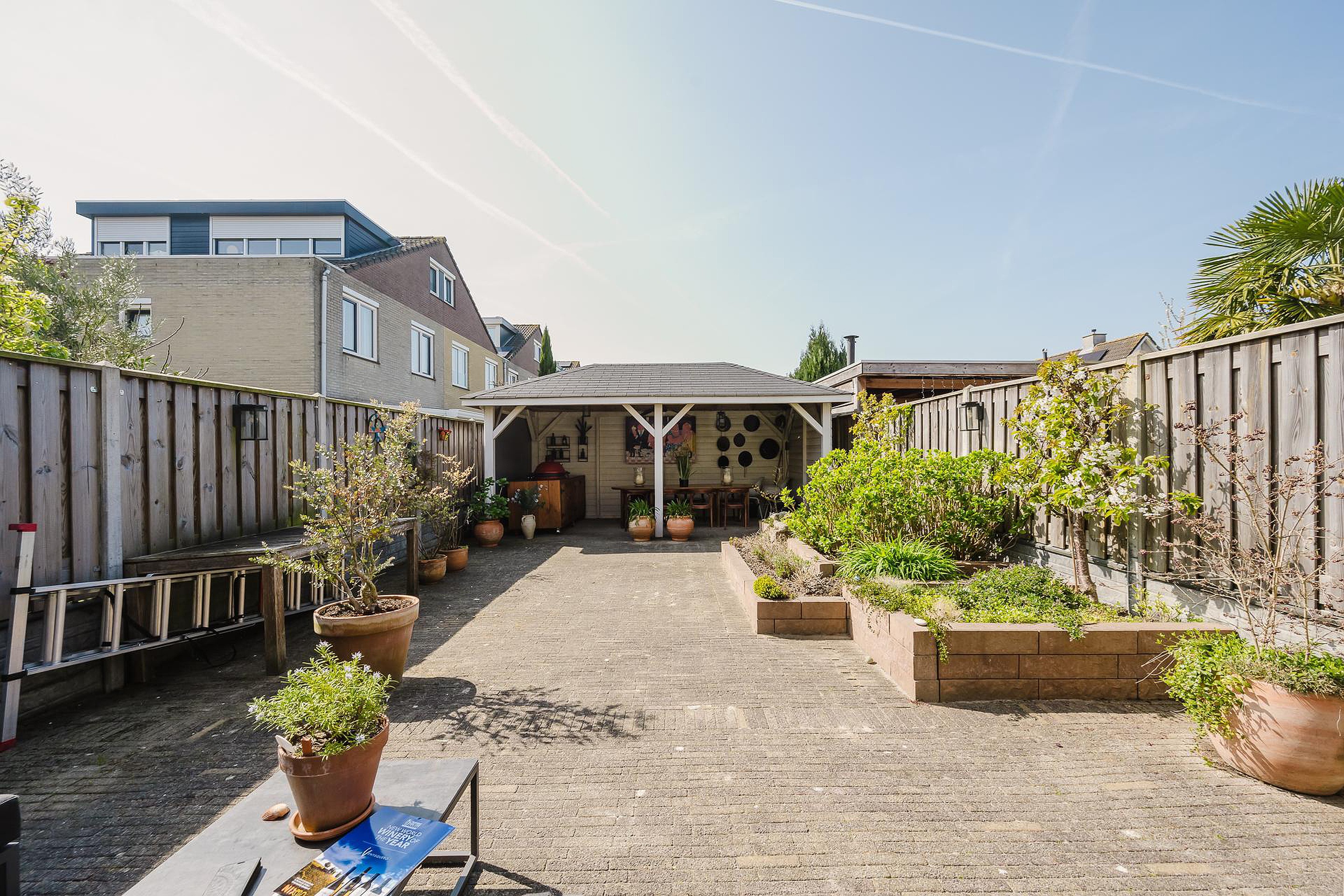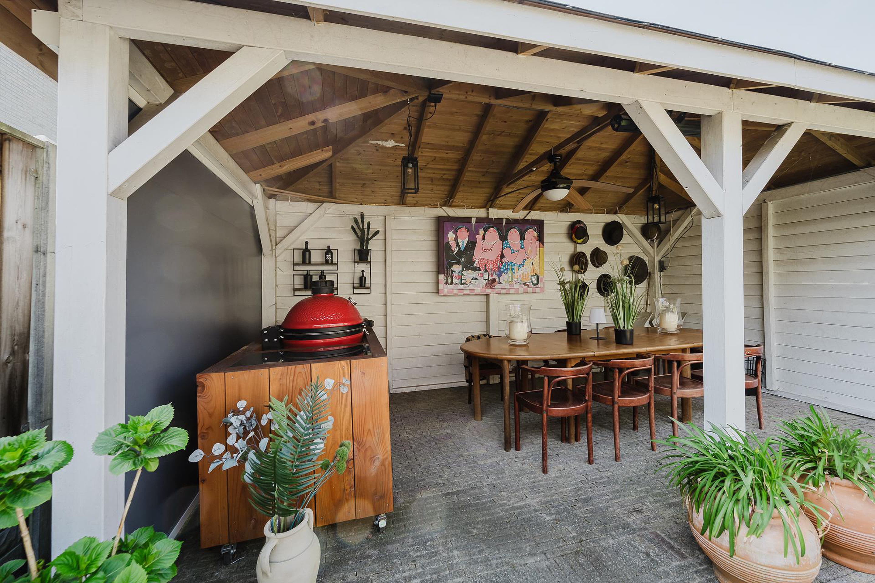 Via de tuindeur bereik je de fraai aangelegde achtertuin. Tot in de late uurtjes genieten van het buitenleven doe je onder de houten overkapping.