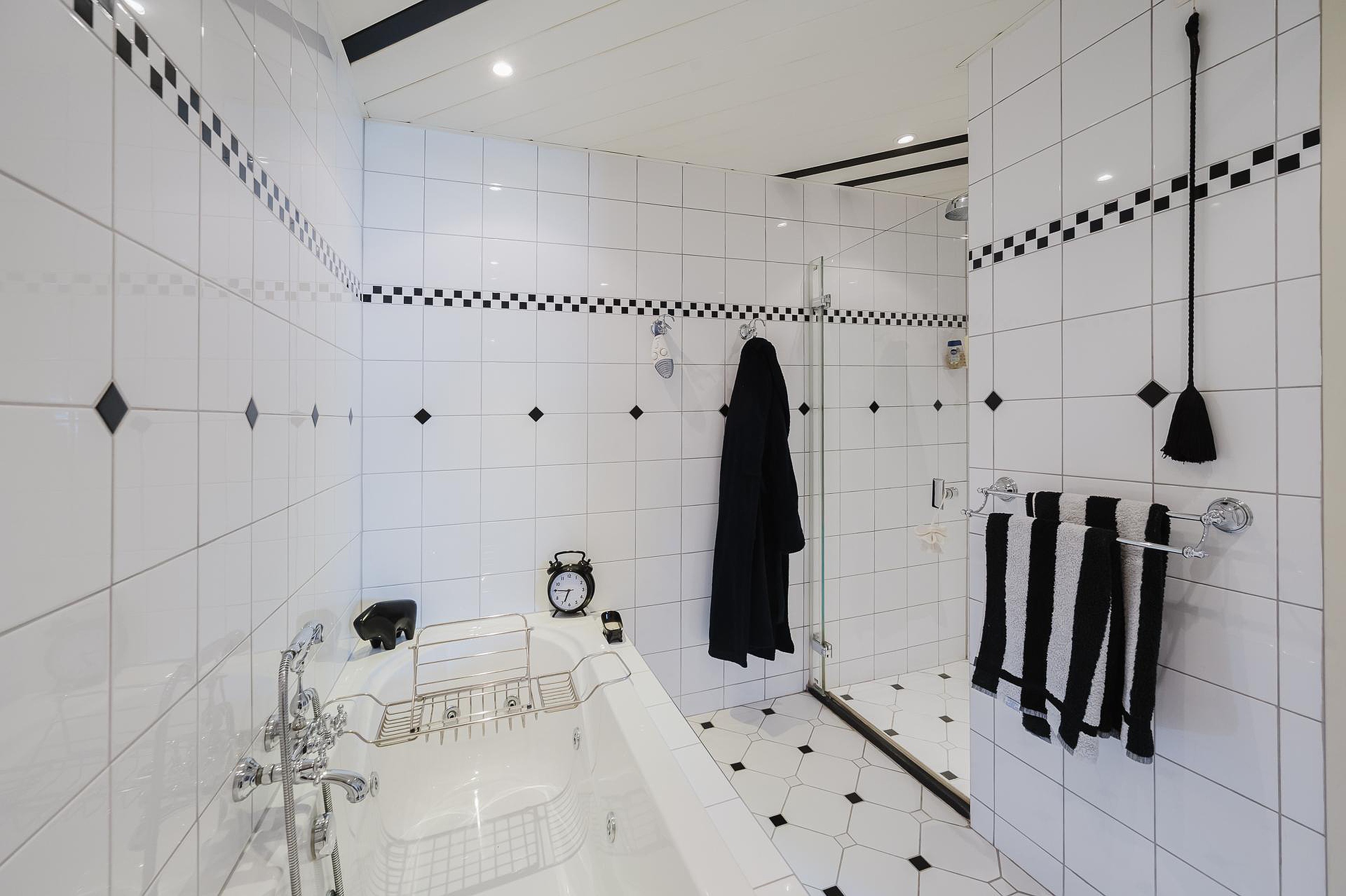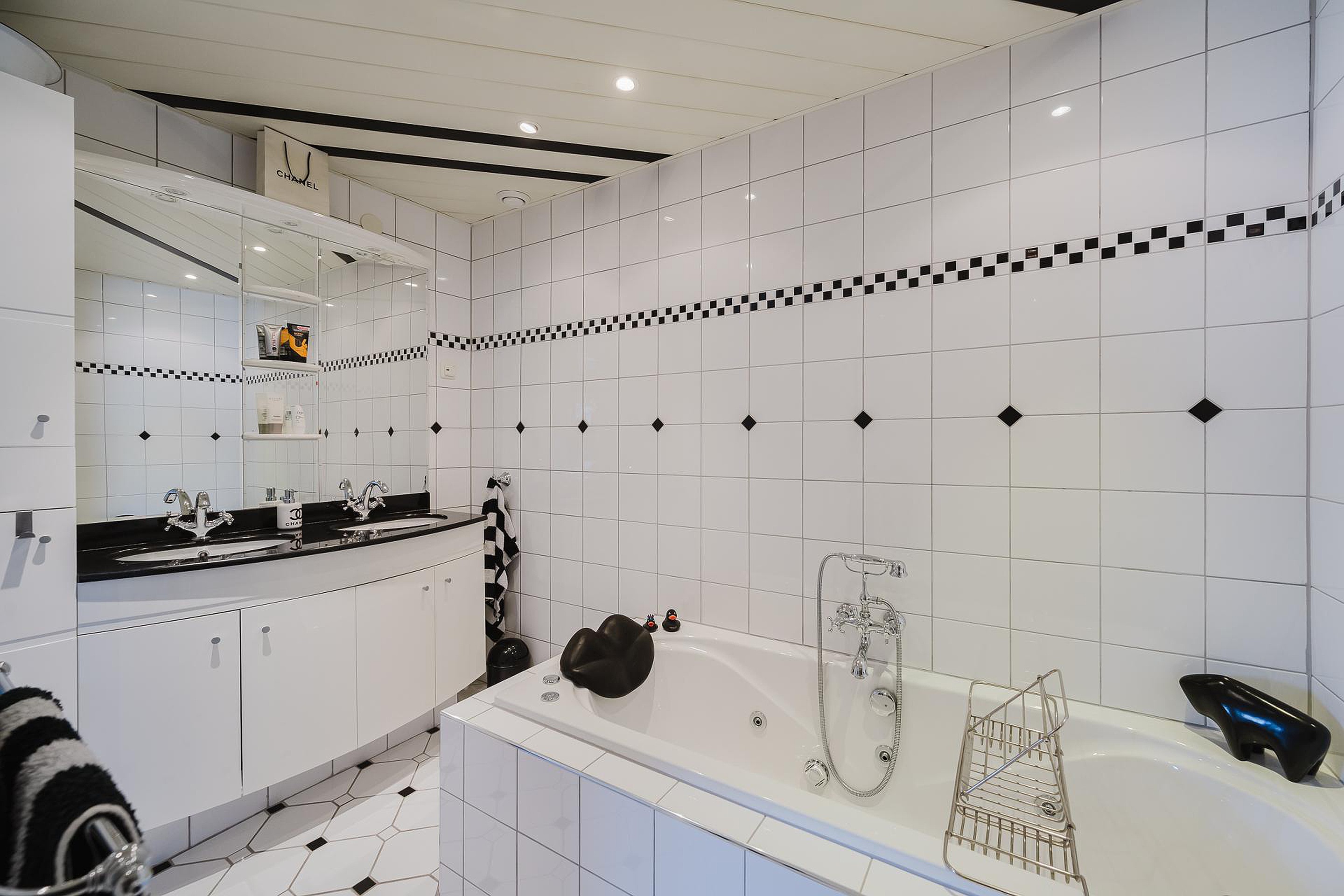 De ruime badkamer is voorzien van een riante inloopdouche, een ligbad, een wastafelmeubel en vloerverwarming.
