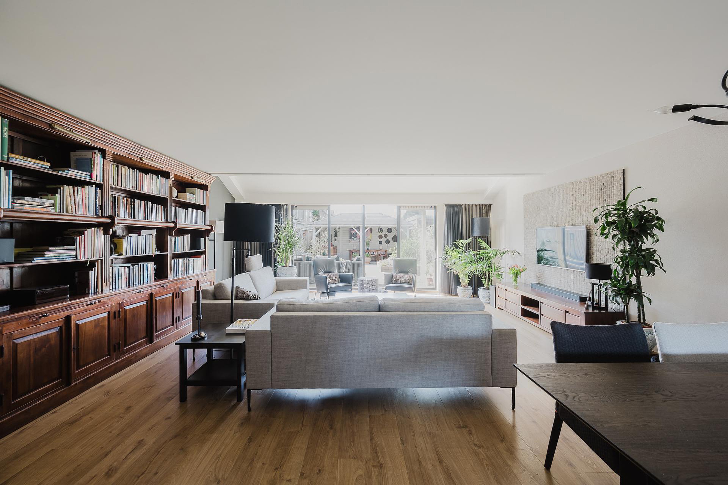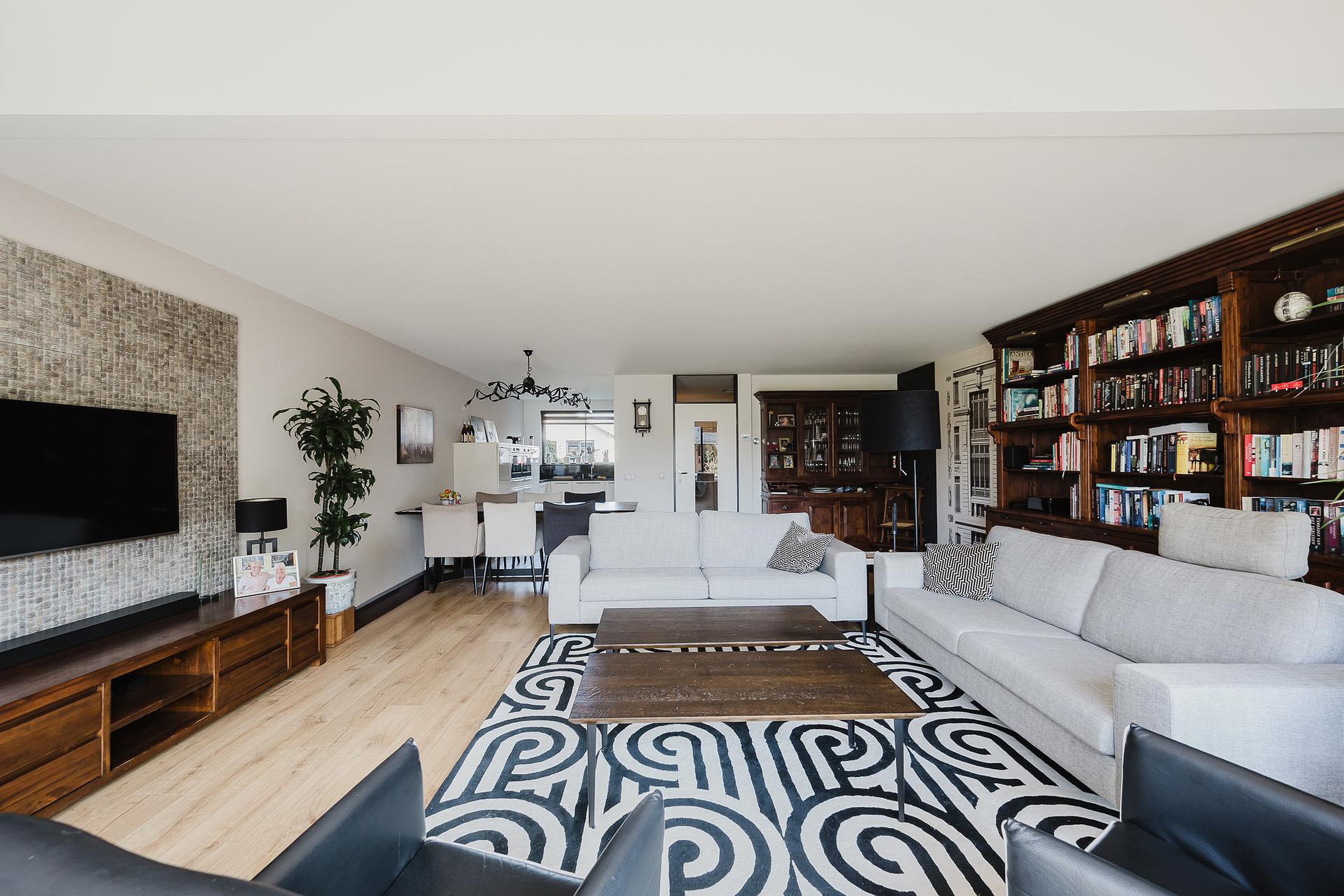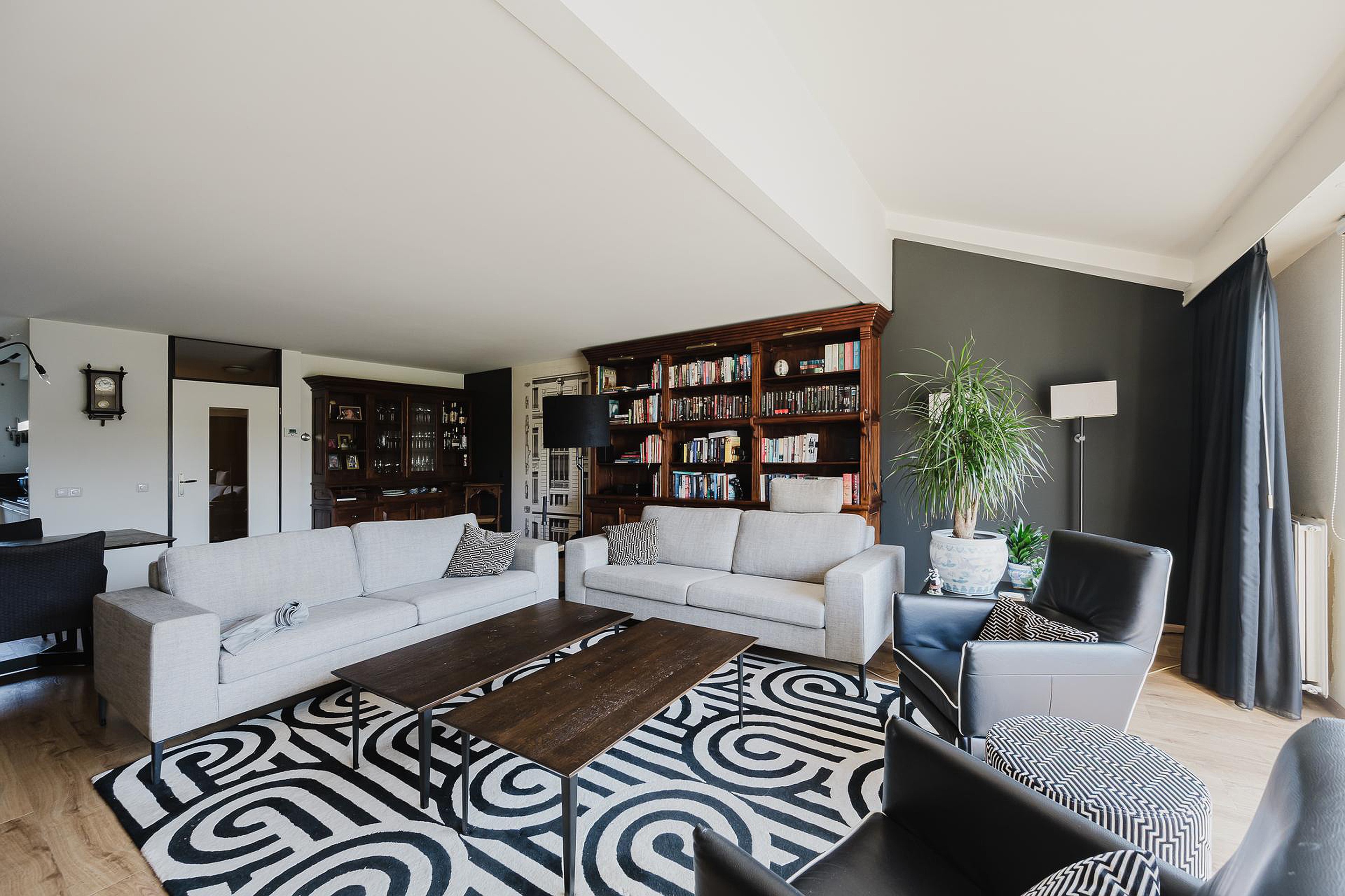 De prachtige lichte woonkamer is voorzien van een laminaatvloer, heeft een spachtelputz wandafwerking en heeft strak gestucte plafonds.