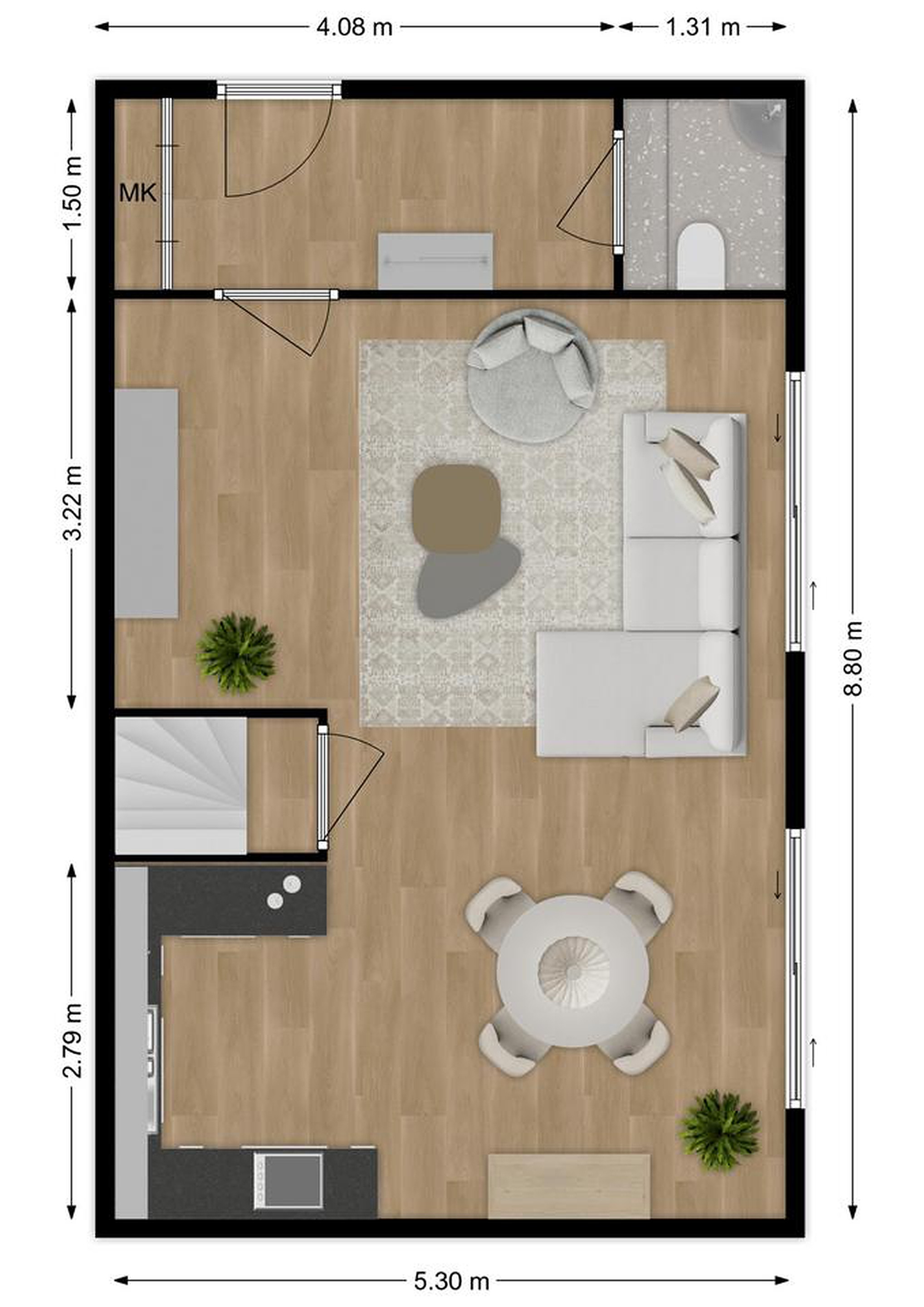 - Woonkamer en keuken: ca. 38 m2