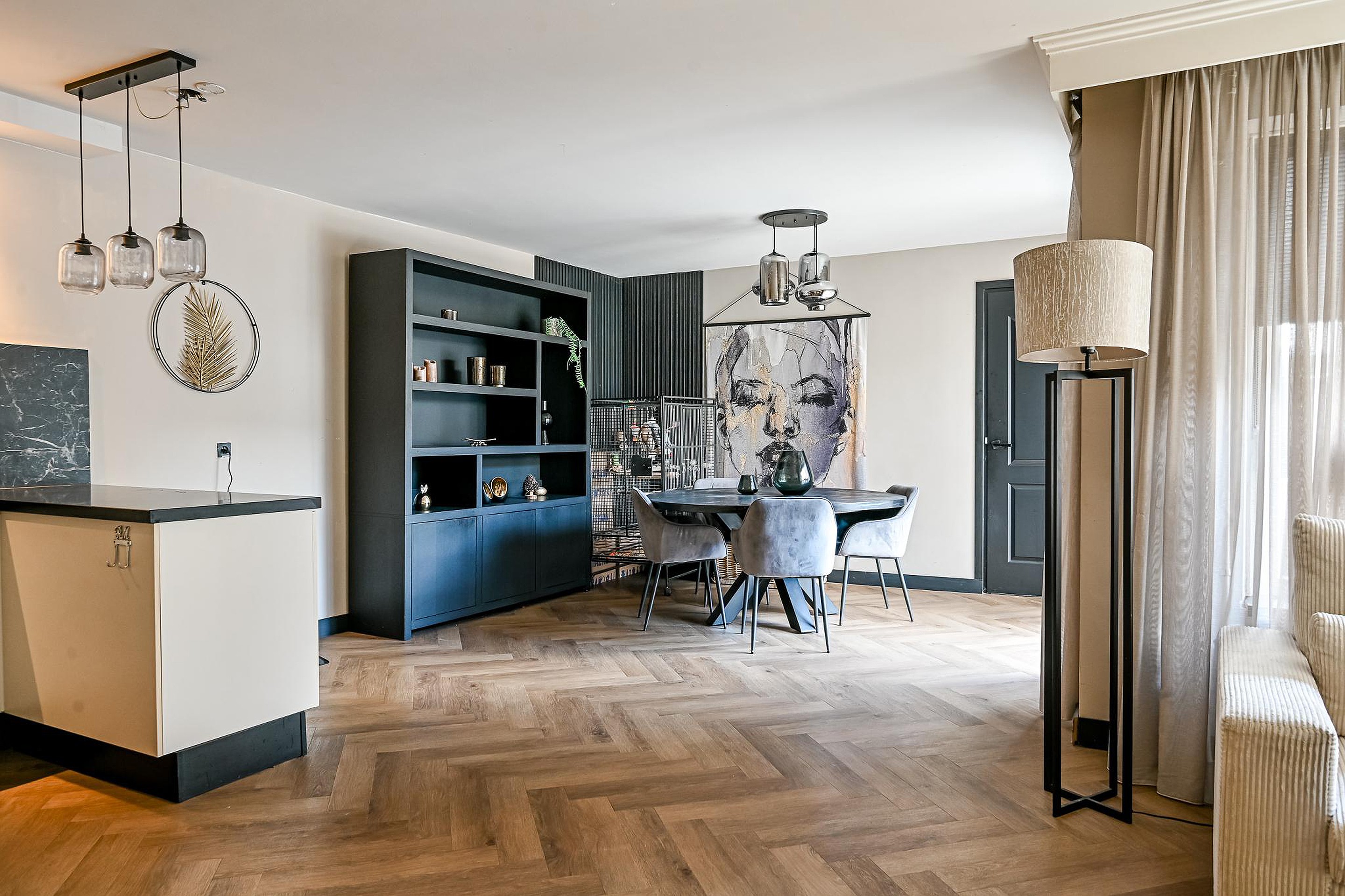 De woonkamer is uitgebouwd en afgewerkt met een visgraat PVC-vloer en vloerverwarming. De grote raampartijen zorgen voor veel lichtinval en via de schuifpui (2024) heb je direct toegang tot de zonnige achtertuin.