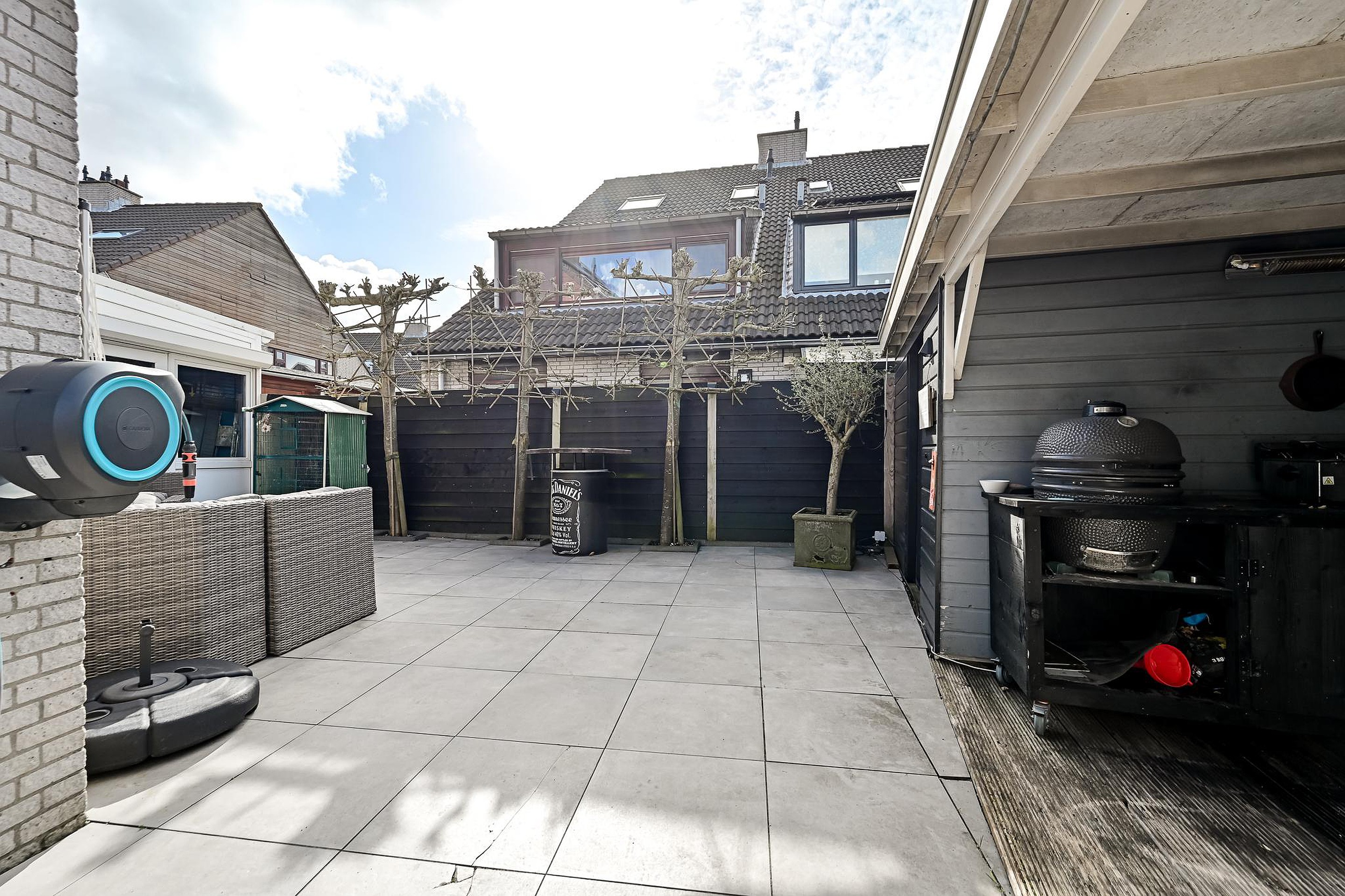 De tuin is verzorgd aangelegd en voorzien van een zonnescherm, overkapping en berging.