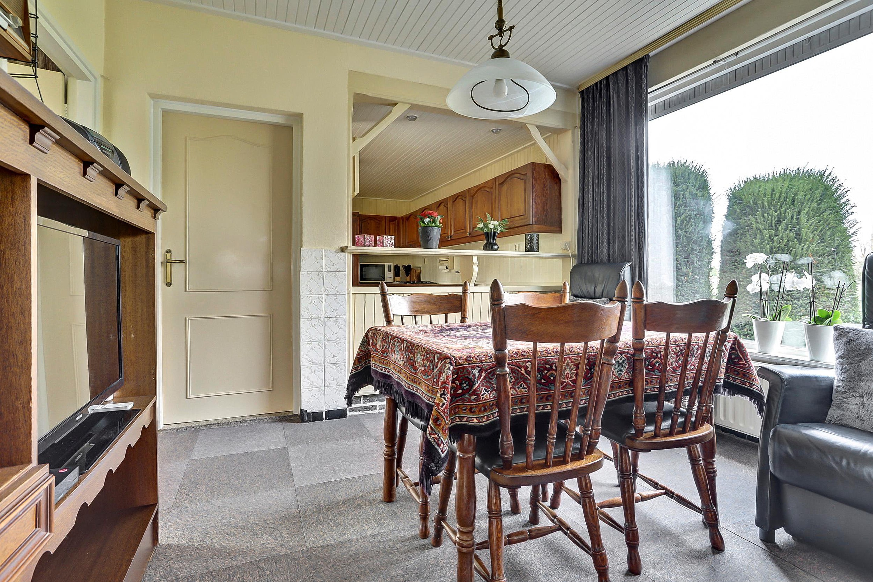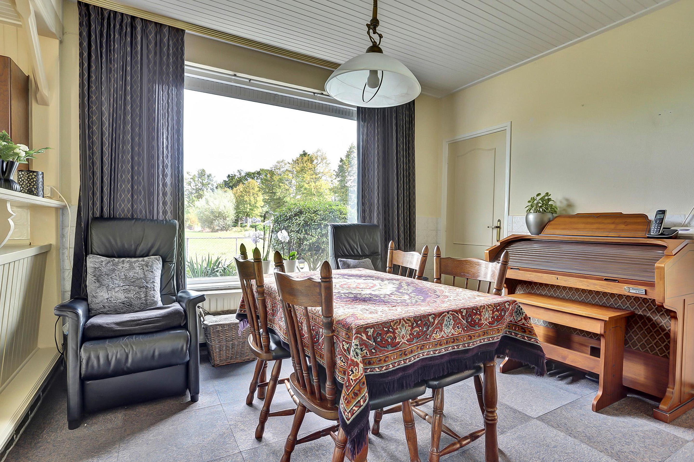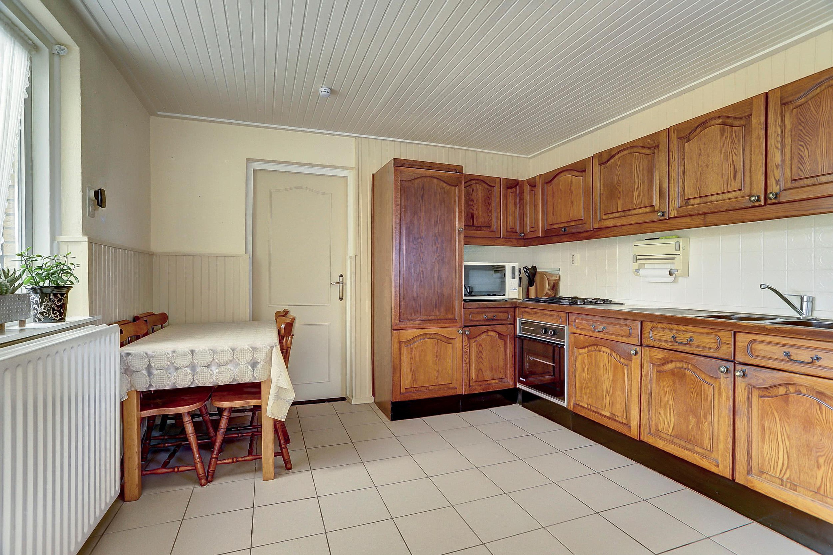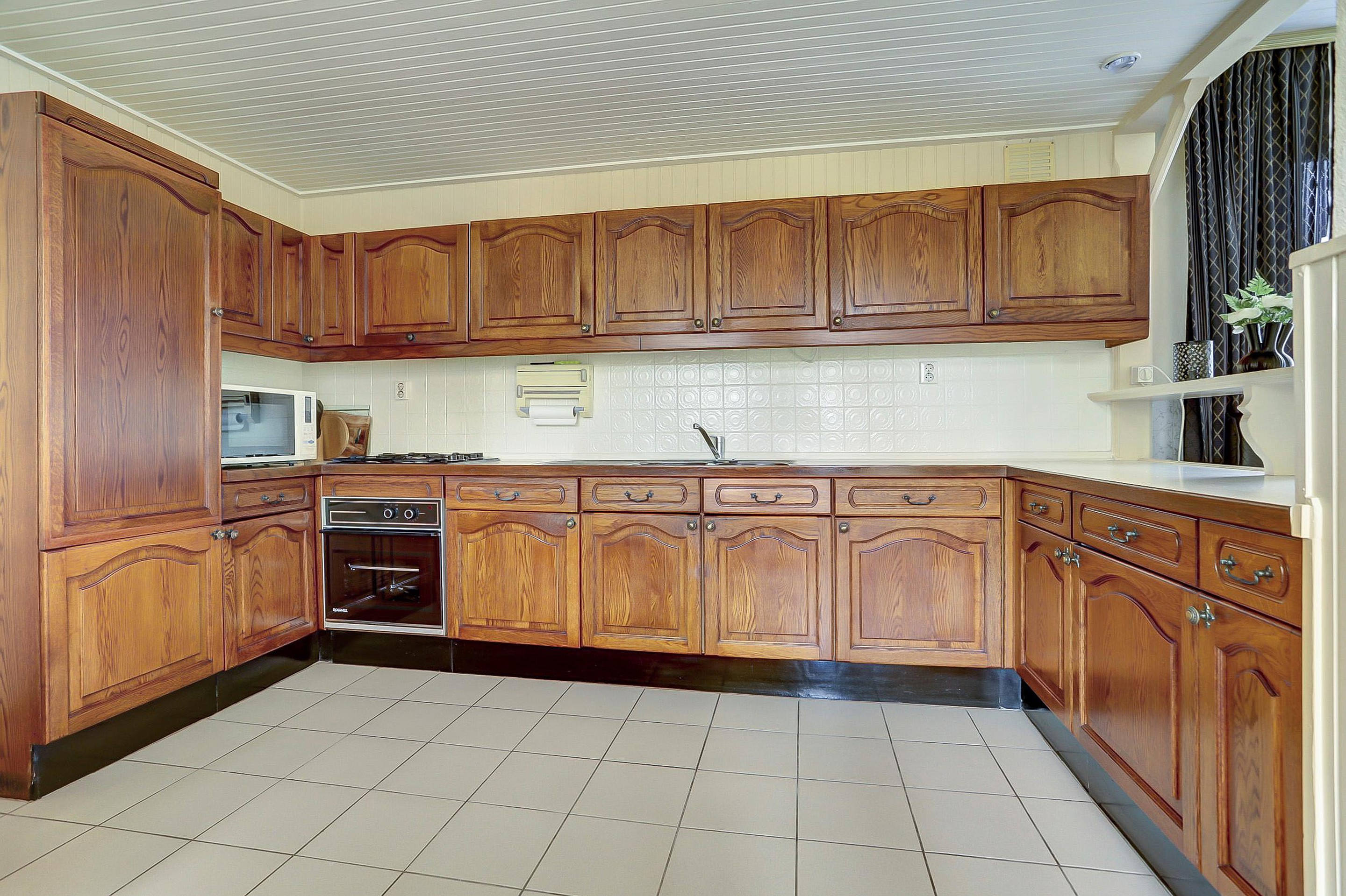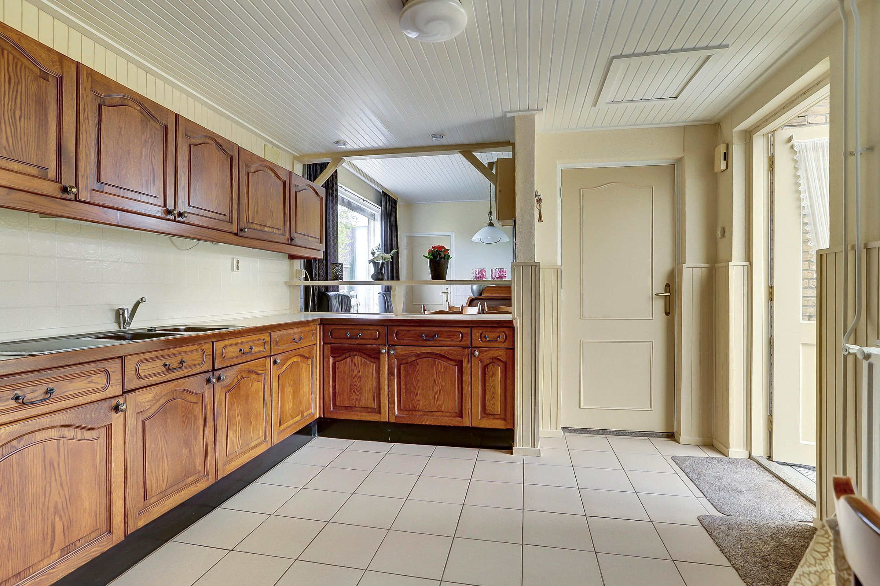 Zoals gebruikelijk hier ga je niet via de voordeur maar langs achter naar binnen. Via de serre kom je in de ruime keuken van ca. 13m2 die in halfopen verbinding staat met de eetkamer. De keuken staat in een U-opstelling en beschikt over veel kastruimte en diverse inbouwapparatuur, waaronder een koelkast, 4-pits gasfornuis, afzuigkap, dubbele spoelbak en oven. Boven de keuken is nog een klein bergzoldertje.