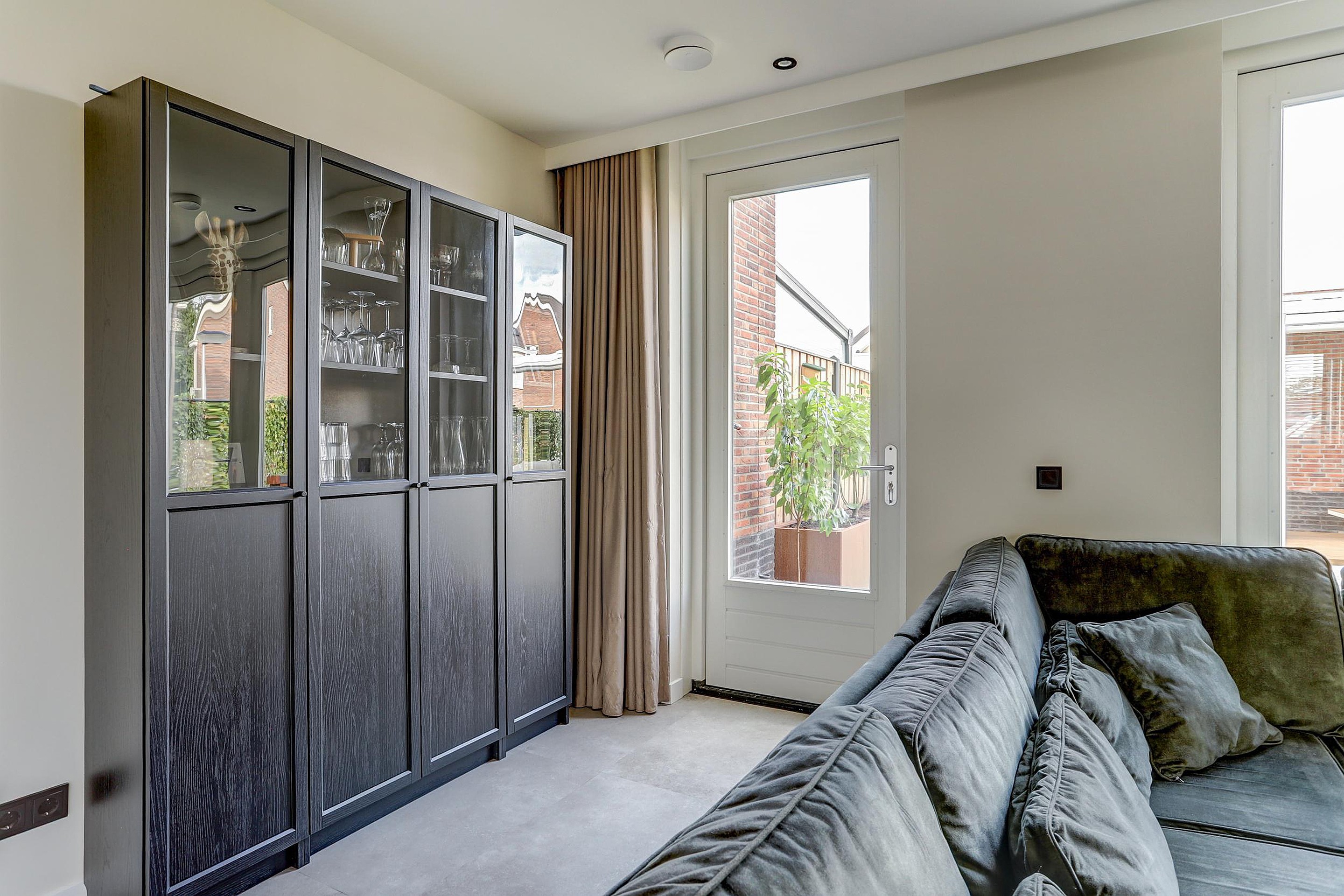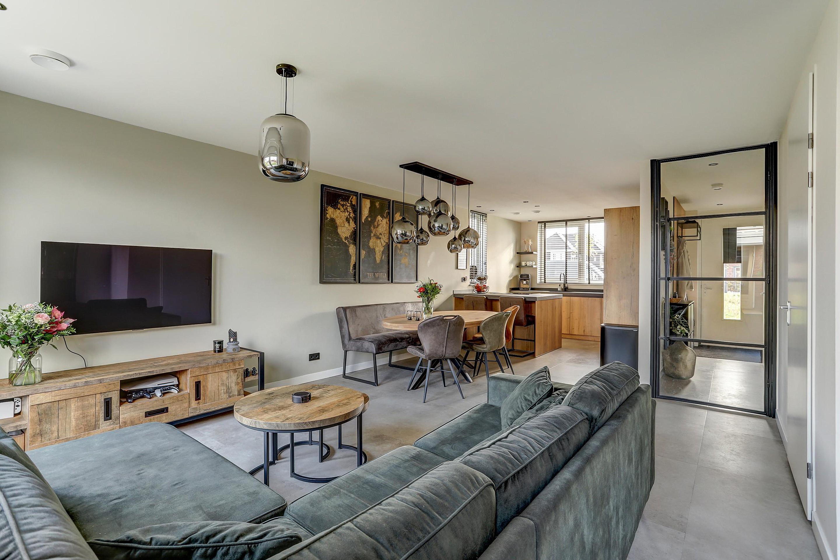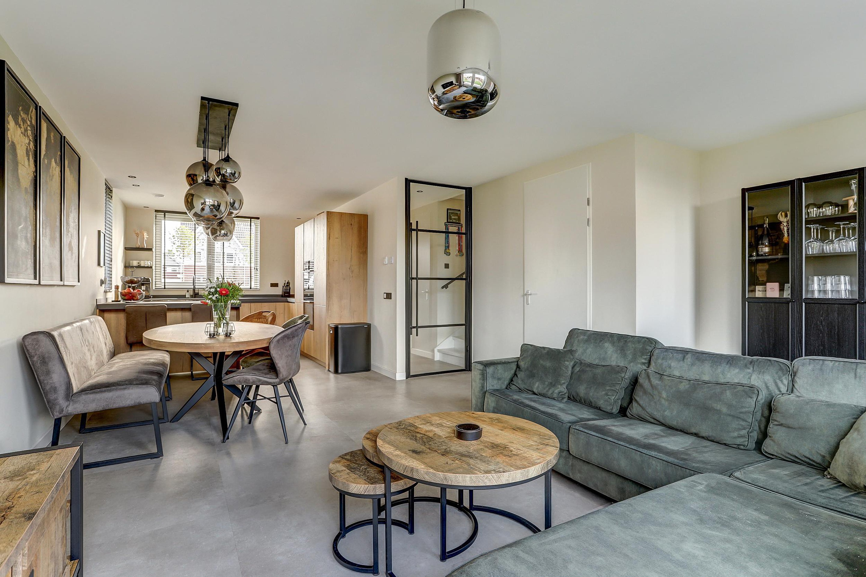 De woonkamer is zeer ruim van opzet en wordt prachtig belicht door meerdere raampartijen, met een gezellige zithoek. Er is voldoende ruimte voor een eethoek en een royale zithoek. De trapkast, waarin de warmtepomp is weggewerkt, draagt bij aan een efficiënte en duurzame verwarming van de woning. Dit zorgt voor een aangenaam binnenklimaat, zonder dat het ten koste gaat van de open uitstraling van de woonkamer.
