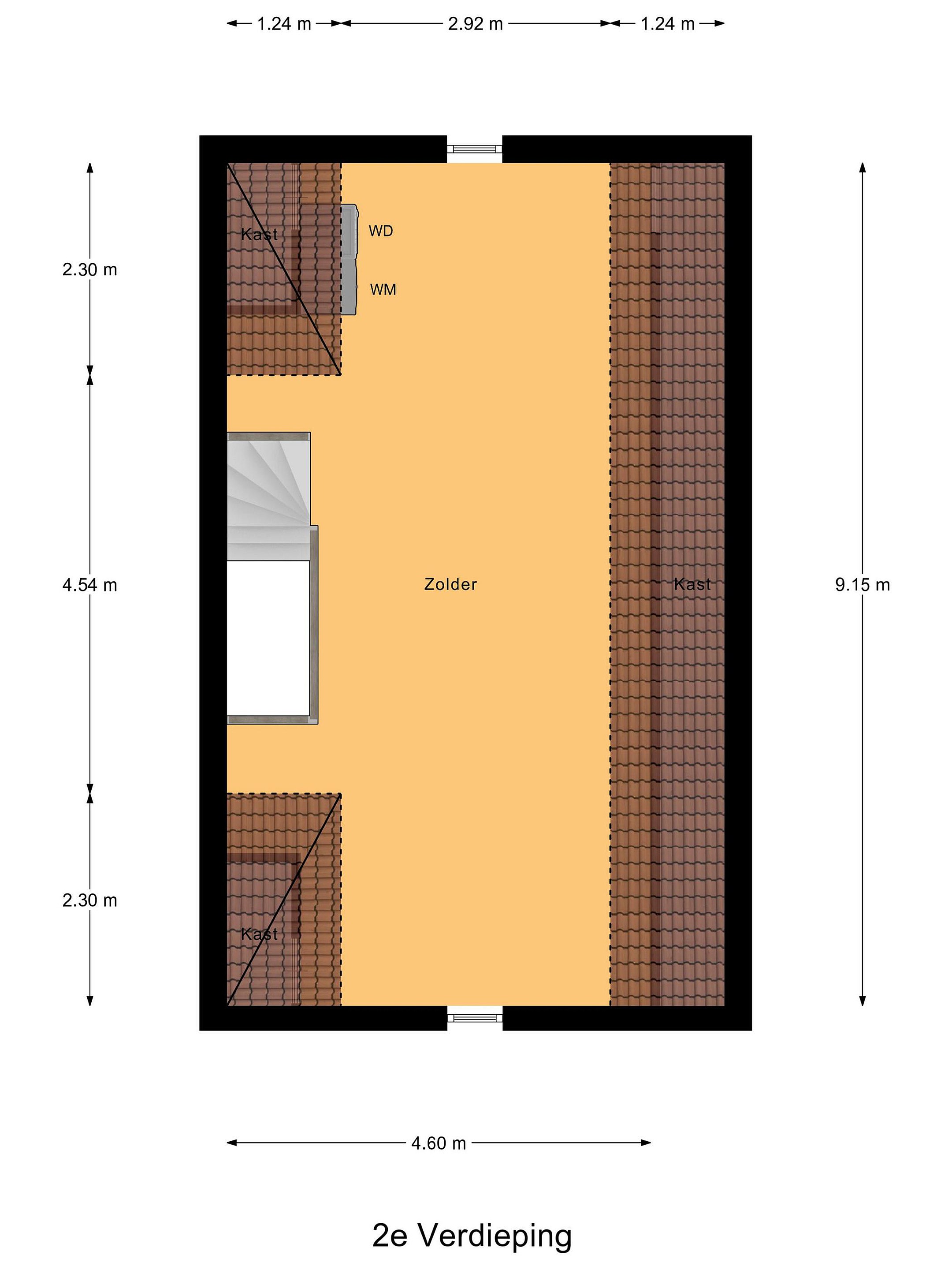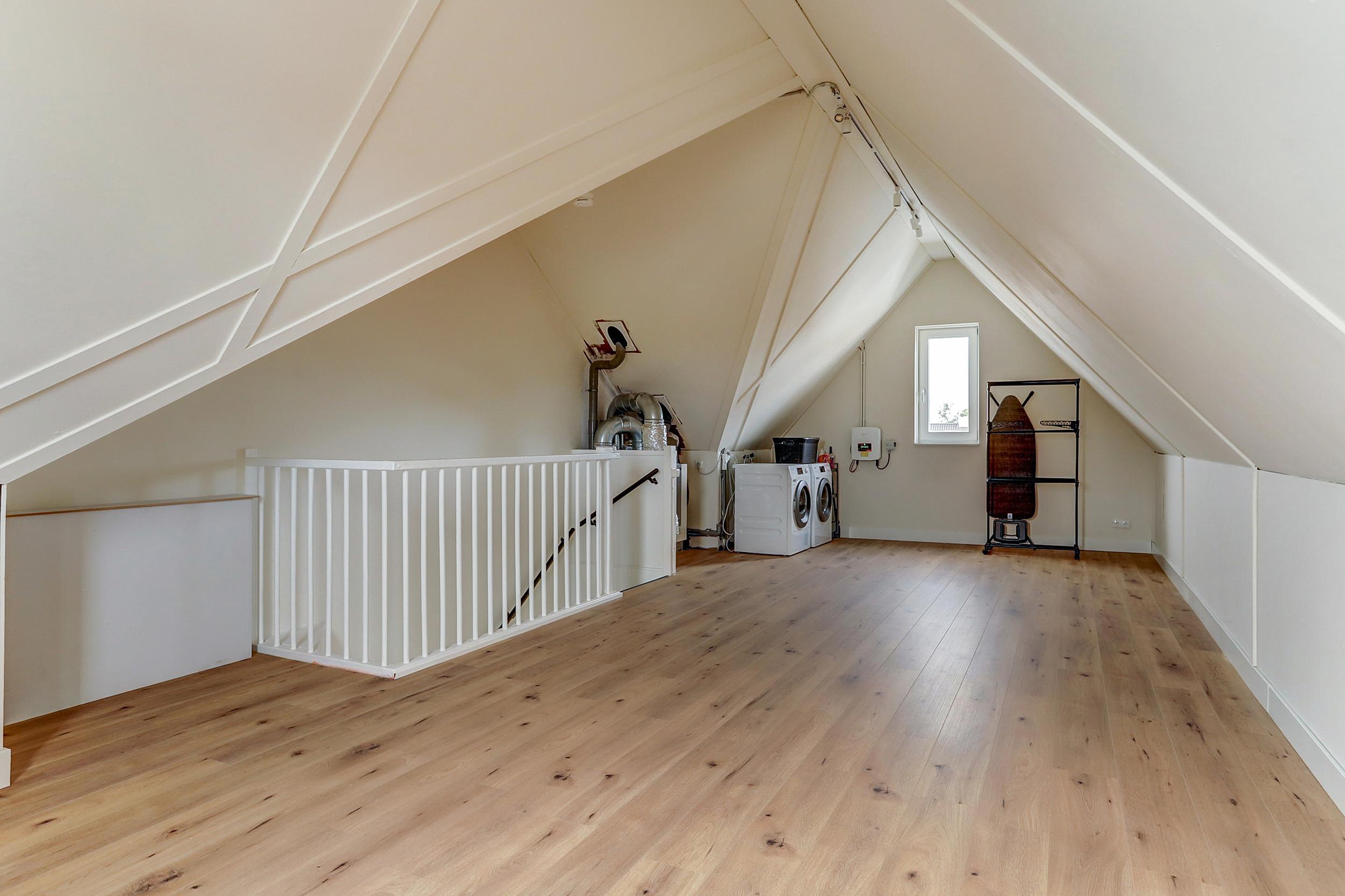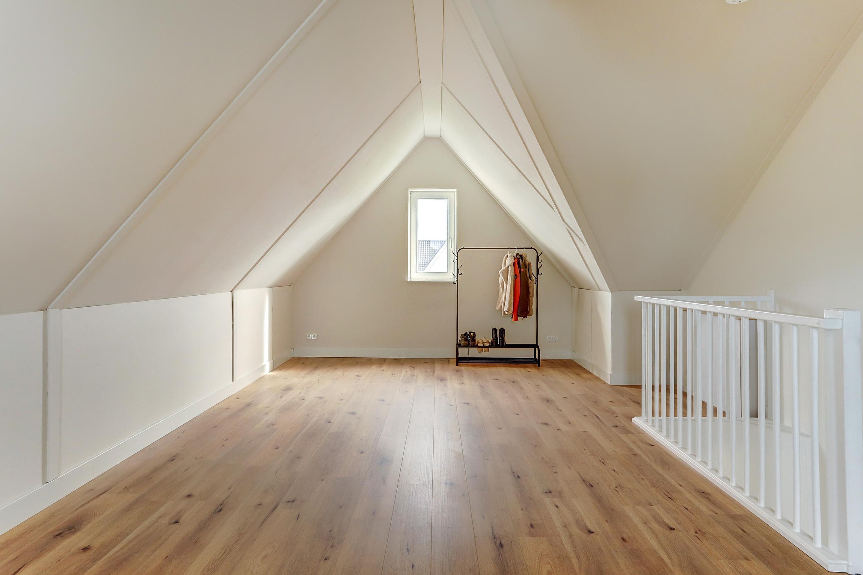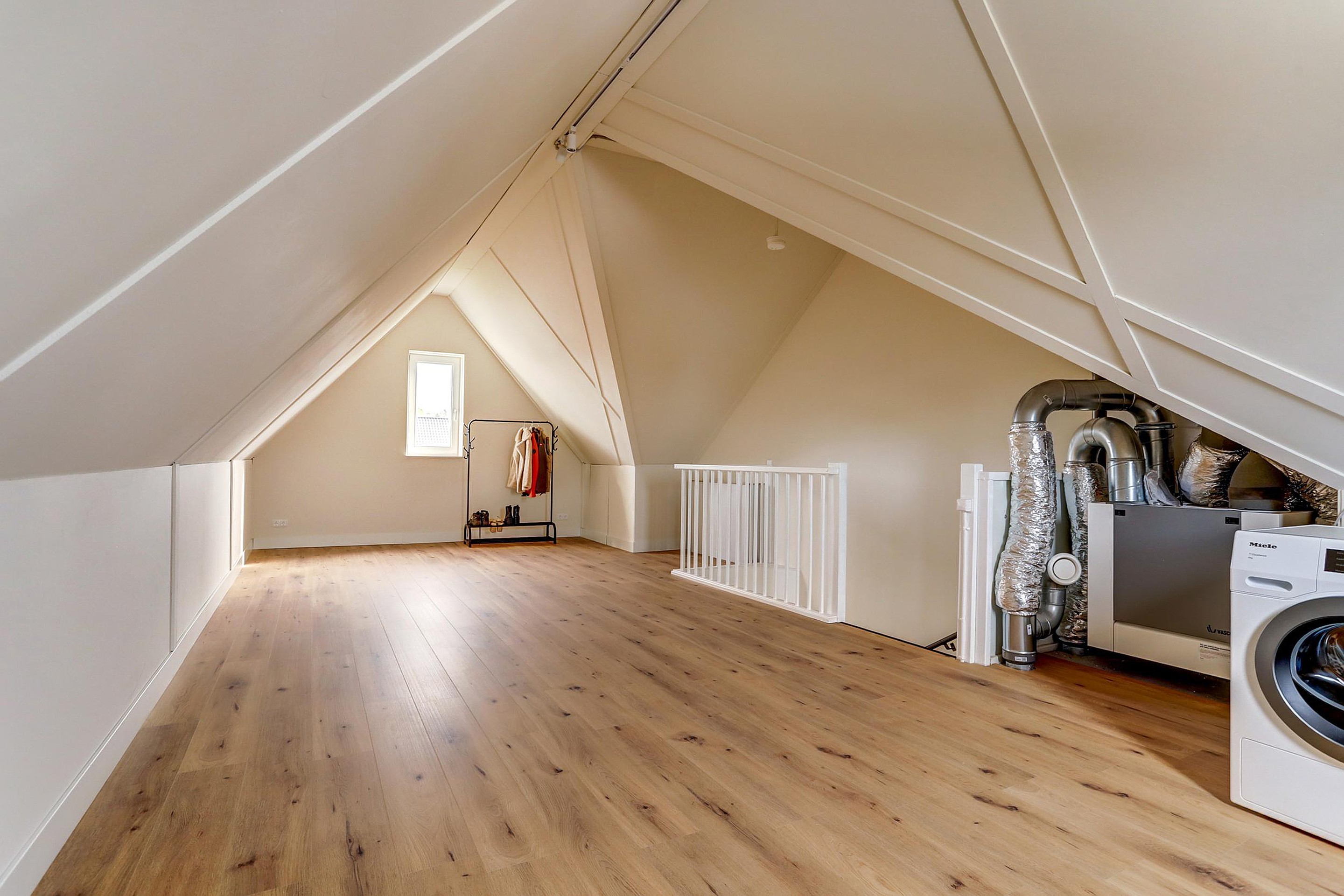 De tweede verdieping biedt verrassend veel extra ruimte. Hier bevinden zich de aansluitingen voor wasmachine en droger, de unit voor balansventilatie en praktische bergruimte achter de knieschotten. Dankzij de grootte en indeling is deze verdieping uitstekend te gebruiken als extra slaapkamer, werkruimte of speelkamer.