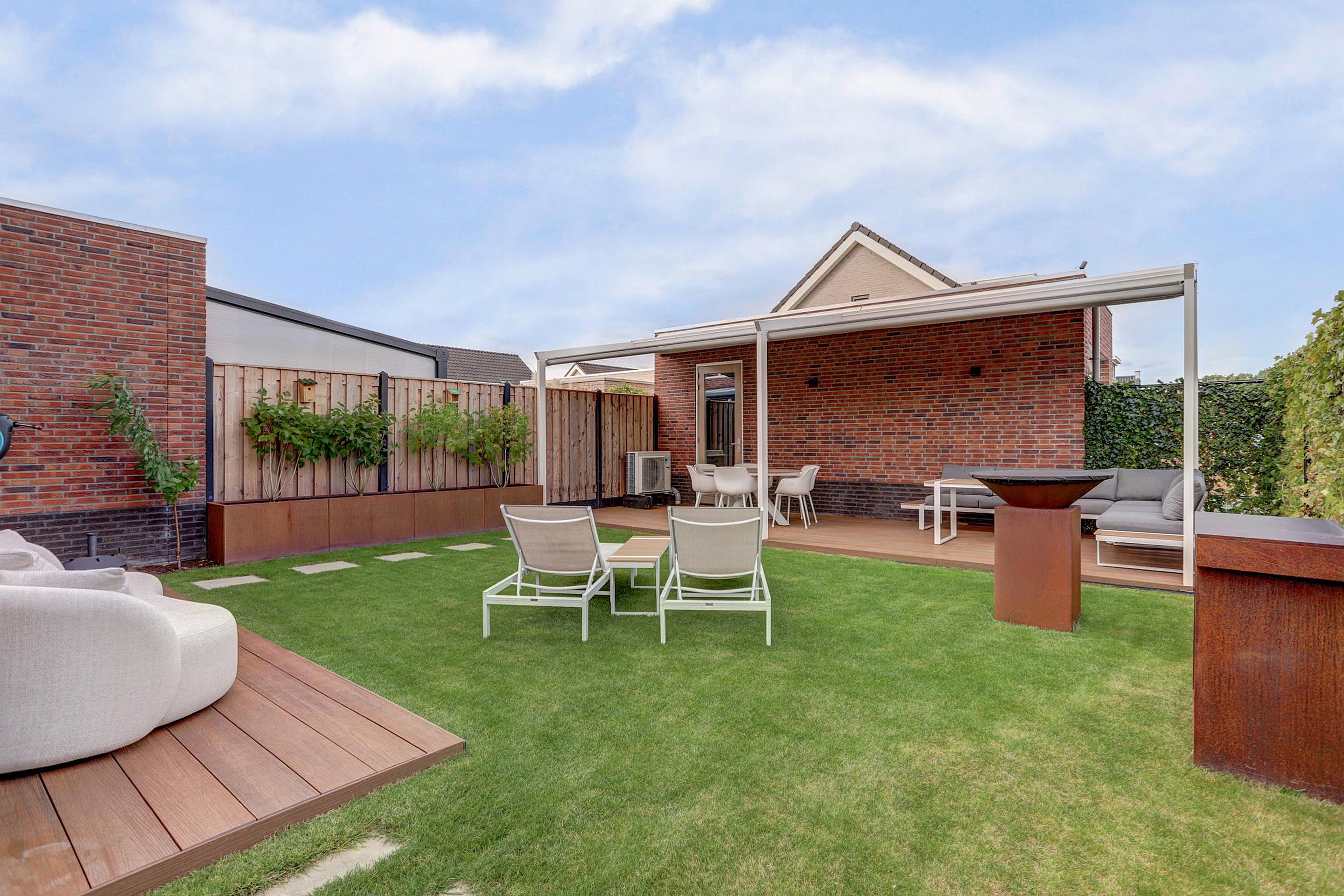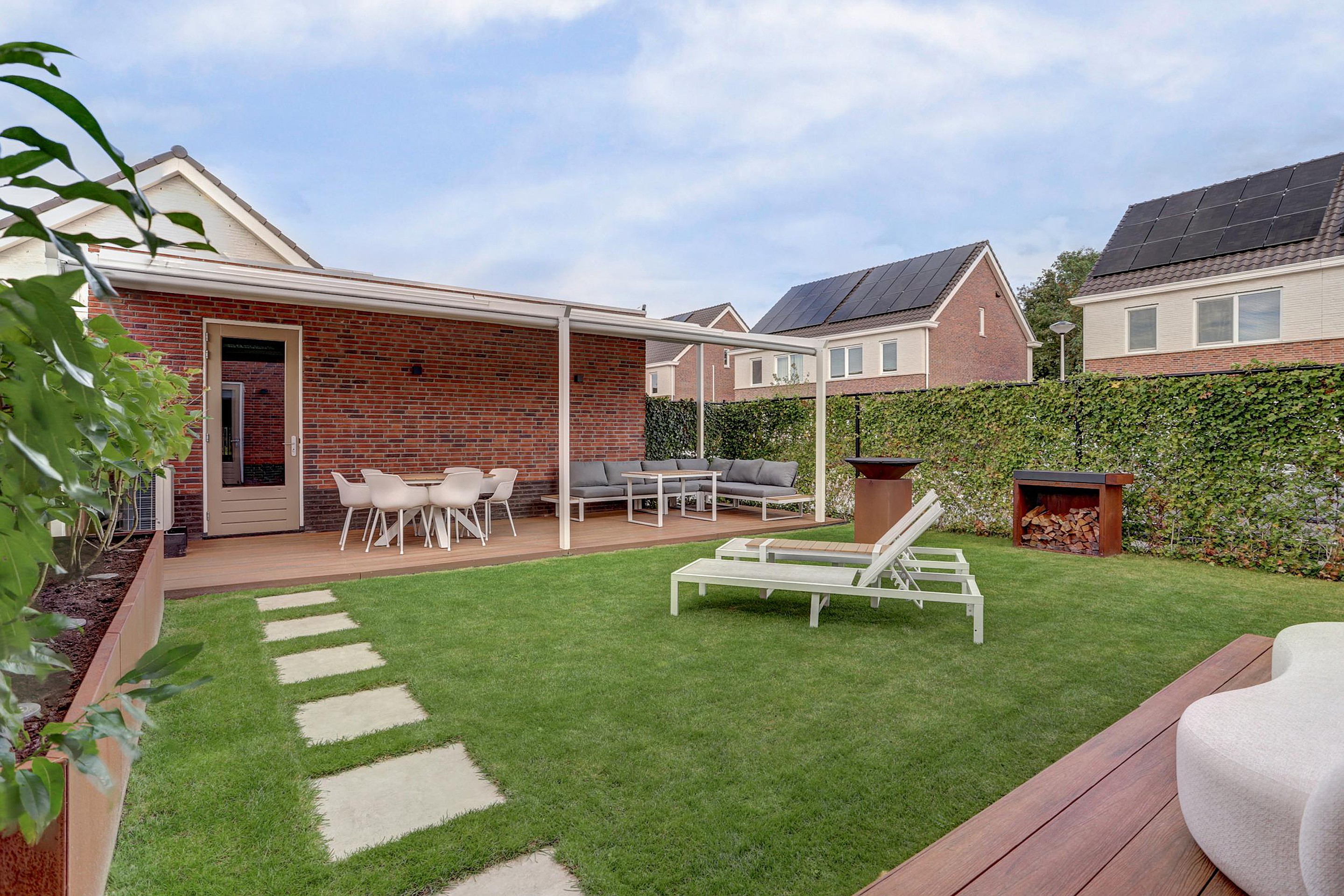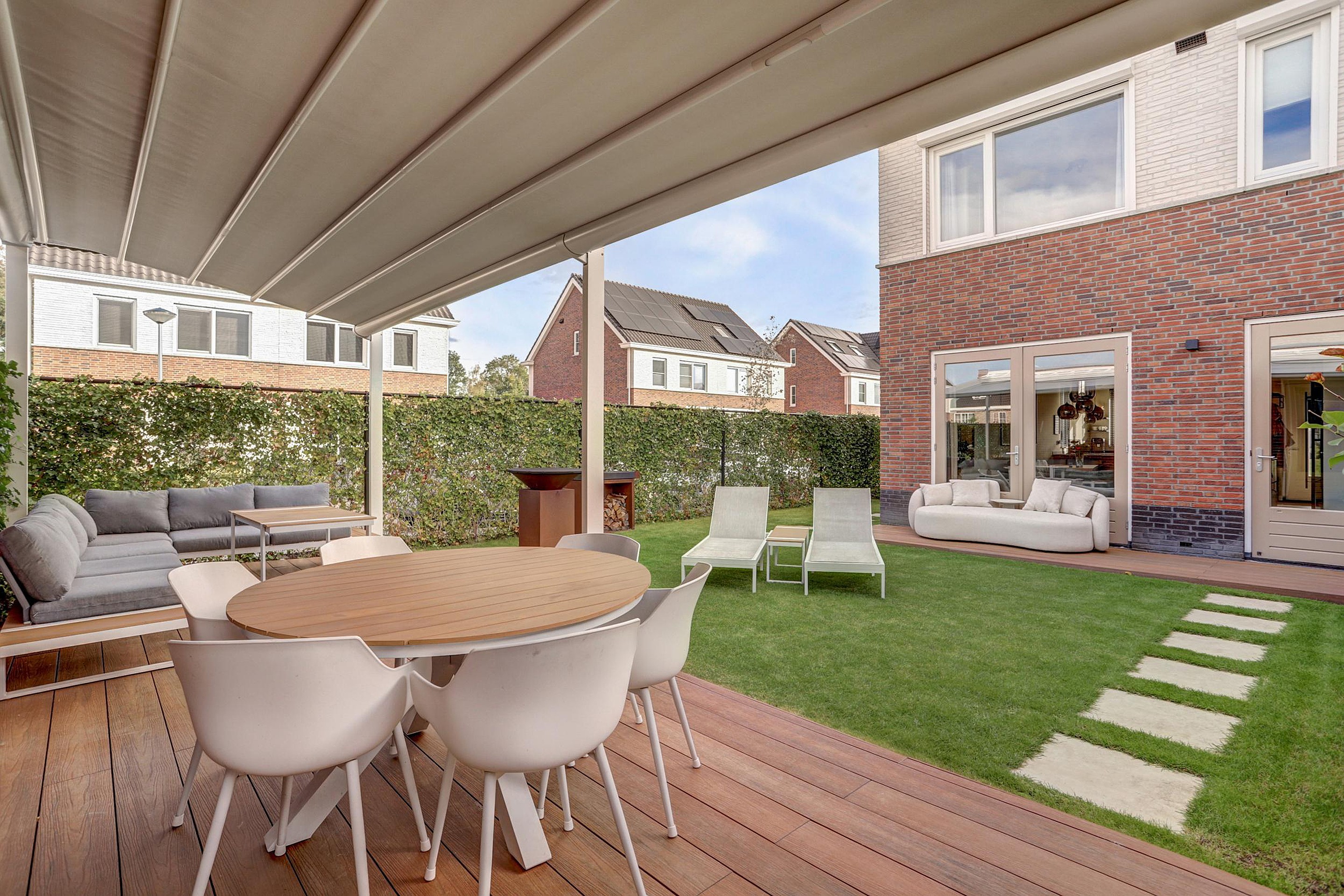Een echte blikvanger is de elektrisch bedienbare overkapping, waarmee u eenvoudig beschutting creëert tegen felle zon of een zomers buitje. Of u nu wilt ontspannen met een goed boek, dineren met familie of vrienden, of simpelweg tot rust komen in uw eigen buitenruimte: deze tuin biedt het allemaal.