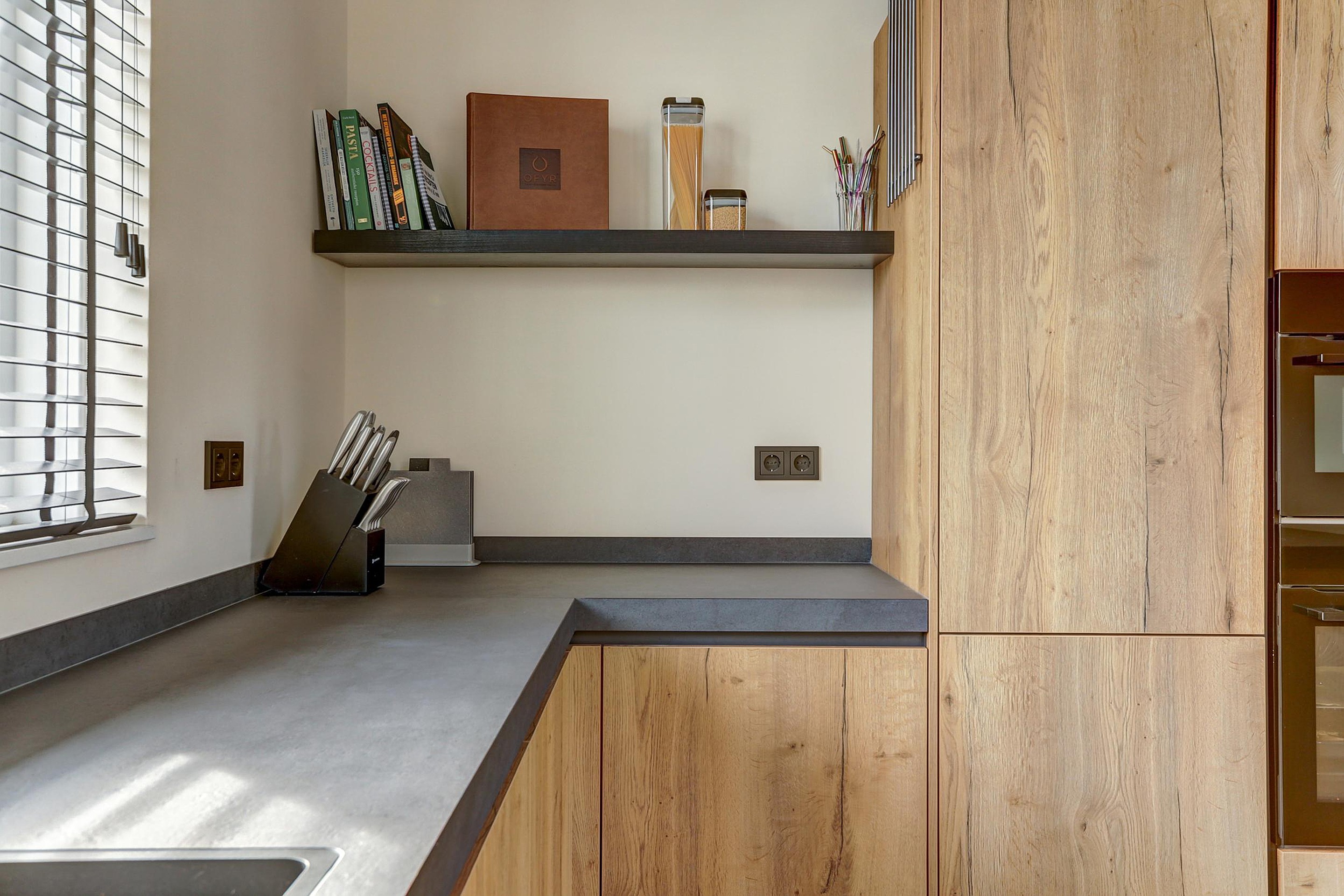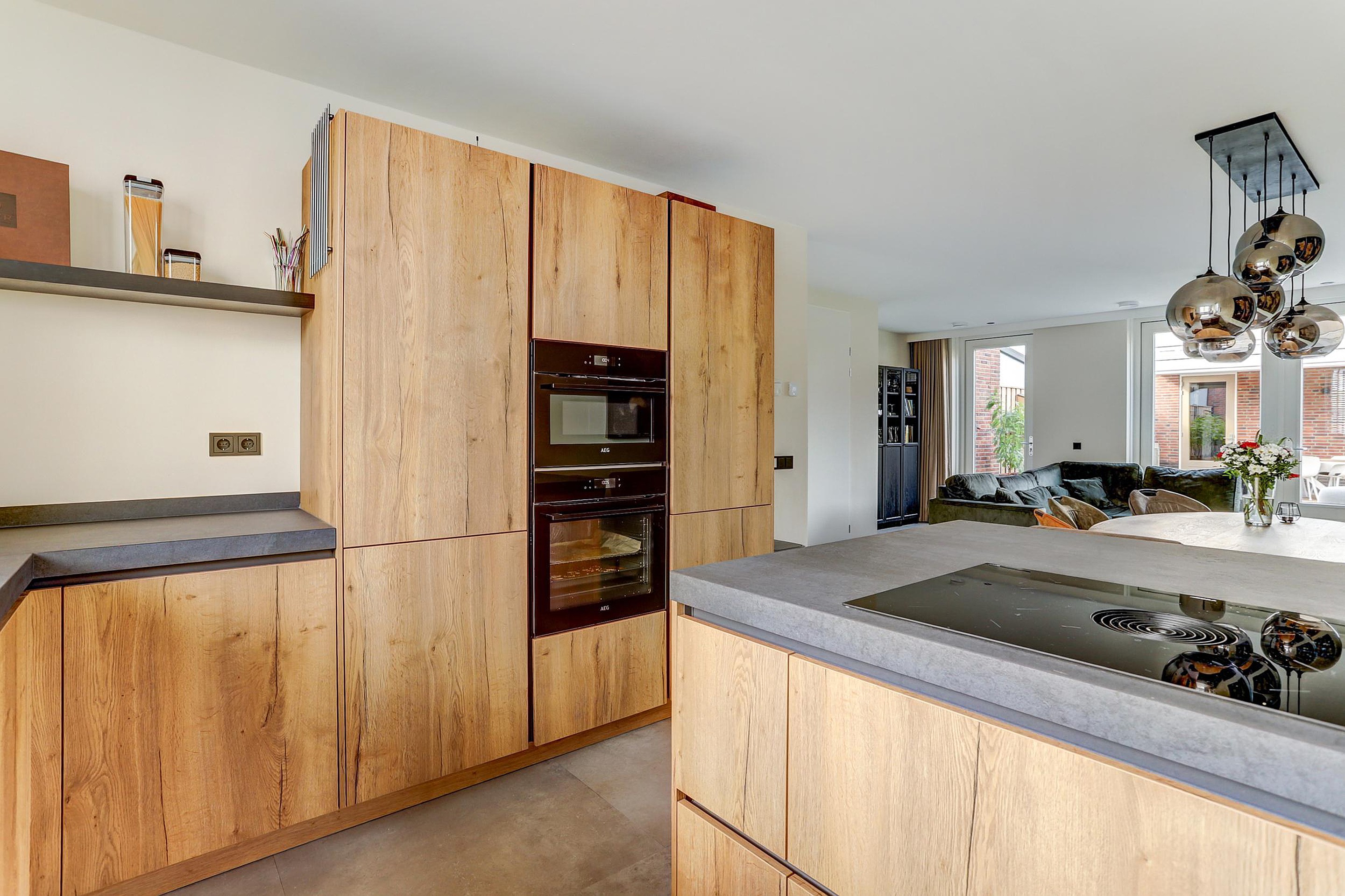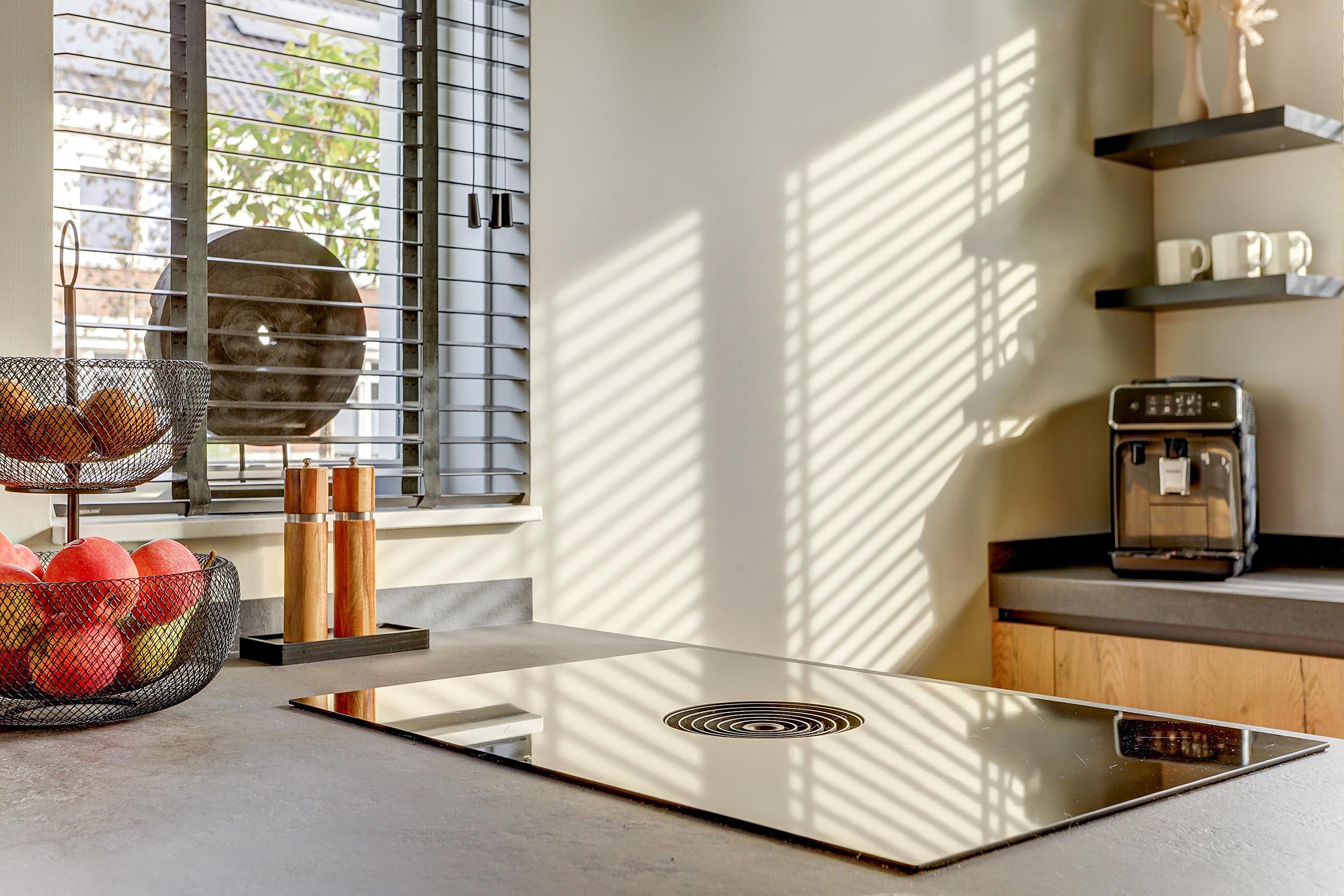 Uitgevoerd in een strak design en met hoogwaardige materialen, is deze keuken van alle gemakken voorzien. De inductiekookplaat met geïntegreerde afzuiging zorgt voor een open, ruimtelijk gevoel zonder hinderlijke afzuigkap. Daarnaast beschikt de keuken over een oven en een magnetron, een ingebouwde vaatwasser en een royale koelkast. Dankzij de slimme indeling van kasten en lades is er volop opbergruimte, waardoor alles altijd netjes en overzichtelijk blijft.