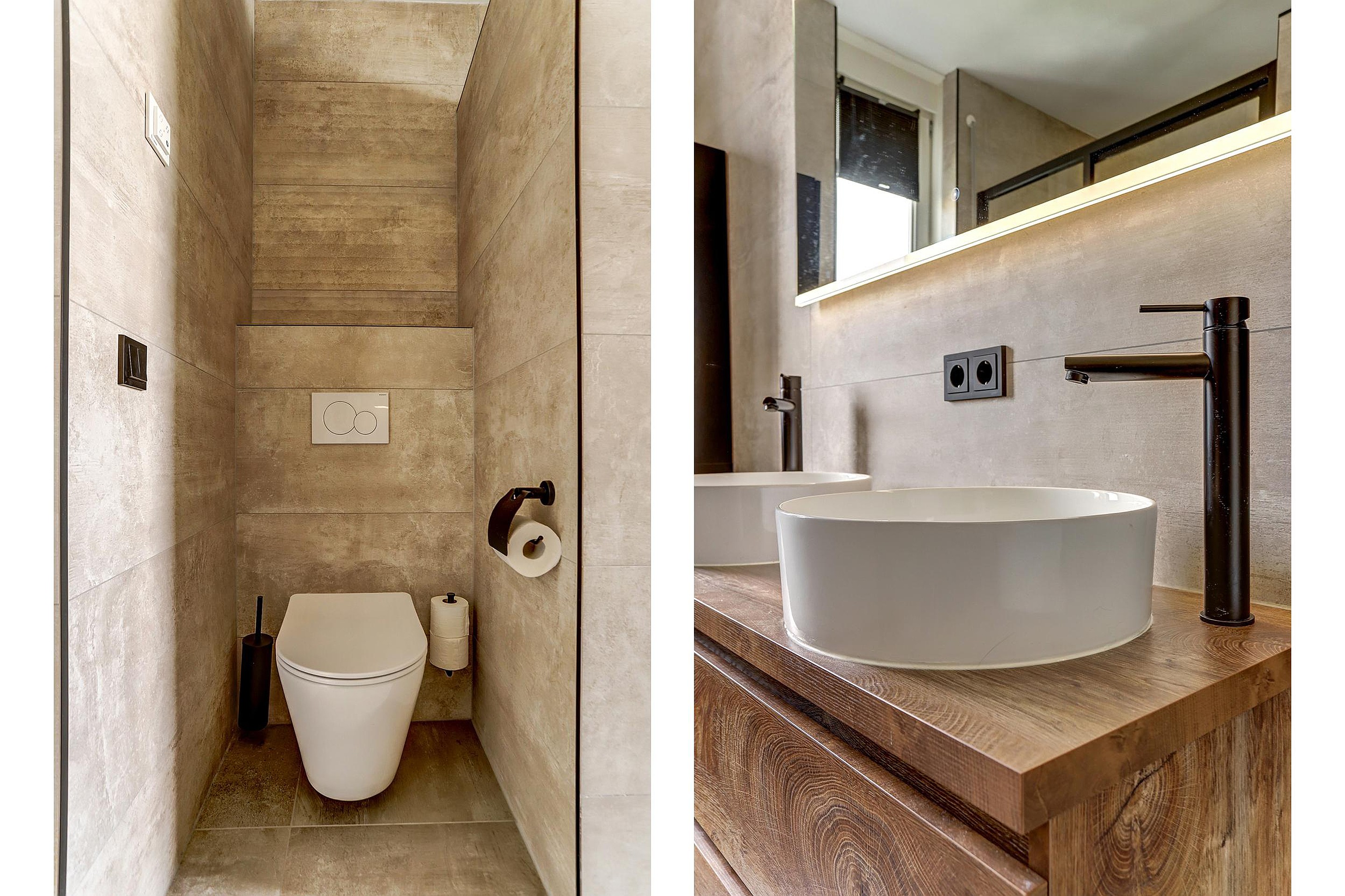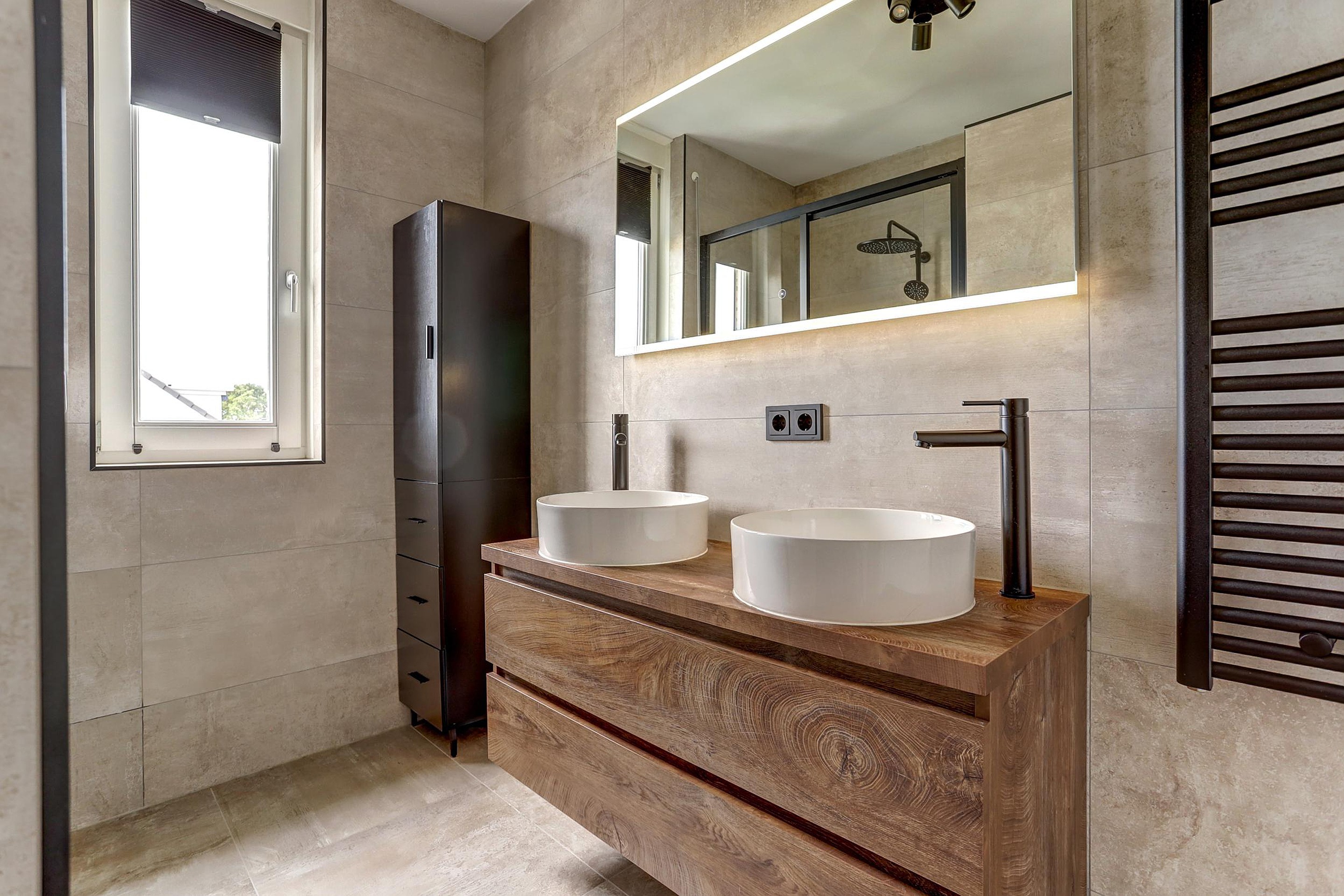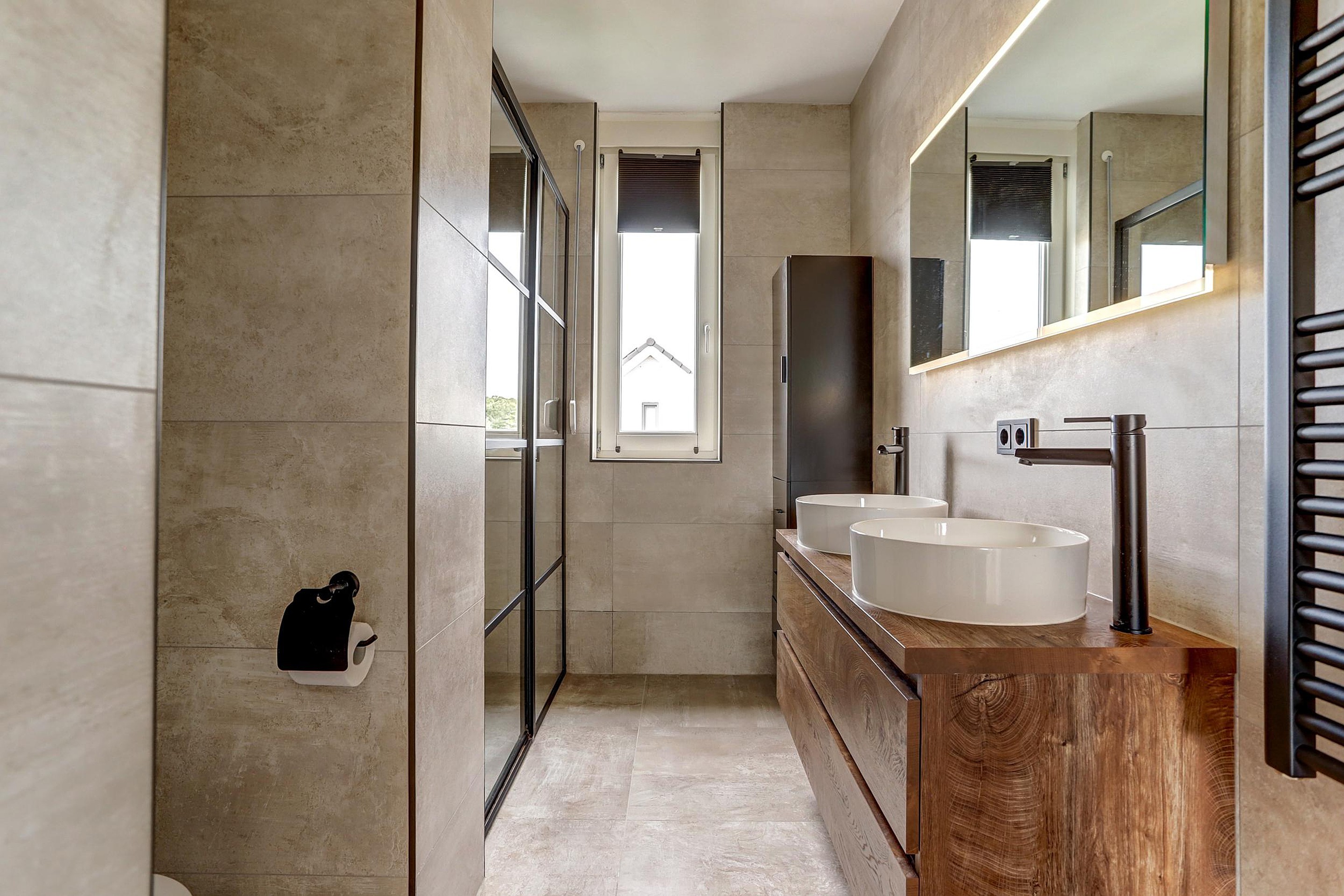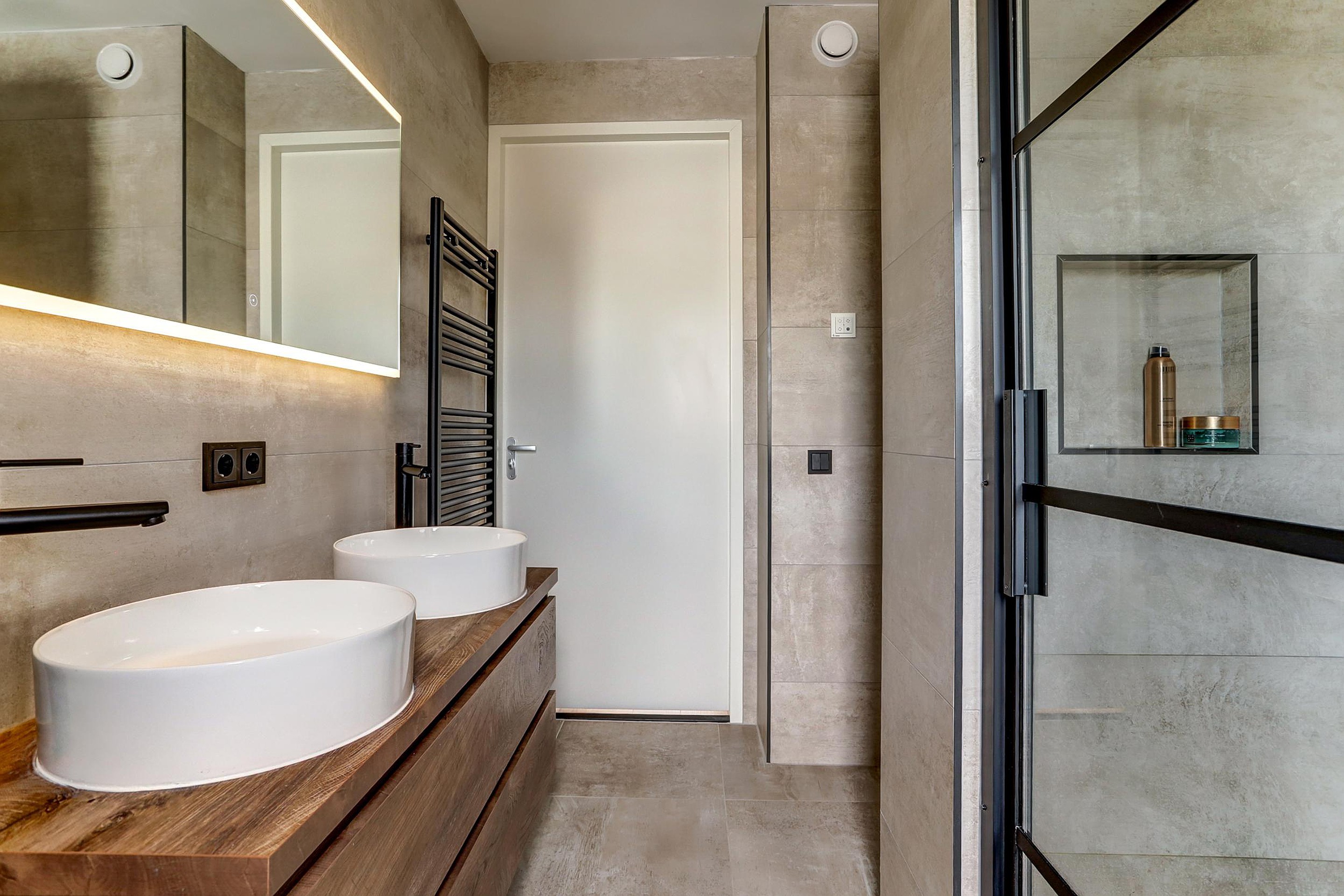 De badkamer is modern afgewerkt en voorzien van een inloopdouche, een wastafelmeubel met dubbele waskommen en een toilet. Een heerlijke plek om even tot rust te komen.