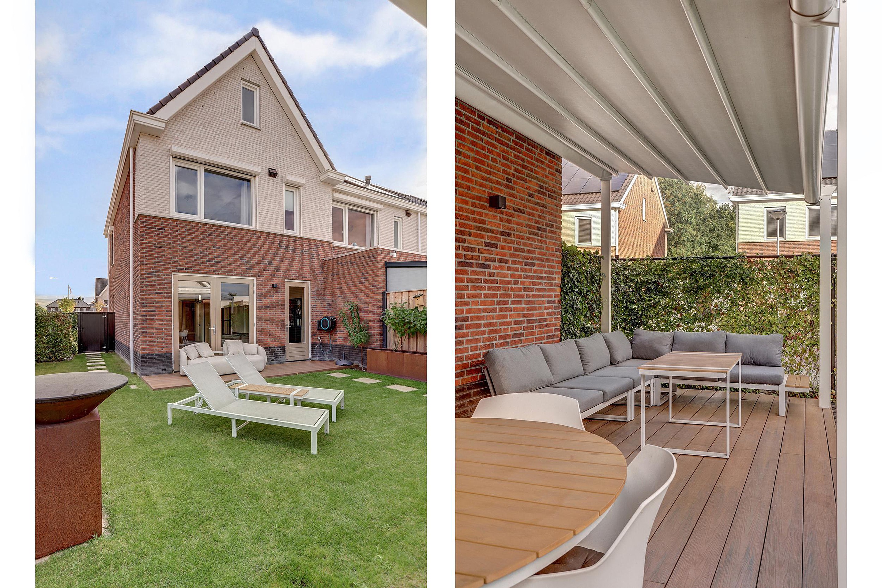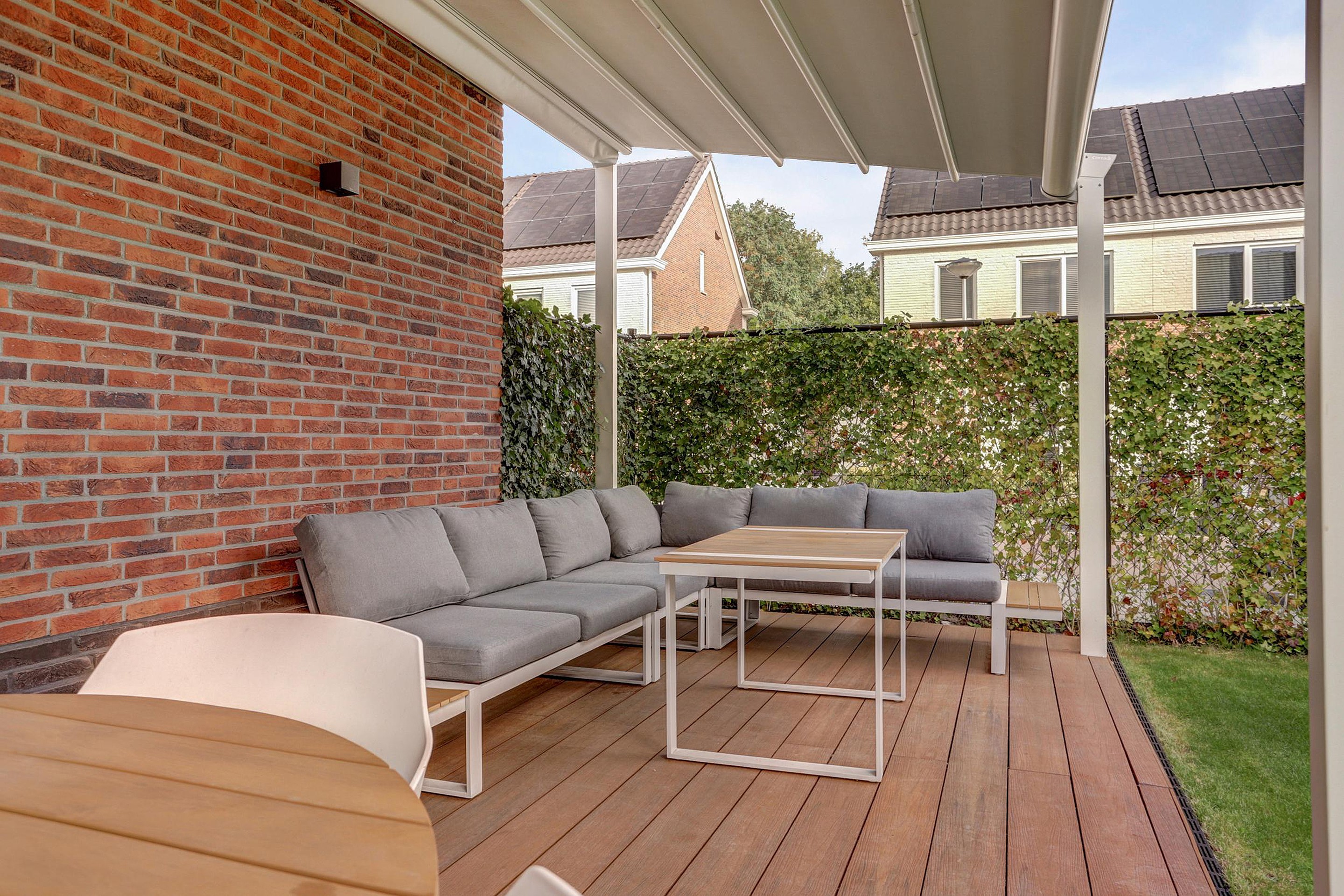 De openslaande tuindeuren zorgen voor veel natuurlijk licht en biedt directe toegang tot de tuin. De overkapping biedt beschutting tegen regen of felle zon, waardoor u het hele jaar door van uw buitenruimte kunt genieten.