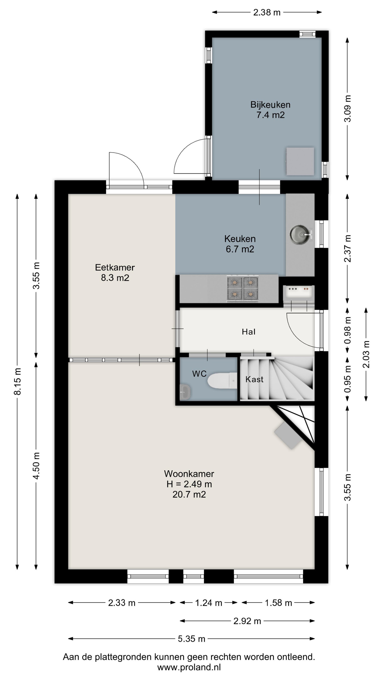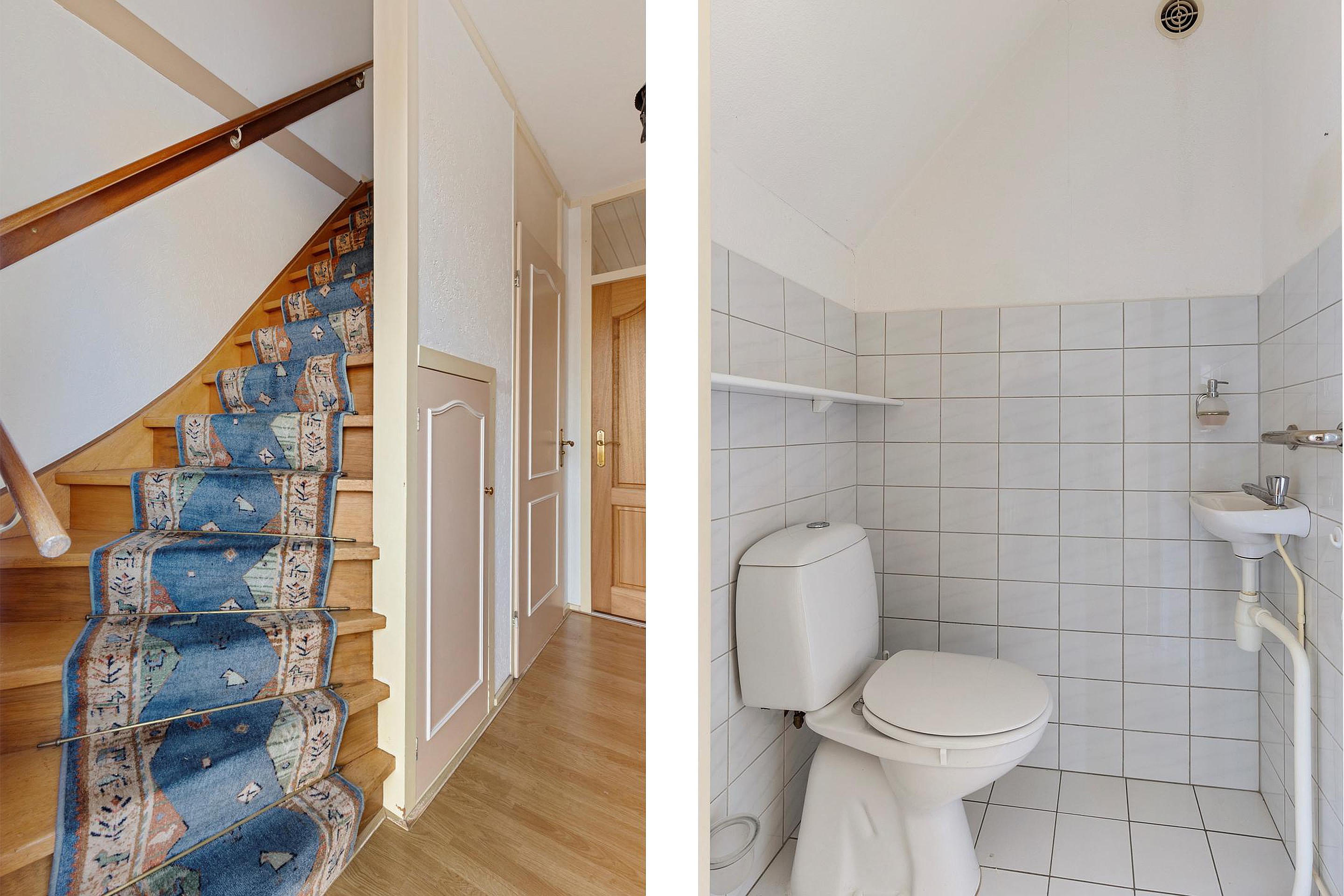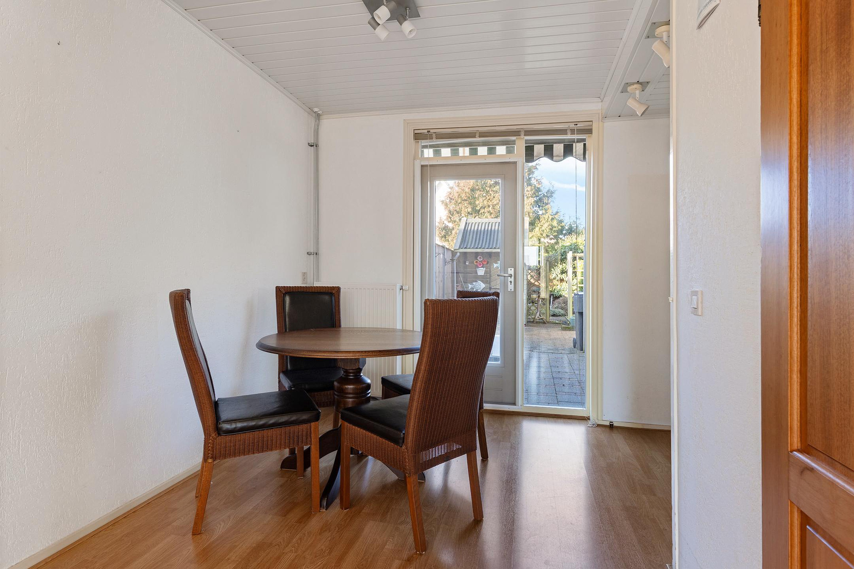 Via de zijentree kom je in de hal met trapopgang en toilet. Vanuit de hal bereik je de woonkamer met veel lichtinval. Aansluitend bevindt zich de eetkamer met deur naar tuin en halfopen keuken voorzien van diverse inbouwapparatuur. Vanuit de keuken is er toegang tot de bijkeuken met aansluiting voor de wasmachine en een deur naar de tuin.