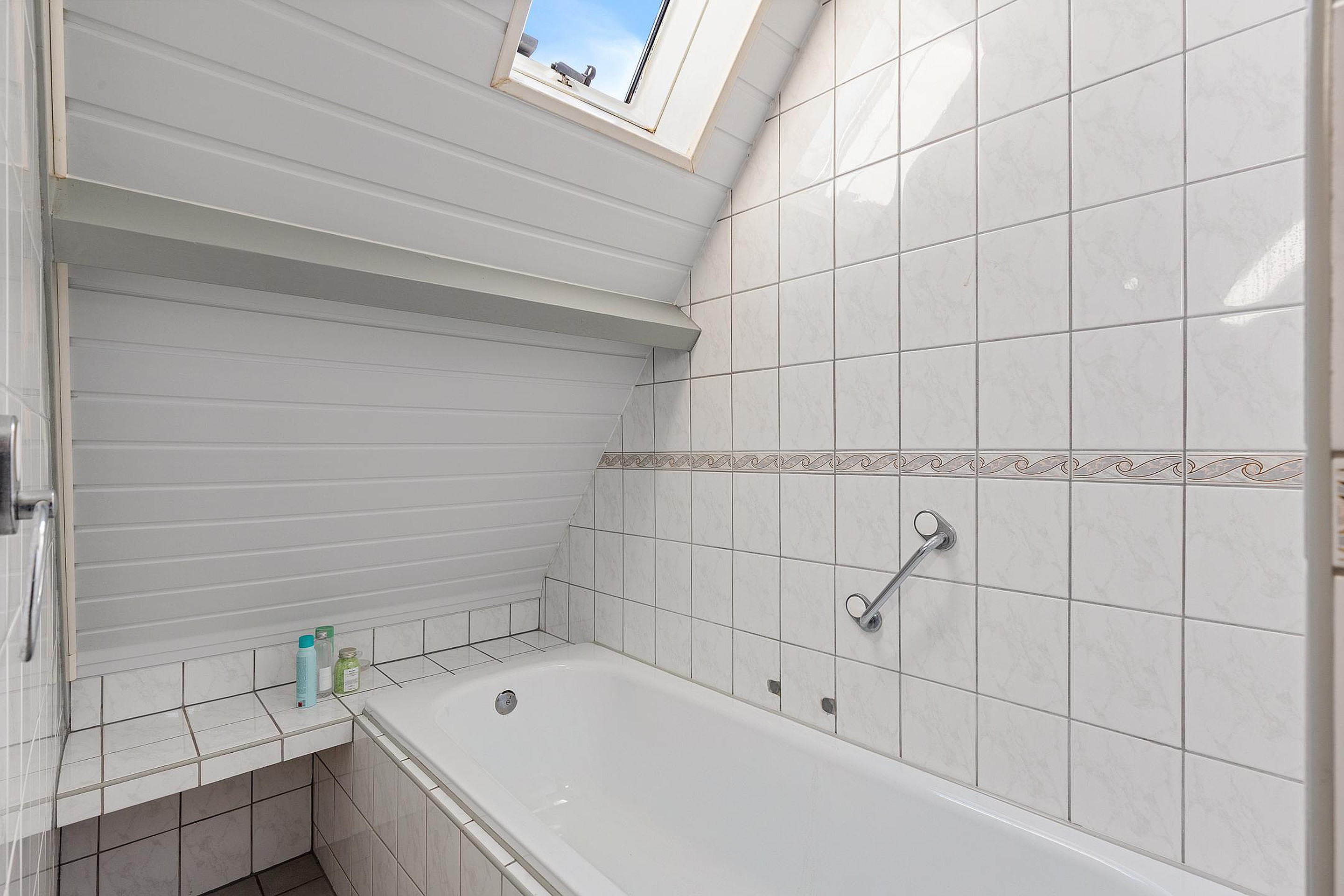 De overloop geeft toegang tot drie slaapkamers en badkamer. De grootste slaapkamer is voorzien van een dakkapel en de andere slaapkamers hebben Velux dakramen. De badkamer is ingericht met een wastafelmeubel, douche en ligbad.