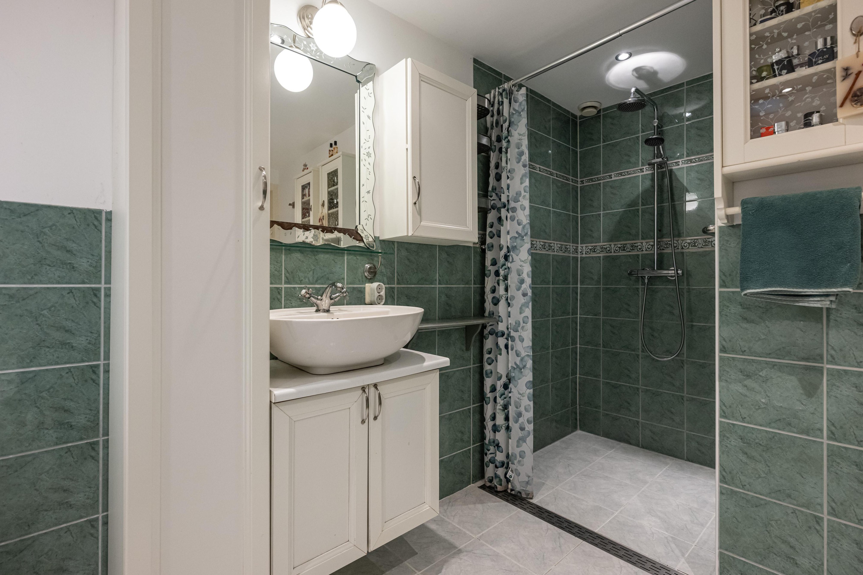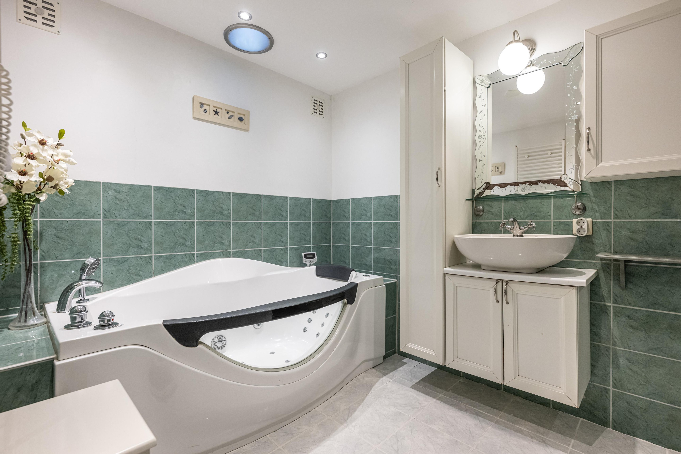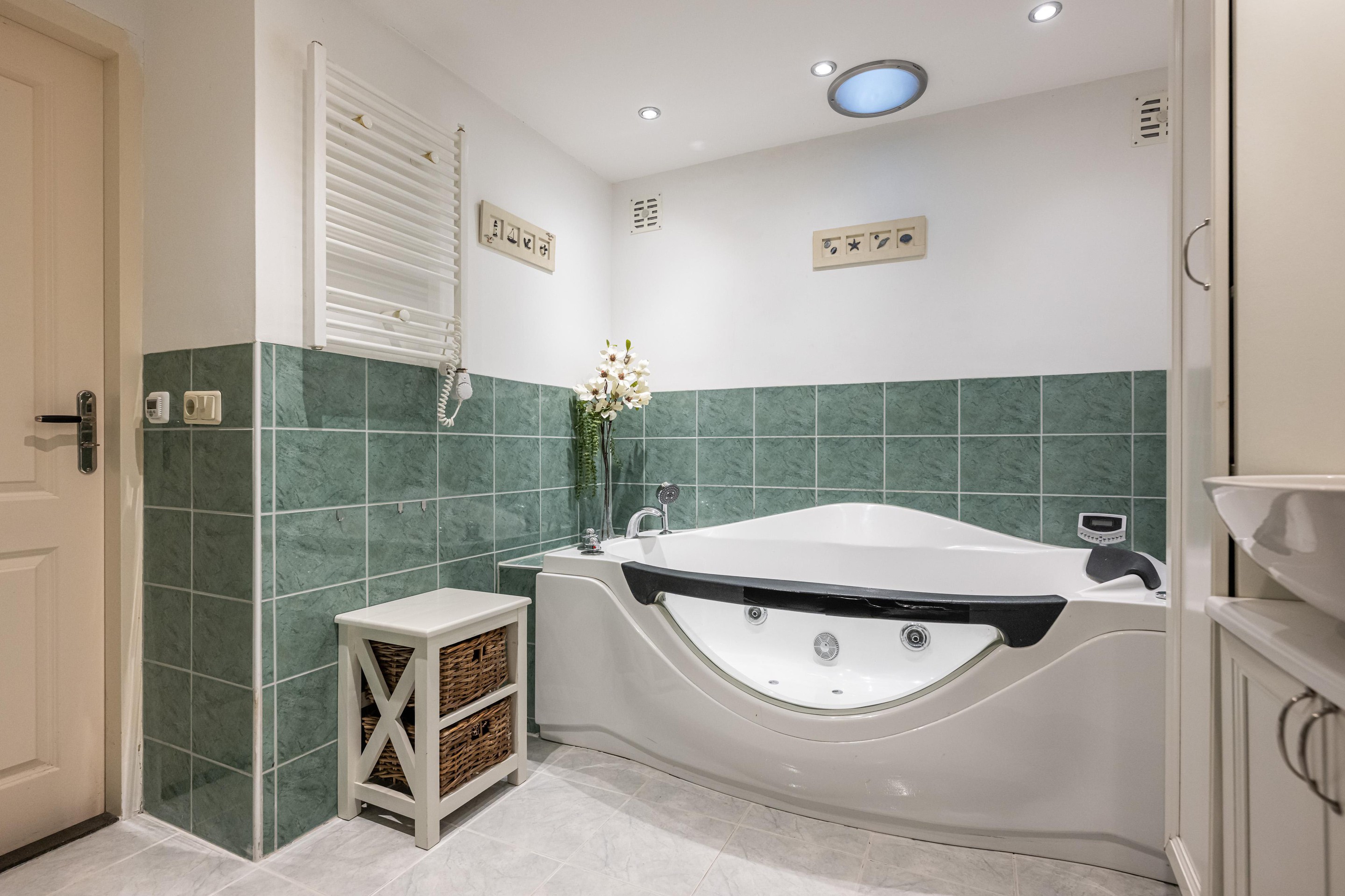 Elektrische vloerverwarming, ligbad, douche, wastafel met meubel, spiegel, spots in het plafond, mechanische afzuiging en handdoekenradiator.