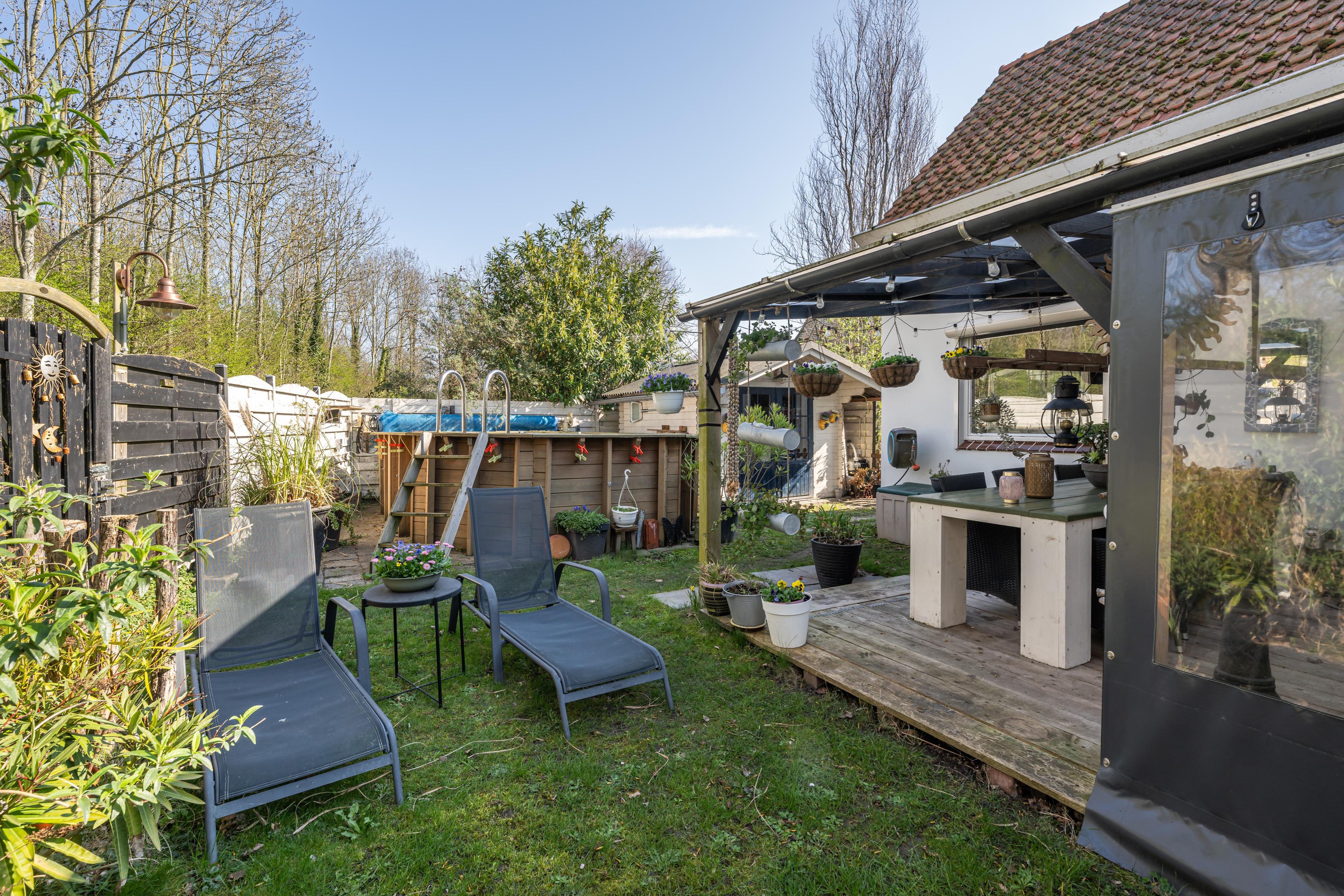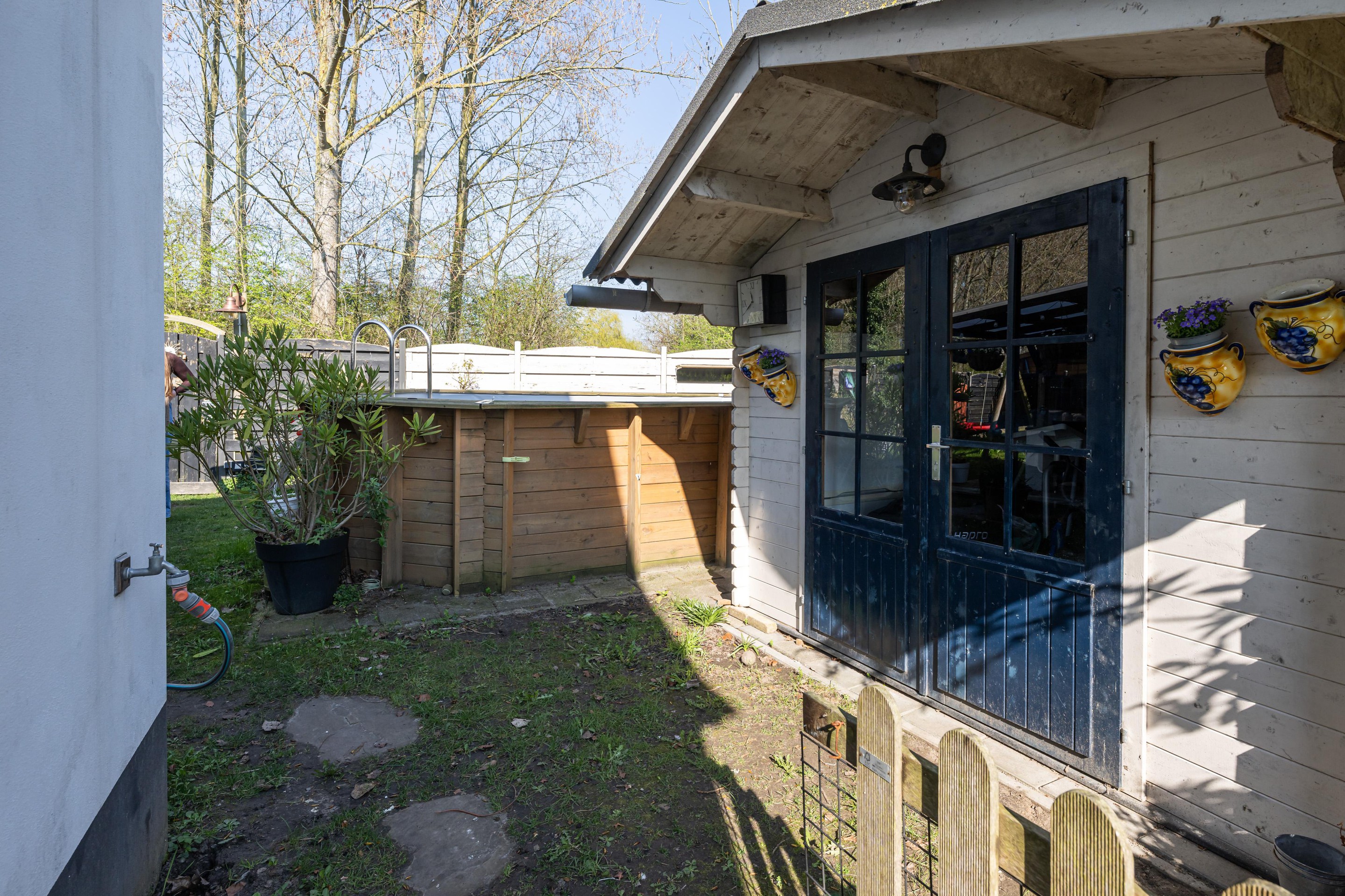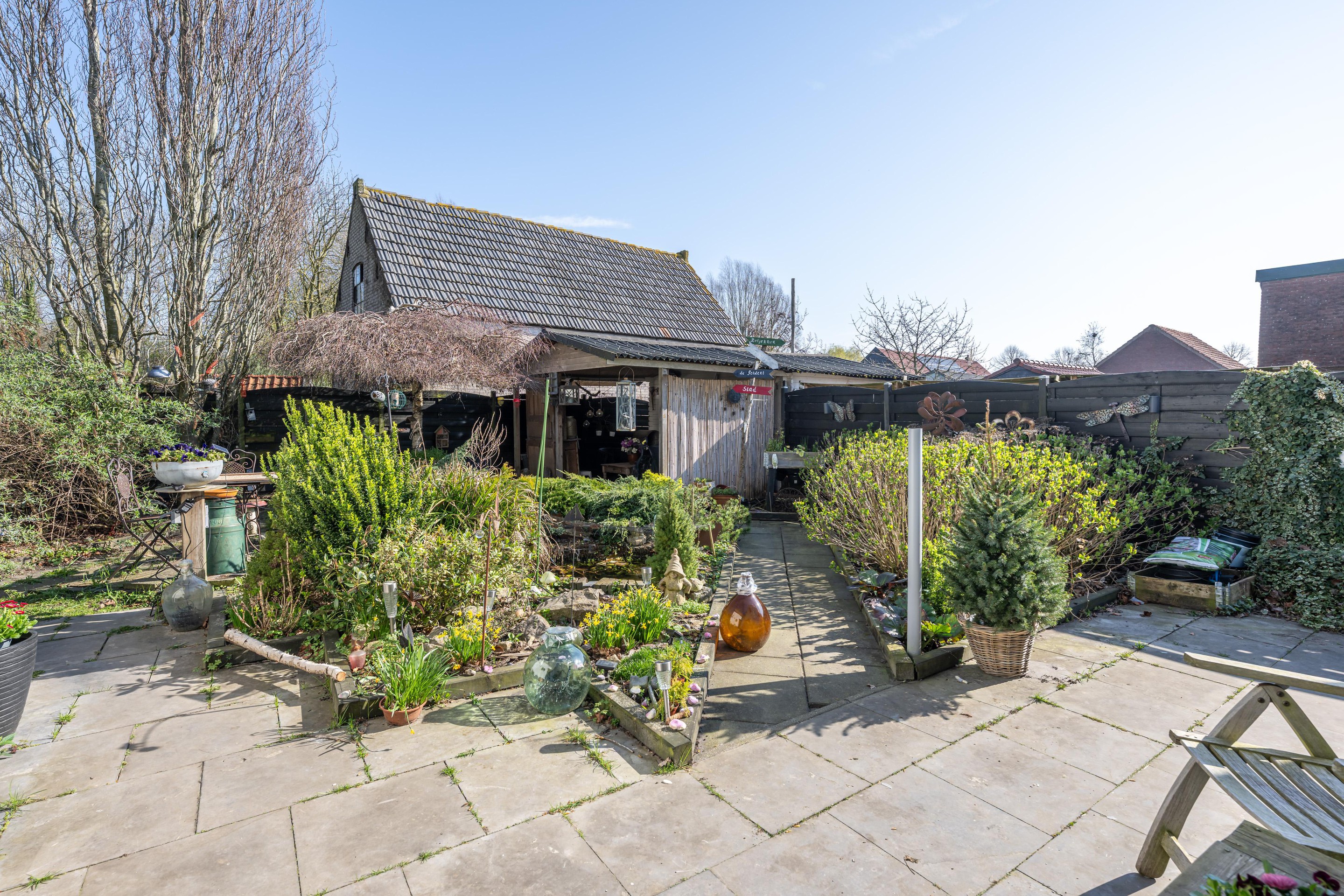 Bestraat, diverse beplanting, eigen achterom, overkapping, houten berging, buitenkraan en zwembad.