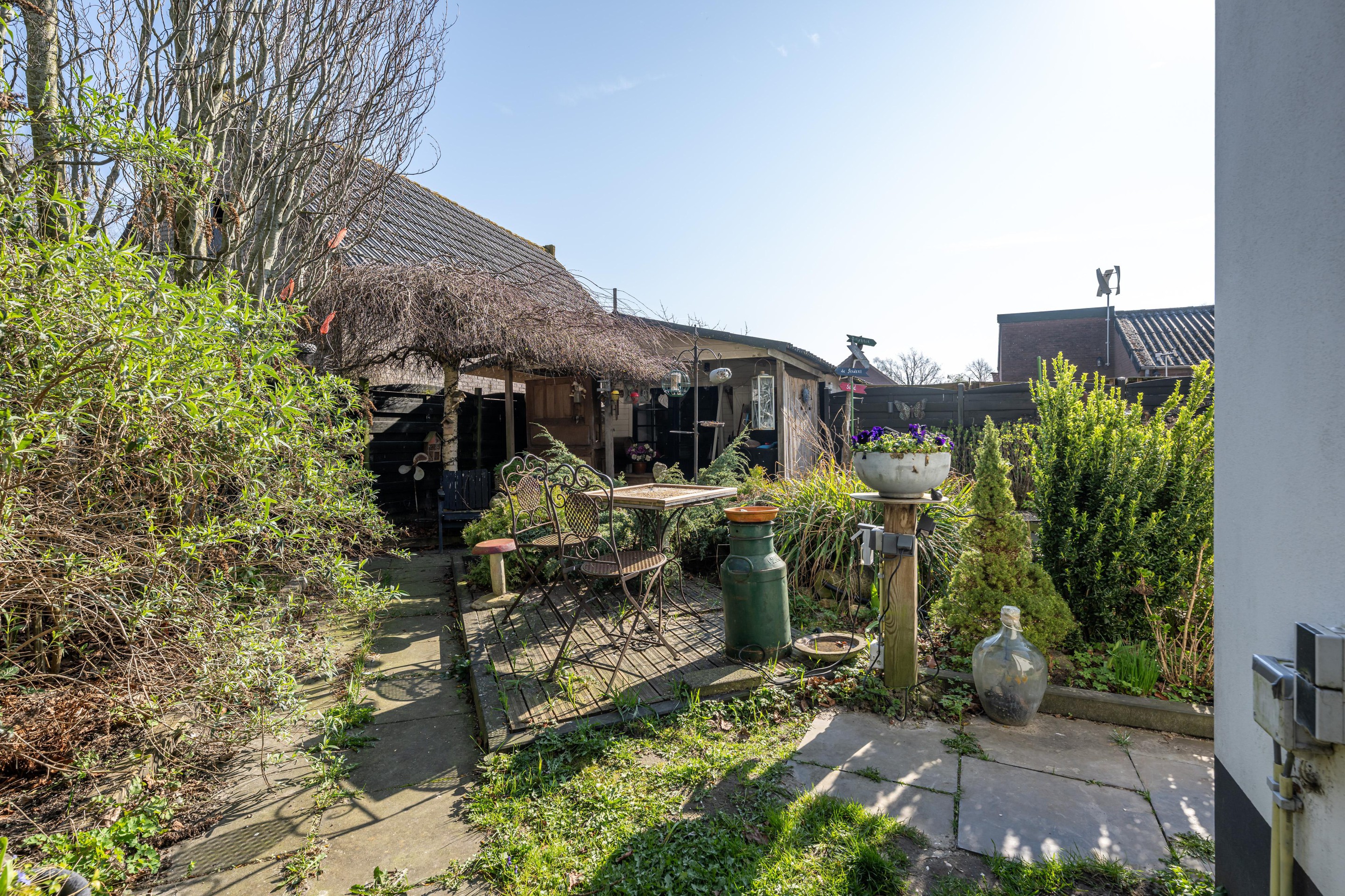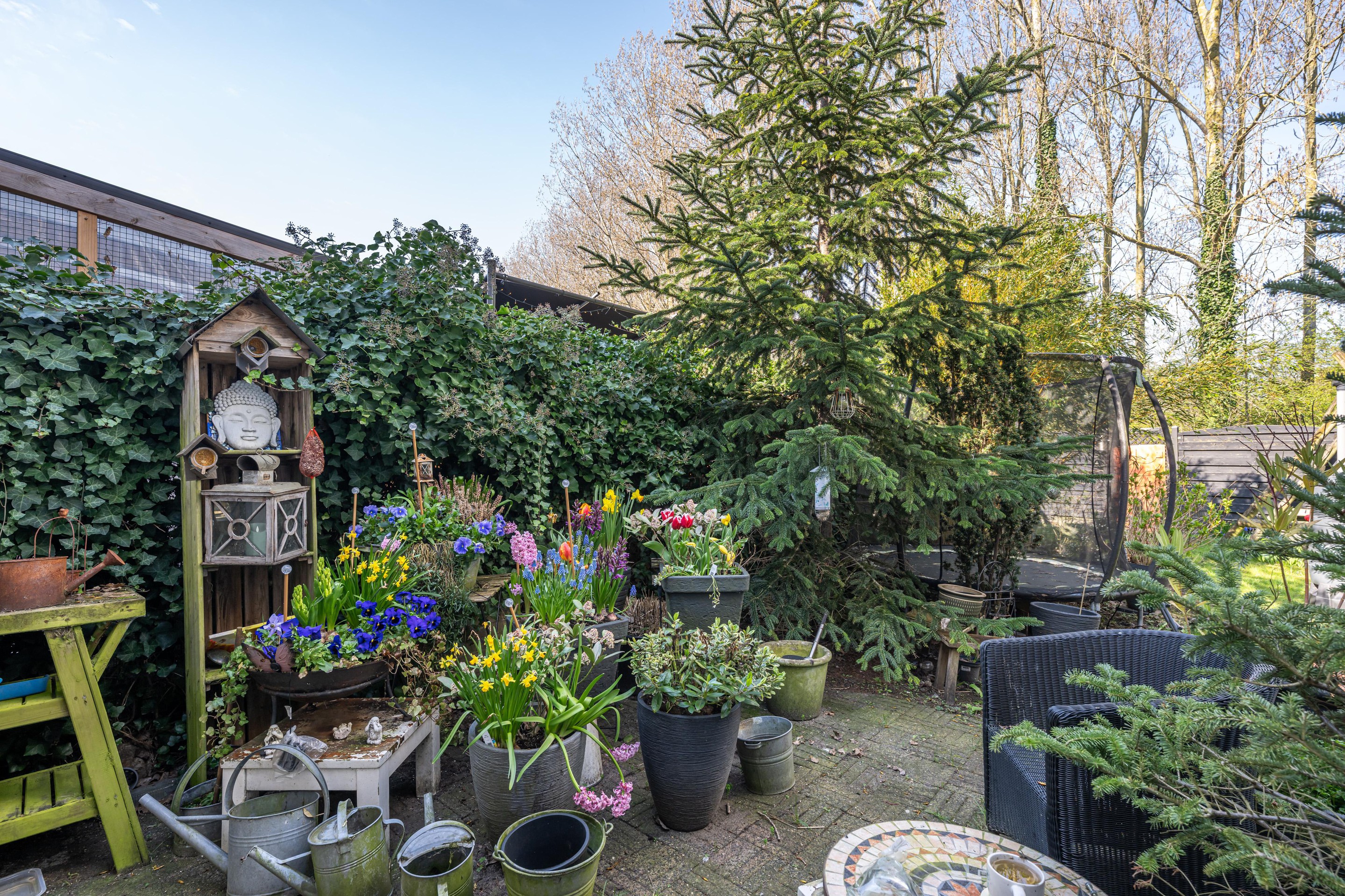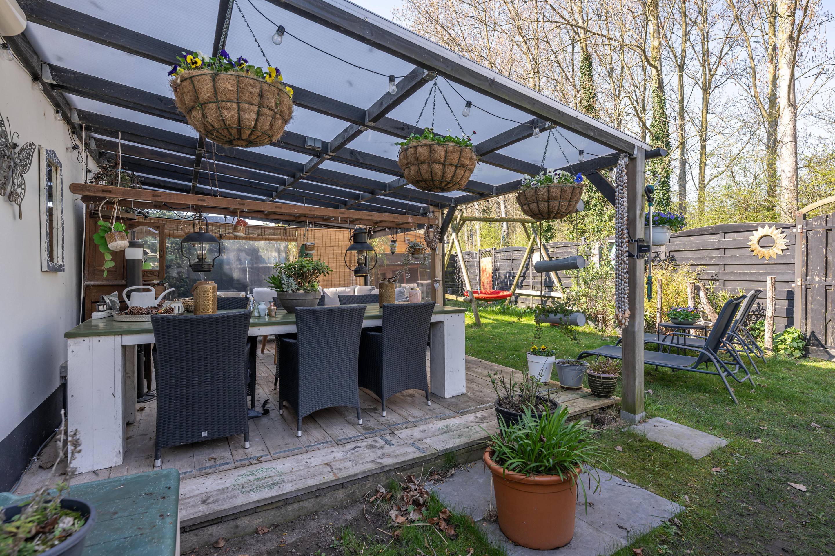 Bestraat, diverse beplanting, eigen achterom, overkapping, houten berging, buitenkraan en zwembad.