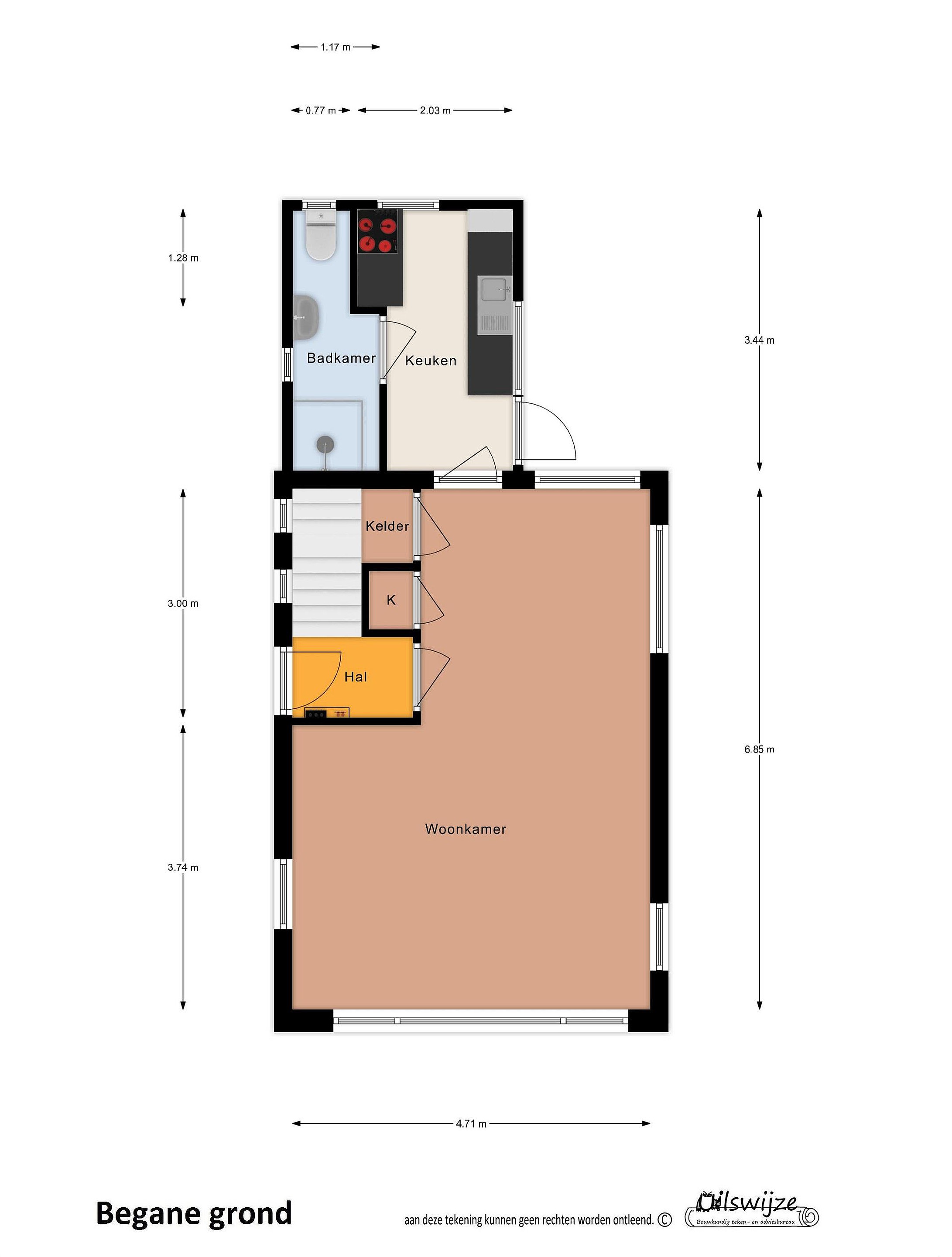 Begane grond Entree/hal, L-vormige woonkamer met vaste kast, kelder, dichte keuken met keukenblok v.v. enig inbouwapparatuur en achterdeur, badkamer v.v. staand toilet, badmeubel en douchecabine.