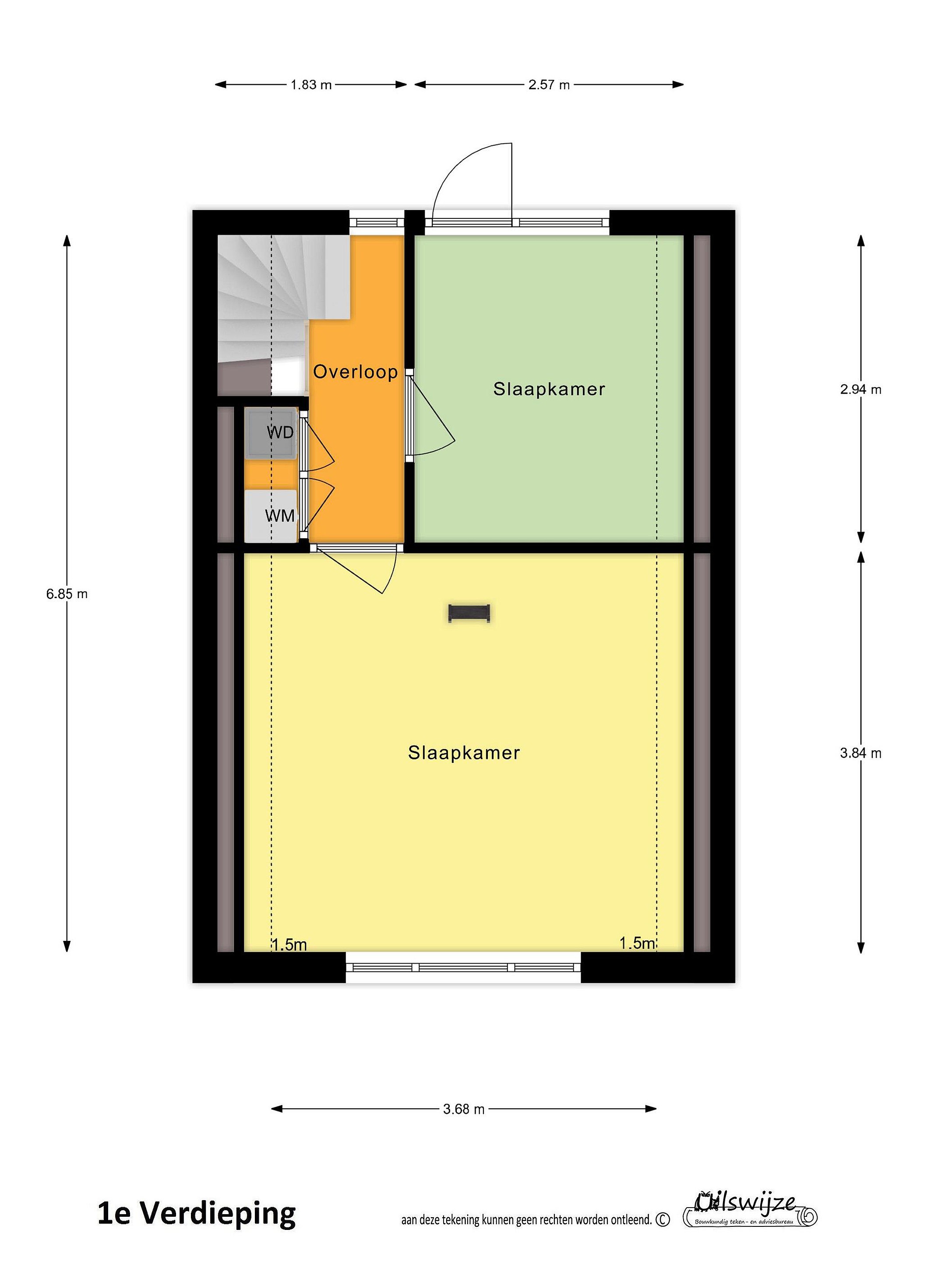 De 1e verdieping beschikt over 2 slaapkamers, waarvan de grootste aan de voorzijde is gesitueerd.