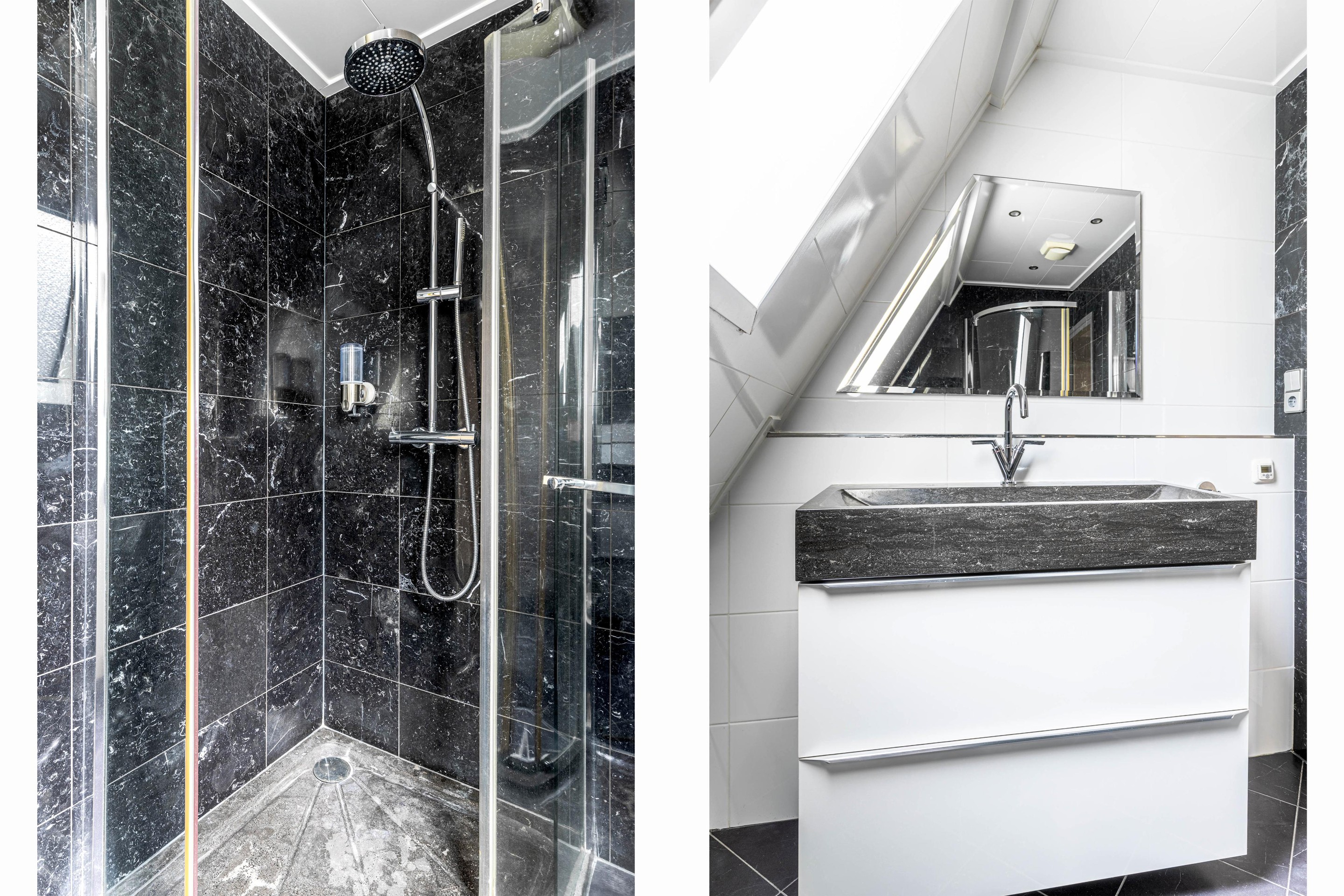 Eerste verdieping Overloop, 3 slaapkamers, badkamer v.v. douchecabine, 2e hangend toilet, badmeubel, elektrische vloerverwarming en dakraam, vaste trap naar de 2e verdieping.