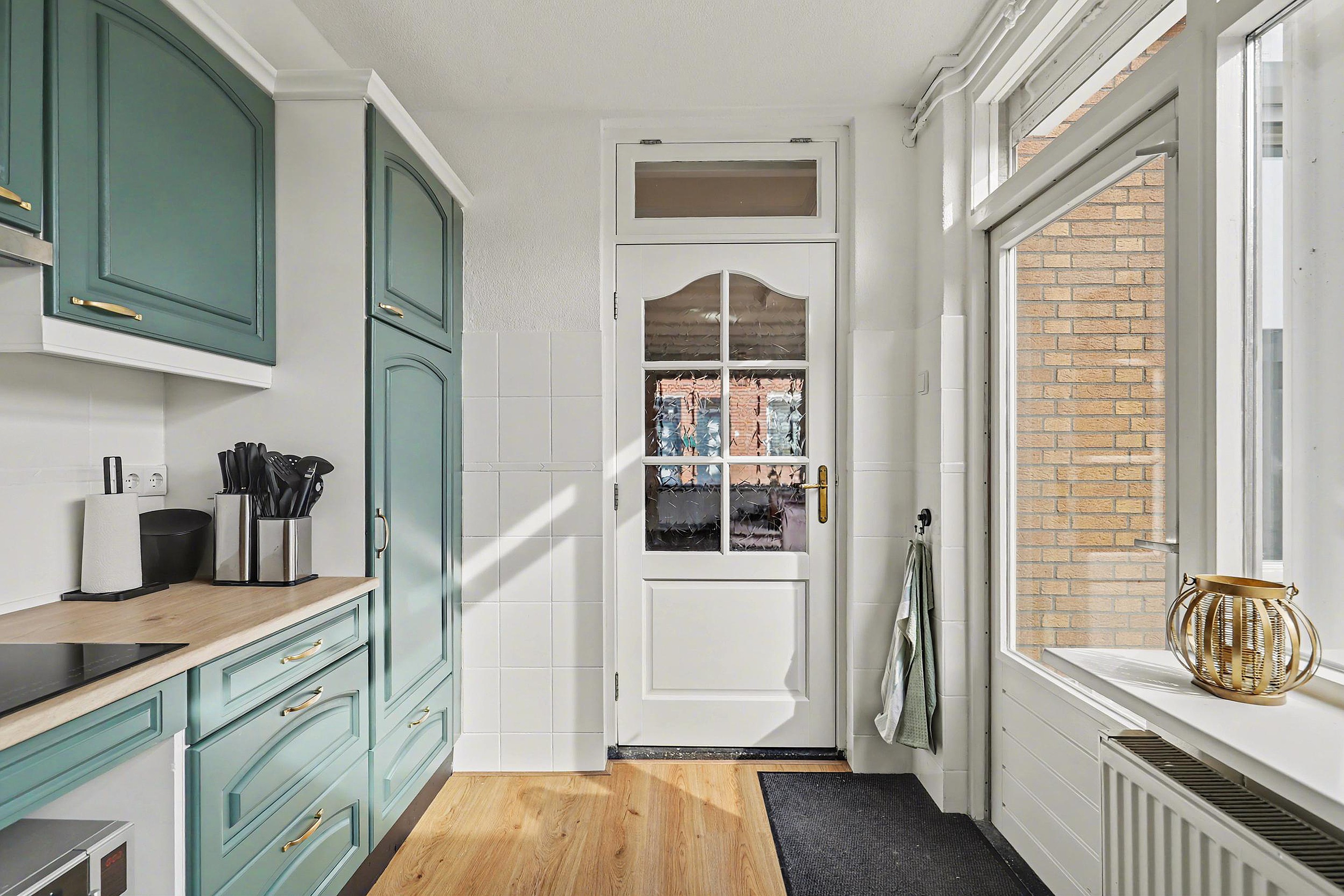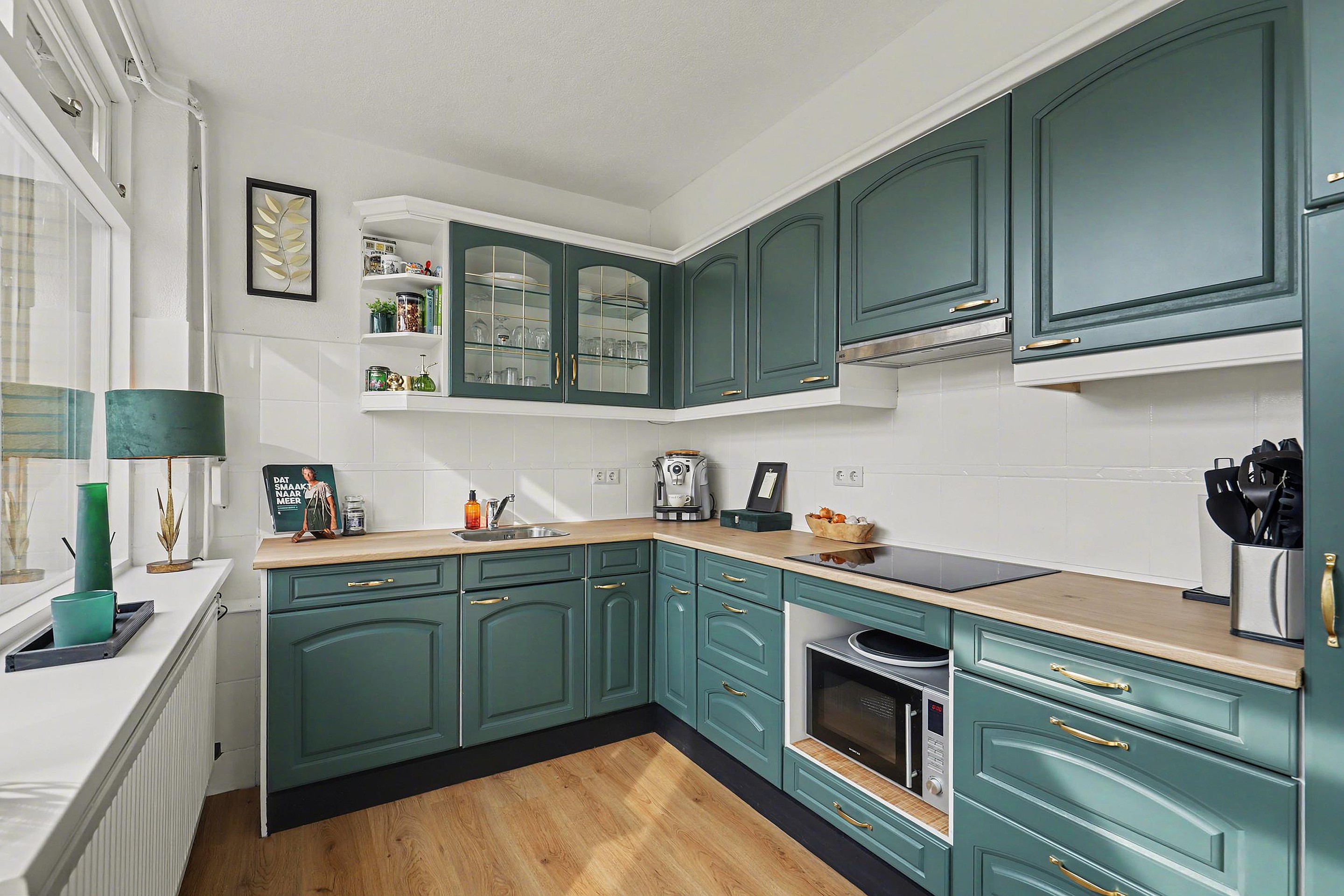 De praktische keuken is functioneel ingericht en voorzien van een inductiekookplaat, vaatwasser, afzuigkap en spoelbak. Vanuit de keuken heeft u directe toegang tot de achtertuin en de royale berging met bijkeuken en doorgang naar de garage.