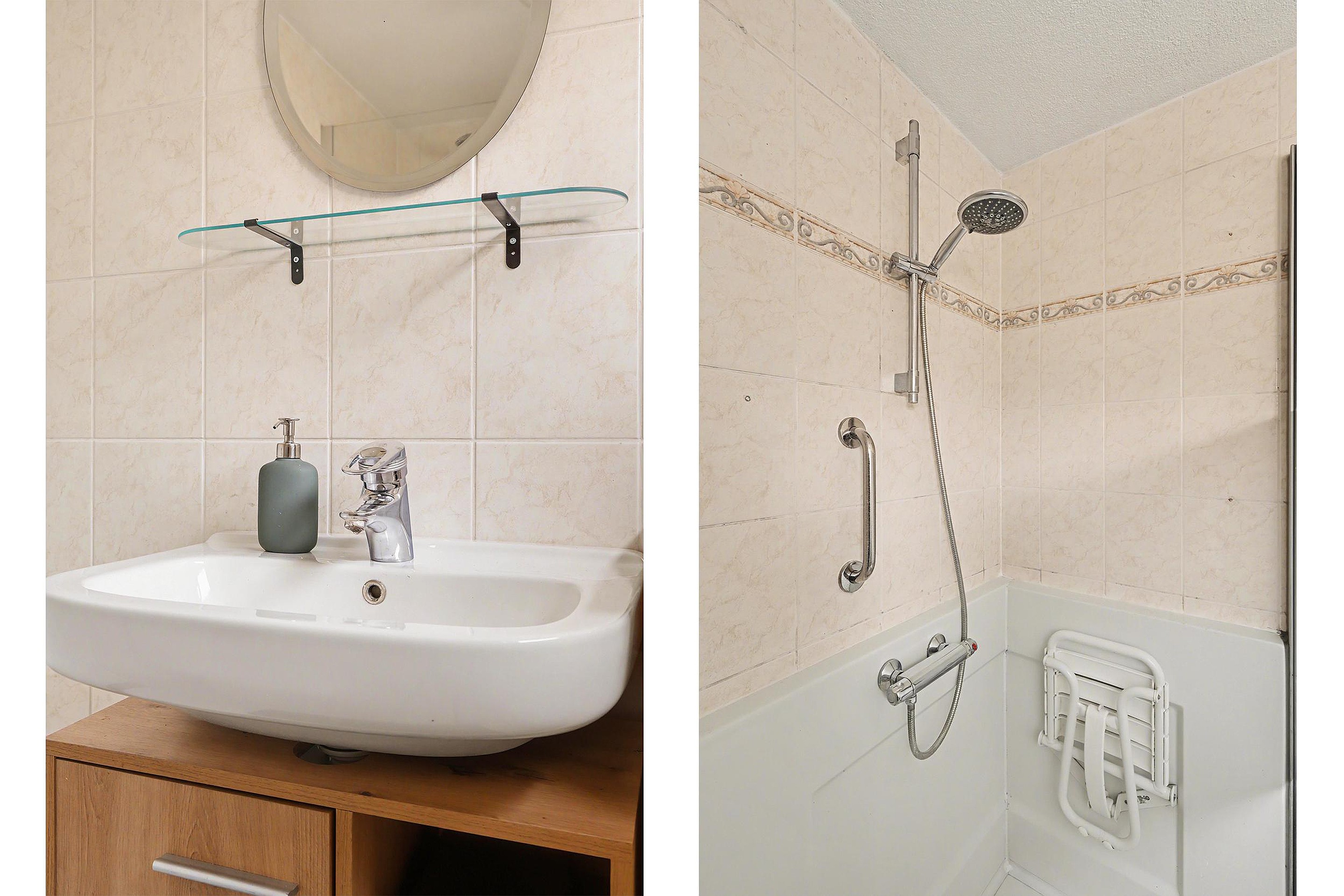 De moderne badkamer is stijlvol afgewerkt en voorzien van een inloopdouche, wastafelmeubel en toilet.