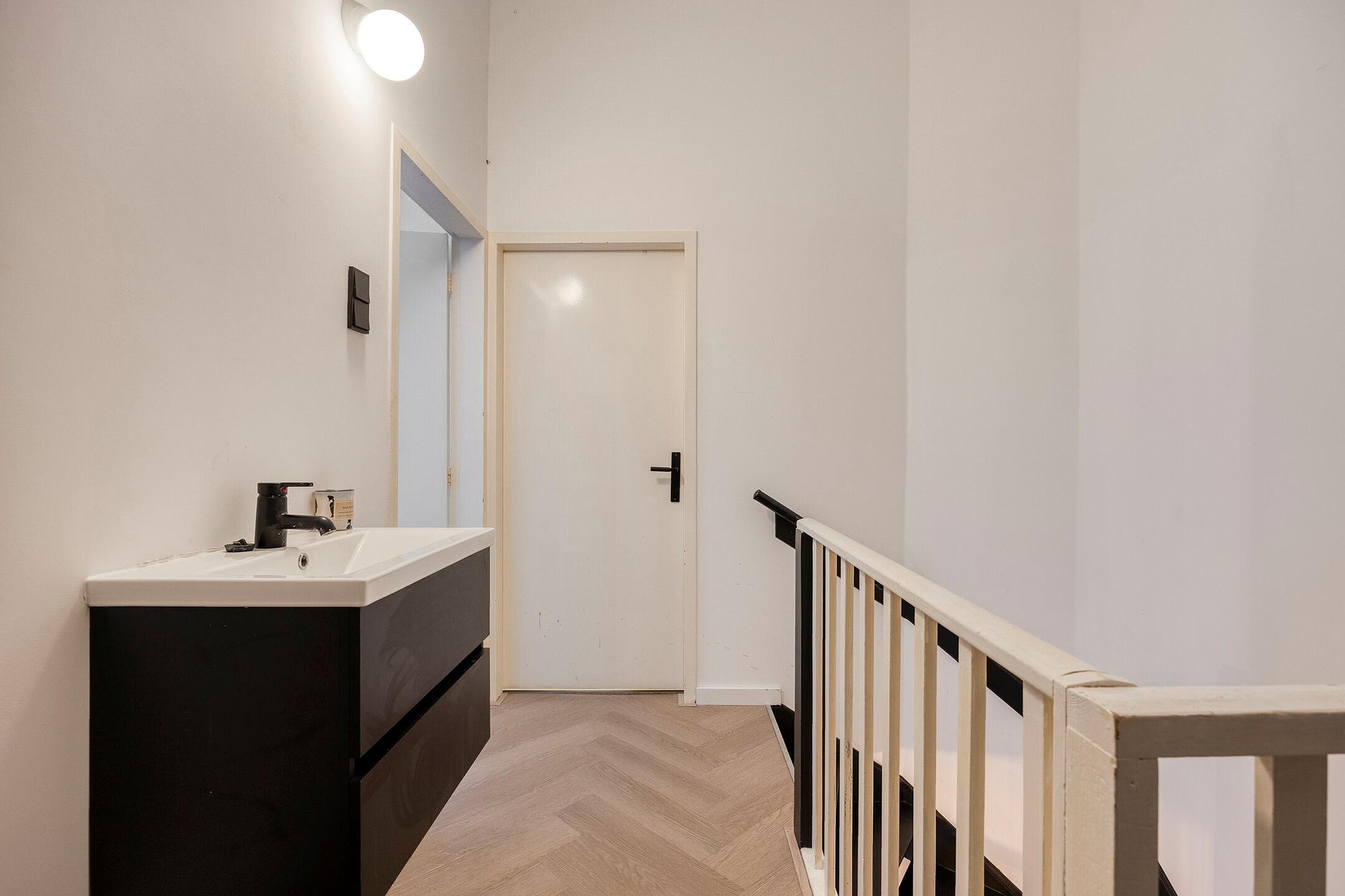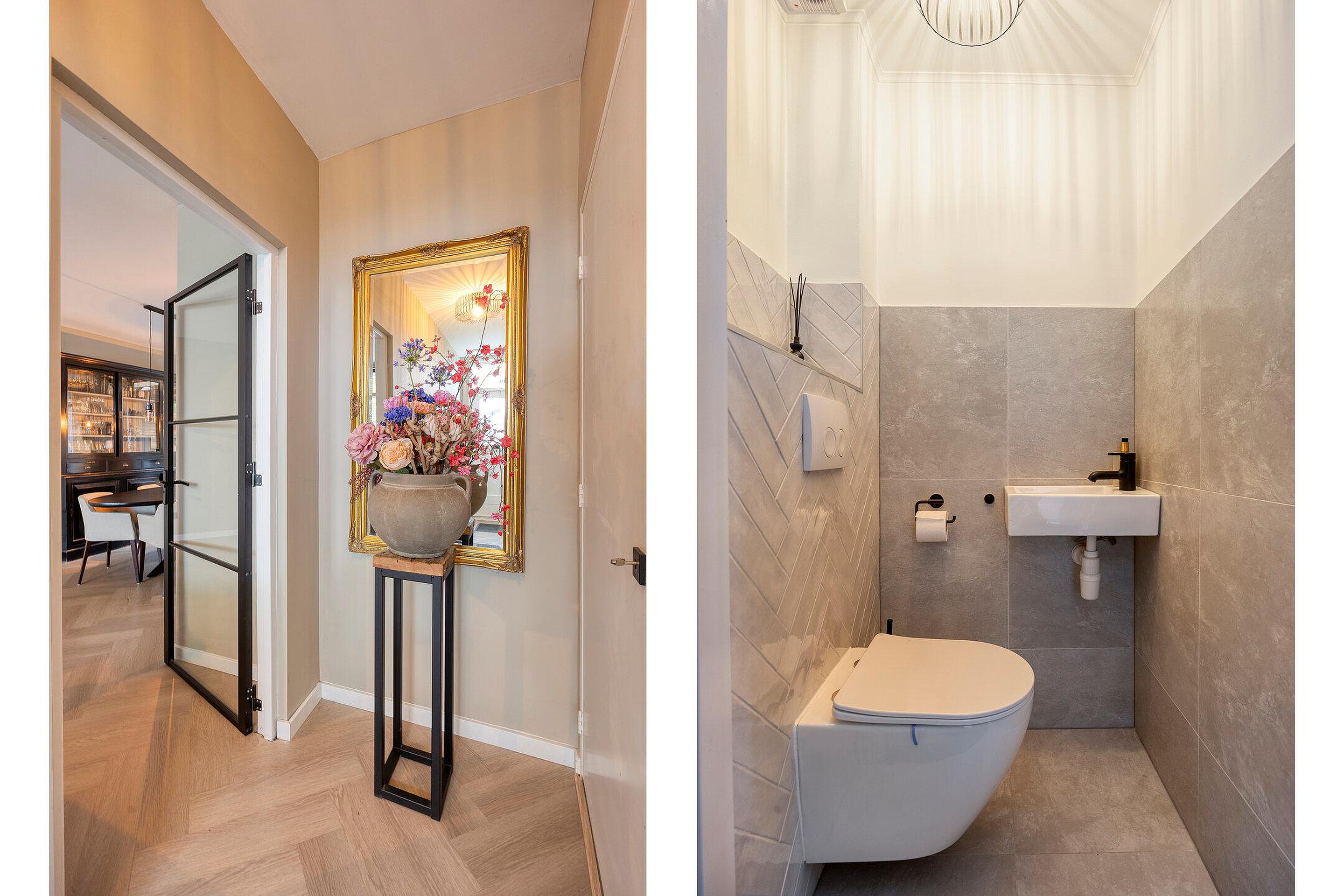 De toiletruimte is in 2023 vernieuwd. De mooie combinatie van tegels, maakt zelfs dit kleine kamertje tot een mooie plek in dit huis. Uiteraard met zwevend toilet en fonteintje. De trapkast is een handige plek voor het opbergen van voorraad en overige spullen.