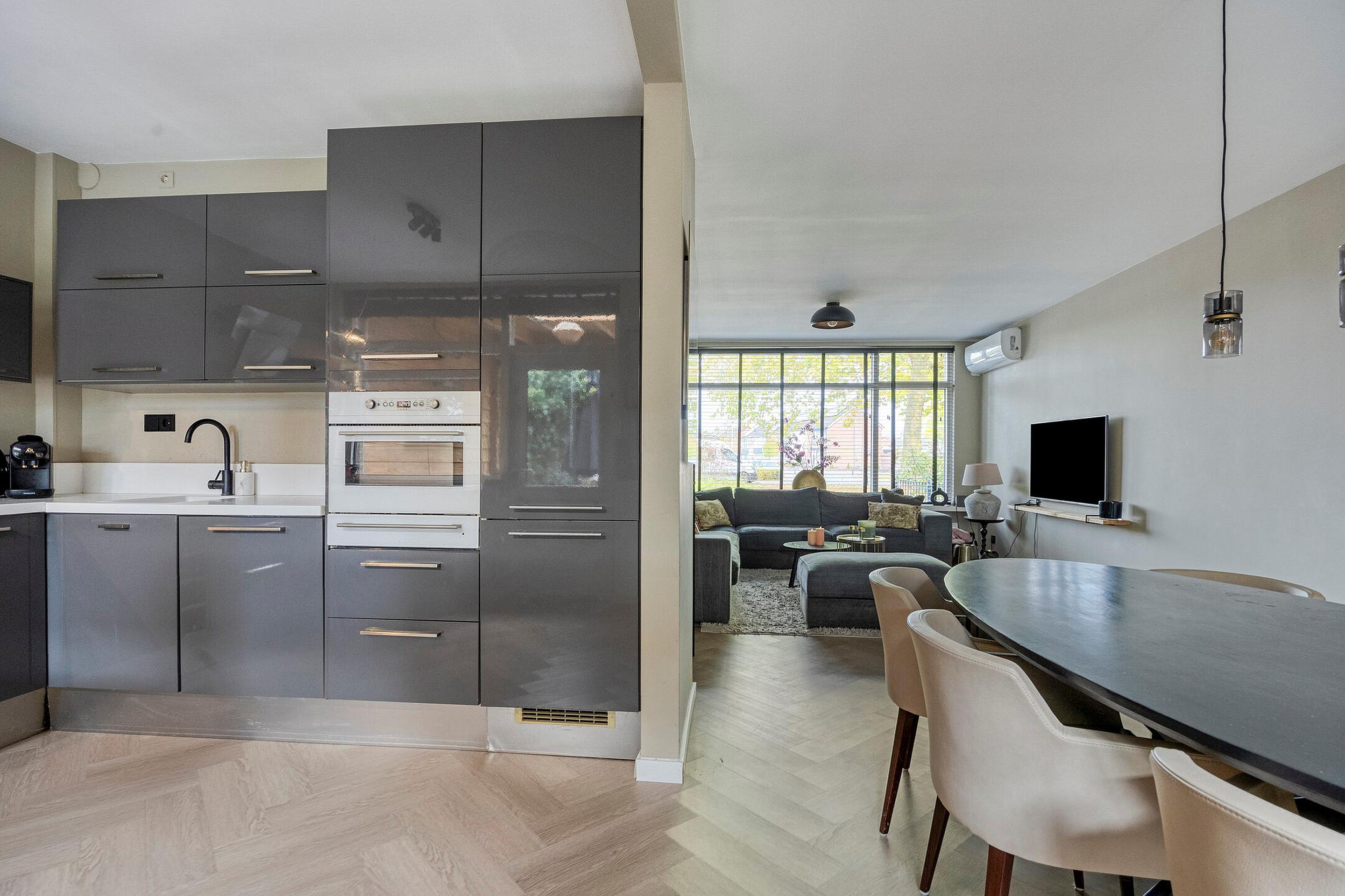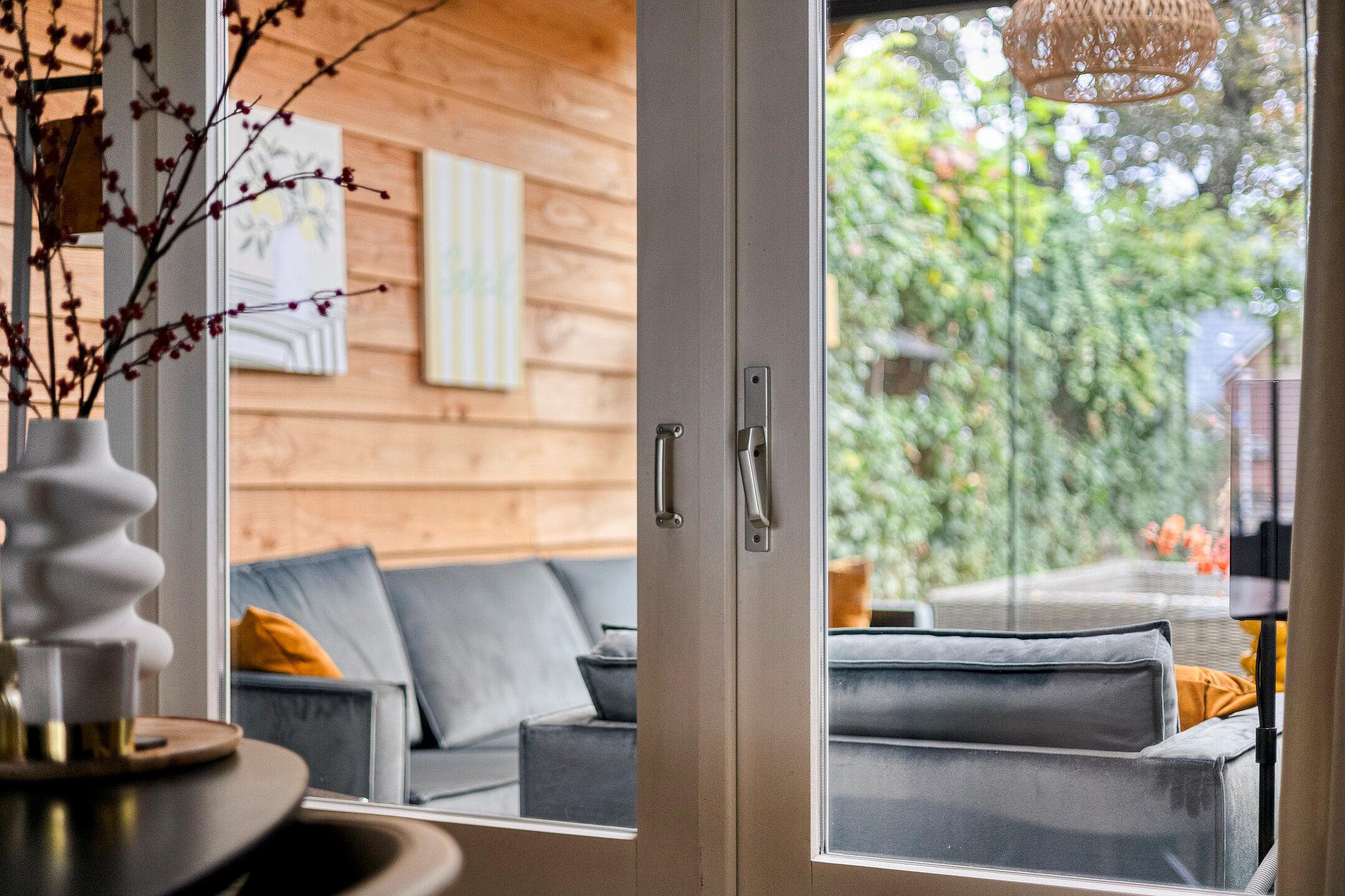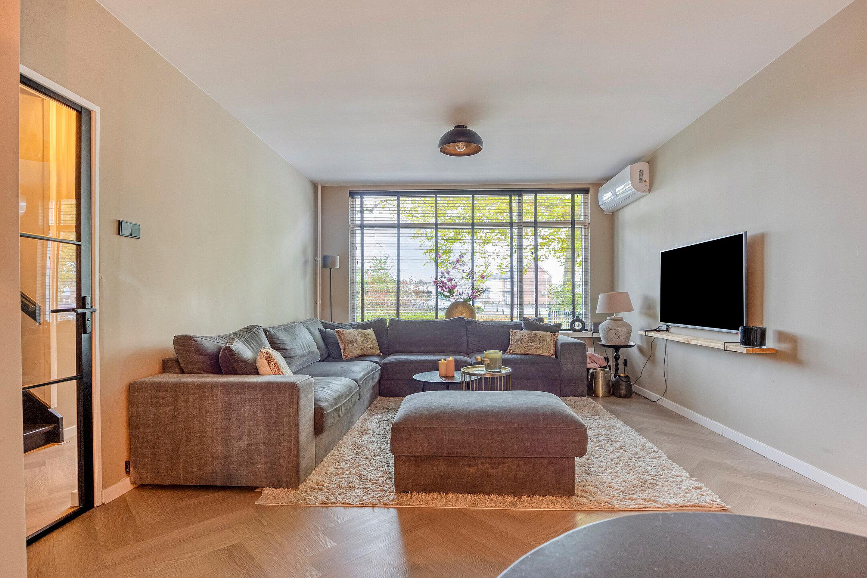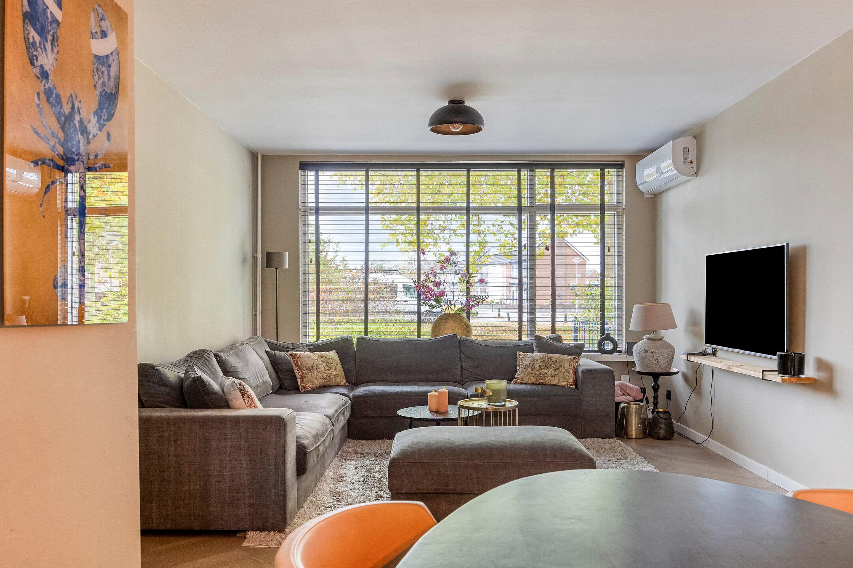 Via een mooie industriële deur, kom je in de woonkamer met aan de voorzijde ruimte voor een grote zithoek. Hier kunnen jullie heerlijke avondjes doorbrengen - met de voetjes omhoog voor de tv - met hele gezin, of lekker met een goed boek en een drankje. De airco (2024) die hier hangt kan koelen en verwarmen.