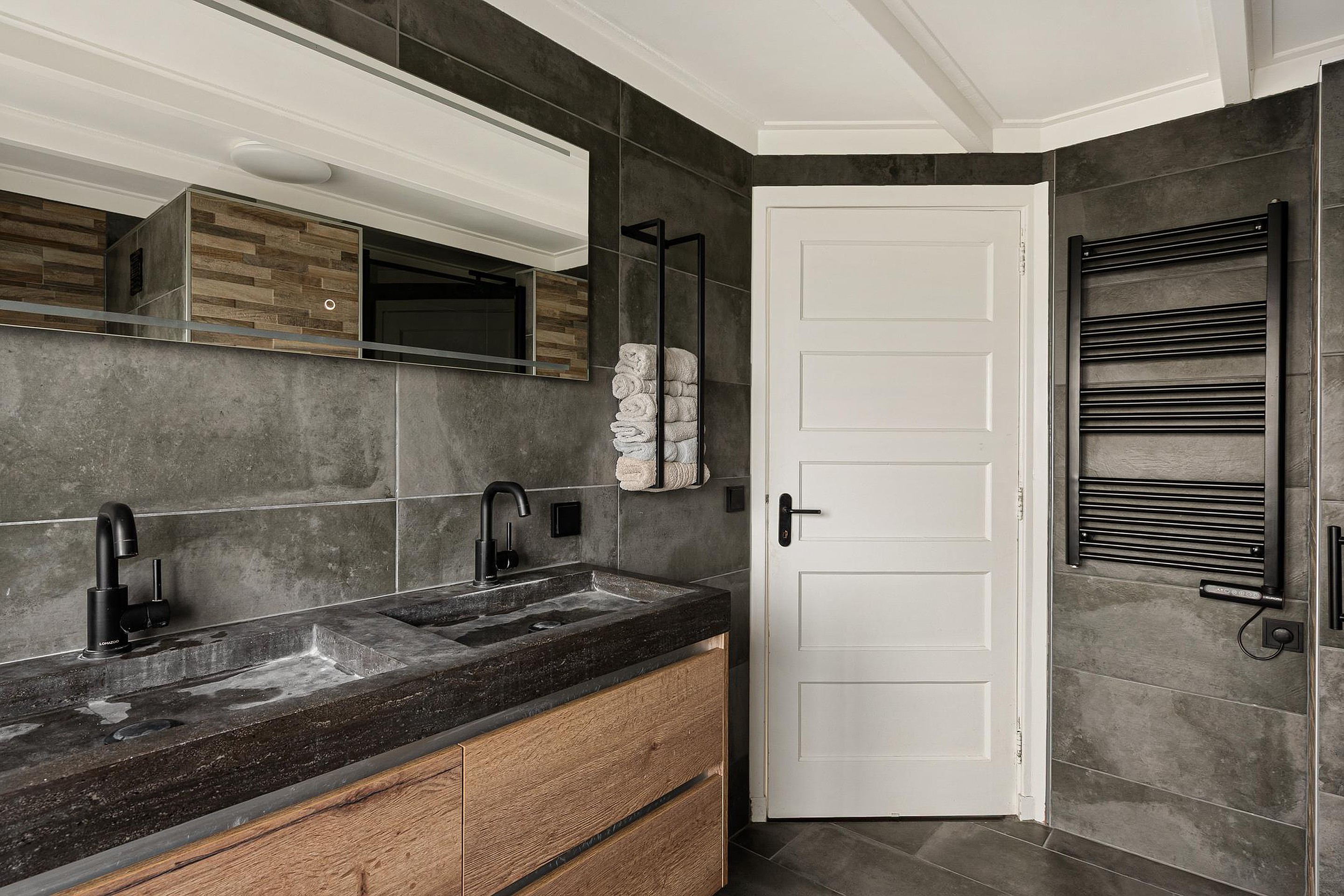 Op de verdieping bevinden zich de 2 royale slaapkamers, allemaal netjes afgewerkt en van goed formaat. De badkamer is modern en luxe uitgevoerd, met een inloopdouche, stijlvol wastafelmeubel en hoogwaardige materialen.